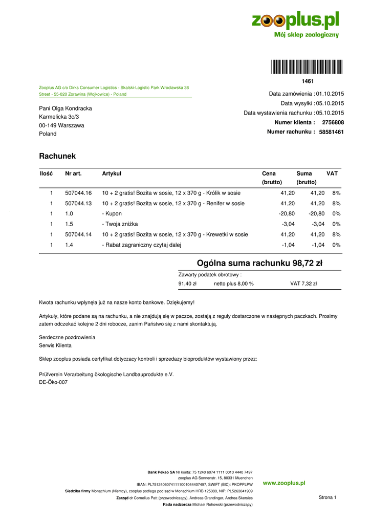 *58581461* 1461 Zooplus AG c/o Dirks Consumer Logistics - Skalski-Logistic Park Wroclawska 36 Data zamówienia : 01.10.2015 Street - 55-020 Zorawina (Wojkowice) - Poland Data wysyłki : 05.10.2015 Pani Olga Kondracka Data wystawienia rachunku : 05.10.2015 Karmelicka 3c/3 Numer klienta : 00-149 Warszawa 2756808 Numer rachunku : 58581461 Poland Rachunek Ilość Nr art. Artykuł Cena Suma (brutto) (brutto) VAT 1 507044.16 10 + 2 gratis! Bozita w sosie, 12 x 370 g - Królik w sosie 41,20 41,20 8% 1 507044.13 10 + 2 gratis! Bozita w sosie, 12 x 370 g - Renifer w sosie 41,20 41,20 8% 1 1.0 - Kupon -20,80 -20,80 0% 1 1.5 - Twoja zniżka -3,04 -3,04 0% 1 507044.14 10 + 2 gratis! Bozita w sosie, 12 x 370 g - Krewetki w sosie 41,20 41,20 8% 1 1.4 - Rabat zagraniczny czytaj dalej -1,04 -1,04 0% Ogólna suma rachunku 98,72 zł Zawarty podatek obrotowy : 91,40 zł netto plus 8,00 % VAT 7,32 zł Kwota rachunku wpłynęła już na nasze konto bankowe. Dziękujemy! Artykuły, które podane są na rachunku, a nie znajdują się w paczce, zostają z reguły dostarczone w następnych paczkach. Prosimy zatem odczekać kolejne 2 dni robocze, zanim Państwo się z nami skontaktują. Serdeczne pozdrowienia Serwis Klienta Sklep zooplus posiada certyfikat dotyczacy kontroli i sprzedazy bioproduktów wystawiony przez: Prüfverein Verarbeitung ökologische Landbauprodukte e.V. DE-Öko-007 Bank Pekao SA Nr konta: 75 1240 6074 1111 0010 4440 7497 zooplus AG Sonnenstr. 15, 80331 Muenchen IBAN: PL75124060741111001044407497, SWIFT (BIC): PKOPPLPW www.zooplus.pl Siedziba firmy Monachium (Niemcy), zooplus podlega pod sąd w Monachium HRB 125080, NIP: PL5263041909 Zarząd dr Cornelius Patt (przewodniczący), Andreas Grandinger, Andrea Skersies Rada nadzorcza Michael Rohowski (przewodniczący) Strona 1 Państwa numer zwrotu Formularz zwrotu Rachunek 58581461 Paczkę odesłać na adres : Zooplus AG c/o Dirks Consumer Logistics !! Prosimy koniecznie wcześniej zażądać od Skalski-Logistic Park Wroclawska 36 Street serwisu klienta! !! 55-020 Zorawina (Wojkowice) www.zooplus.pl/contact Poland Kiedy i jak mogę odesłać produkty? Informacje ogólne Możesz w ciągu 14 dni od otrzymania produktów odesłać wszystkie zakupione artykuły. Szczegółowe informacje na temat prawa odstąpienia od umowy oraz wyłączenia prawa do odstąpienia od umowy znajdziesz w naszym regulaminie : (www.zooplus.pl/content/terms). Aby skorzystać z prawa odstąpienia od umowy należy powiadomić nas o tym fakcie przed upływem okresu karencji. Prosimy w tej sprawie skontaktować się z naszym serwisem klienta. Prosimy odesłać produkty odpowiednio ofrankowane. Koszty przesyłki zostaną niezwłocznie zwrócone, pod warunkiem, że odwołanie zostało skutecznie dostarczone w wymaganym czasie. Zwrot kosztów nastąpi zgodnie z taryfą naszych partnerów: Poczty Polskiej oraz GLS. Koszty dodatkowe, jak np. dodatek expresowy lub dodatek za artykuły nieporęczne, nie mogą zostać zwrócone. W przypadku artykułów nieporęcznych, mających duże rozmiary w stosunku do wagi, oferujemy odbiór tych produktów bezpośrednio u Ciebie w domu. W tej sprawie prosimy o kontakt z serwisem klienta. Zanim odeślesz artykuły, prosimy skontaktować się z naszym serwisem klienta. Prosimy podać numer artykułu, który Krok 1: chcesz odesłać. W zamian otrzymasz od nas indywidualny numer zwrotu. Tylko ten numer gwarantuje prawidłowe przyporządkowanie do Twojego konta klienta. internet : www.zooplus.pl/contact Krok 2: Nasz Serwis Klienta odpowie na wszelkie pytania i pomoże wypełnić formularz. Krok 3: Prosimy włożyć dokument zwrotu łącznie z numerem do odpowiednio ofrankowanej paczki i odesłać na adres: Zooplus AG c/o Dirks Consumer Logistics, Skalski-Logistic Park Wroclawska 36 Street , 55-020 Zorawina (Wojkowice) , Poland Prosimy zaznaczyć, który artykuł/które artykuły chcą Państwo zwrócić i jaki jest powód zwrotu. Numer artykułu Ilość Artykuł nie Pomyłka przy Nieprawidłowy artykuł Zepsuty Artykuł pasuje zamawianiu dostarczony artykuł niekompletny Inne Co możemy dla Państwa zrobić, po tym jak otrzymaliśmy odesłany przez Państwa artykuł? Proszę o przesłanie mi następujących artykułów: Numer artykułu : ___________________ Ilość :___________________ Proszę zwrócić uwagę, że przelew zwrotny może być dokonany tylko i wyłącznie na to konto, z którego otrzymaliśmy płatność za zamówienie. Proszę pomniejszyć sumę rachunku o kwotę ____________________ zł Bank Pekao SA Nr konta: 75 1240 6074 1111 0010 4440 7497 zooplus AG Sonnenstr. 15, 80331 Muenchen IBAN: PL75124060741111001044407497, SWIFT (BIC): PKOPPLPW www.zooplus.pl Siedziba firmy Monachium (Niemcy), zooplus podlega pod sąd w Monachium HRB 125080, NIP: PL5263041909 Zarząd dr Cornelius Patt (przewodniczący), Andreas Grandinger, Andrea Skersies Rada nadzorcza Michael Rohowski (przewodniczący) Strona 2