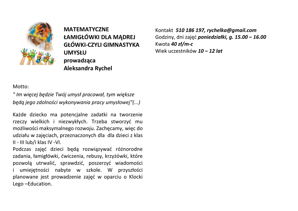MATEMATYCZNE ŁAMIGŁÓWKI DLA MĄDREJ GŁÓWKI-CZYLI GIMNASTYKA UMYSŁU prowadząca Aleksandra Rychel Motto: " Im więcej będzie Twój umysł pracował, tym większe będą jego zdolności wykonywania pracy umysłowej"(...) Każde dziecko ma potencjalne zadatki na tworzenie rzeczy wielkich i niezwykłych. Trzeba stworzyć mu możliwości maksymalnego rozwoju. Zachęcamy, więc do udziału w zajęciach, przeznaczonych dla dla dzieci z klas II - III lub/i klas IV -VI. Podczas zajęć dzieci będą rozwiązywać różnorodne zadania, łamigłówki, ćwiczenia, rebusy, krzyżówki, które pozwolą utrwalić, sprawdzić, poszerzyć wiadomości i umiejętności nabyte w szkole. W przyszłości planowane jest prowadzenie zajęć w oparciu o Klocki Lego –Education. Kontakt 510 186 197, [email protected] Godziny, dni zajęć poniedziałki, g. 15.00 – 16.00 Kwota 40 zł/m-c Wiek uczestników 10 – 12 lat W PRACOWNI prowadząca Monika Kula Motto: Istniejemy po to, aby tworzyć i tworzymy po to, aby istnieć. Rozbudzanie i rozwijanie wrażliwości estetycznej dziecka oraz jego indywidualnych zdolności twórczych, Pobudzanie kreatywności , odkrywanie przyjemności tworzenia, cieszenie się uzyskanym efektem. Rozwijanie zmysłu estetyki i potrzeby tworzenia. Rozwijanie kreatywności, zdolności wyobrażania, wymyślania i produkowania czegoś nowego, oryginalnego. Rozwijanie możliwości innowacyjnych poprzez wynajdywanie różnych rozwiązań dotyczących tego samego tematu. Zapoznanie z różnymi technikami i obserwowanie uzyskanych efektów. Posługiwanie się niekonwencjonalnymi materiałami jako środkiem wyrazu. Zapoznanie z kształtem, kolorem i bryłą poprzez twórcze zabawy. Rozwijanie wyobraźni pobudzonej pozytywnymi emocjami. Promowanie prac i ich autorów poprzez uczestnictwo w konkursach plastycznych i wystawach. Przedstawianie zjawisk, wydarzeń realnych i fantastycznych z uwzględnieniem postaci ludzi i zwierząt. Przedstawianie scen inspirowanych przez przeżycia, pory roku, teksty literackie za pomocą określonych środków wyrazu z zachowaniem kształtu, wielkości, proporcji, barwy. Przedstawianie zjawisk i wydarzeń realnych i fantastycznych z uwzględnieniem postaci ludzi i zwierząt. Przedstawianie scen inspirowanych przez przeżycia pory roku, teksty literackie za pomocą określonych środków wyrazu z zachowaniem kształtu, wielkości, proporcji, barwy. Wyrażanie emocji poprzez tworzenie Krytyczny osąd wytworów plastycznych Tworzenie sztuki użytkowej Umiejętność współpracy w grupie Uczestnictwo w warsztatach z tradycyjnych technik graficznych Zapoznanie się z zasobami Muzeum w Rogalinie, wzięcie udziału w lekcji muzealnej i plener w ogrodzie. Umiejętność organizowania ekspozycji swoich prac Kontakt 502 393 838 Godziny, dni zajęć poniedziałki i środy, g. 17.00 – 18.30 Kwota 40 zł/m-c Wiek uczestników bez ograniczeń ZABAWY Z MUZYKĄ prowadząca Grażyna Pawełka Drogi rodzicu jeżeli Twoje dziecko ma 4-6 lat, a Ty widzisz, że lubi: - ruszać się, - śpiewać, - tańczyć - eksperymentować z dźwiękiem, - szaleć i śmiać się do rozpuku to zapraszamy! Nasze muzykowanie jest cykliczne, co tydzień 45 minut! Gwarantujemy, że Wasz Skarb będzie: - wybawiony, - uśmiechnięty, - spełniony, - zrelaksowany, - czyli szczęśliwy mały człowiek!!! Kontakt 504 726 944 Godziny, dni zajęć poniedziałki, g. 14.30 – 15.30 Kwota 40 zł/m-c Wiek uczestników 4 – 6 lat ZAJĘCIA KULINARNE prowadząca Justyna Zawieja To zajęcia dla dzieci, które lubią „rządzić” w kuchni: lubią smakować, eksperymentować – po prostu kochają gotować dla siebie i innych. Nauczą się w praktyce zasad zdrowego odżywiania, poznają nowe smaki i jak je łączyć. Kontakt 608 233 369 Godziny, dni zajęć poniedziałki, g. 16.00 Kwota 40 zł/m-c Wiek uczestników od 8lat ZAJĘCIA SZACHOWE prowadzący Paweł Witwicki Oferujemy lekcje królewskiej gry, które stanowią uzupełnienie rozwoju intelektualnego dzieci. Dlaczego warto poznać zasady "królewskiej gry"? ponieważ: - uczy samodzielności myślenia, czyli kreatywności i odpowiedzialności za swoje decyzje, ćwiczy i rozwija wyobraźnię przestrzenną, kształtuje pamięć wzrokową, - uczy analizowania sytuacji i logicznego myślenia, - rozwija takie cechy, jak: opanowanie, koncentracja, determinacja, cierpliwość, wytrwałość, odwaga, - uczy radzenia sobie ze stresem i działania pod presją, kształtuje wolę walki i zwycięstwa, - uczy zasad fair play i szacunku do przeciwnika. Szachy pozwalają osiągać sukcesy sportowe także osobom mniej sprawnym fizycznie. Naszymi wychowankami są medaliści Mistrzostw Polski Juniorów Wioletta Sobierska i Kacper Tomaszewski. Kontakt 508 578 954, [email protected] Godziny, dni zajęć czwartki, g. 16.15 – 18.00 Kwota 25 zł/m-c Wiek uczestników od 5 lat ZAJĘCIA WOKALNE prowadząca Mirka Kochanowska Zajęcia przeznaczone są dla dzieci i młodzieży chcącej rozwijać swoje talenty wokalne, poprzez indywidualne spotkania z instruktorem. Zajęcia takie są kompleksowym ujęciem wszelkich zagadnień związanych z piosenką, począwszy od nauki śpiewu i interpretacji, przez odpowiedni dobór repertuaru do konkretnej osoby, jej umiejętności, wrażliwości i temperamentu, co pozwala w pełni wykorzystać potencjał wokalny tkwiący w młodym wykonawcy. Spotkania trwają 30 minut i odbywają się raz w tygodniu. Kontakt 604 690 650 Godziny, dni zajęć czwartki, od g. 14.30 Kwota 60 zł/m-c Wiek uczestników od 6 lat ZAJĘCIA Z KODOWANIA – PROGRAMOWANIA prowadząca Beata Zawisła Wiek uczestników: 8 – 12 lat W trakcie zajęć uczestnicy będą tworzyć własne gry, animacje i programy. Programowanie to świetna zabawa, która rozwija kreatywność, umiejętność analitycznego myślenia i rozwiązywania złożonych problemów. Wspomaga proces uczenia się i jest alternatywą do „odtwórczego” korzystania z komputera. Każdy może i powinien progr