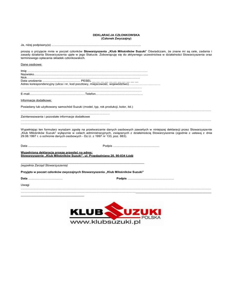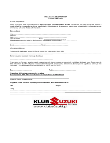 DEKLARACJA CZŁONKOWSKA (Członek Zwyczajny) Ja, niżej podpisany(a) ........................................................................................................ proszę o przyjęcie mnie w poczet członków Stowarzyszenia „Klub Miłośników Suzuki” Oświadczam, że znane mi są cele, zadania i zasady działania Stowarzyszenia ujęte w jego Statucie. Zobowiązuję się do aktywnego uczestnictwa w działalności Stowarzyszenia oraz terminowego opłacania składek członkowskich. Dane osobowe: Imię ............................................................................................................................................ Nazwisko..................................................................................................................................... Nick.................................................................................................................................... Data urodzenia ............................................ PESEL __ __ __ __ __ __ __ __ __ __ __ Adres korespondencyjny (ulica i nr, kod pocztowy, miejscowość, województwo)………………….……… ……...................................................................................................................................... ............................................................................................................................................. E-mail.................................................................Telefon....................................................... Informacje dodatkowe: Posiadany lub użytkowany samochód Suzuki (model, typ, rok produkcji, kolor, itd.) .............................................................................................................................................................................................................................. ........................................................................................................ Zainteresowania i pozostałe informacje dodatkowe .............................................................................................................................................................................................................................. ........................................................................................................ Wypełniając ten formularz wyrażam zgodę na przetwarzanie danych osobowych zawartych w niniejszej deklaracji przez Stowarzyszenie „Klub Miłośników Suzuki” wyłącznie w celach administracyjnych, związanych z działalnością Stowarzyszenia (zgodnie z ustawą z dnia 29.08.1997 r. o ochronie danych osobowych - Dz.U. z 1997 nr 133, poz. 883). Data ............................................. Podpis ...................................................... Wypełnioną deklarację proszę przesłać na adres: Stowarzyszenie „Klub Miłośników Suzuki”, ul. Przędzalniana 20, 90-034 Łódź ________________________________________________________________________ (wypełnia Zarząd Stowarzyszenia) Przyjęto w poczet członków zwyczajnych Stowarzyszenia „Klub Miłośników Suzuki” Data ........................................ Podpis ...................................................... Uwagi .............................................................................................................................................................................................................................. ......................................................................................................................................____________________________________________ _____________________________________