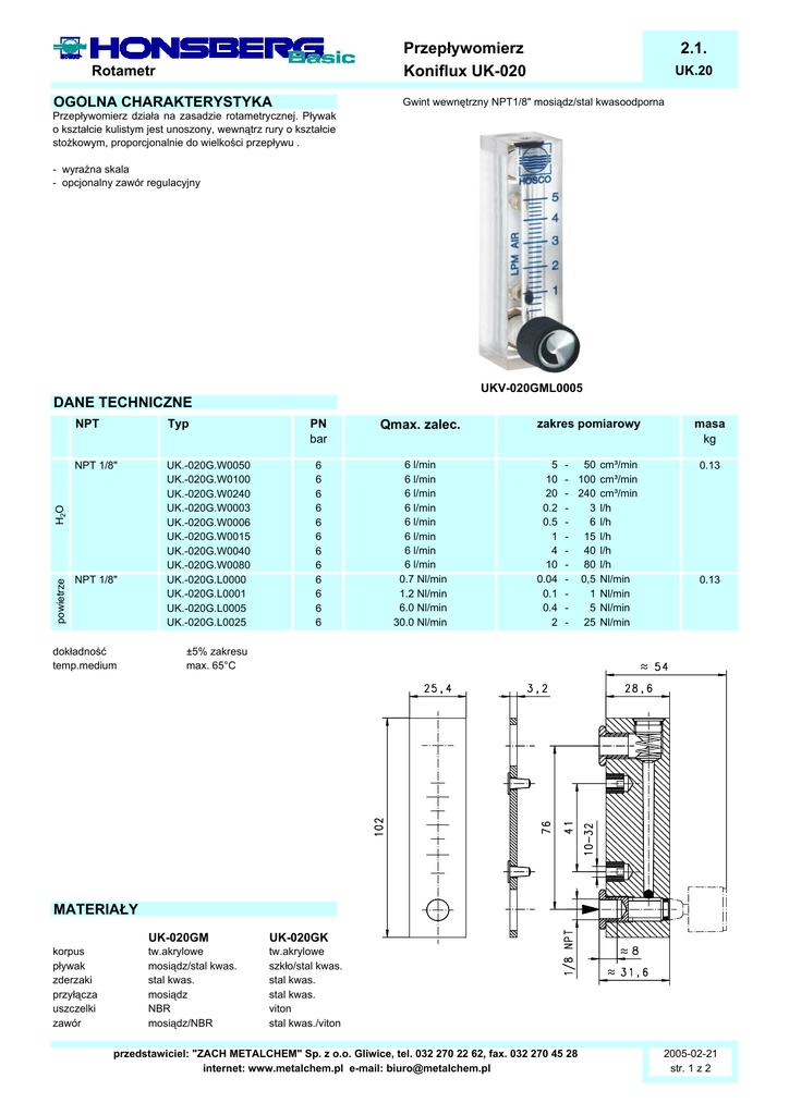 Przepływomierz Koniflux UK-020 Rotametr OGÓLNA CHARAKTERYSTYKA 2.1. UK.20 Gwint wewnętrzny NPT1/8" mosiądz/stal kwasoodporna Przepływomierz działa na zasadzie rotametrycznej. Pływak o kształcie kulistym jest unoszony, wewnątrz rury o kształcie stożkowym, proporcjonalnie do wielkości przepływu . - wyraźna skala - opcjonalny zawór regulacyjny UKV-020GML0005 DANE TECHNICZNE Typ NPT 1/8" UK.-020G.W0050 UK.-020G.W0100 UK.-020G.W0240 UK.-020G.W0003 UK.-020G.W0006 UK.-020G.W0015 UK.-020G.W0040 UK.-020G.W0080 UK.-020G.L0000 UK.-020G.L0001 UK.-020G.L0005 UK.-020G.L0025 powietrze H2O NPT NPT 1/8" dokładność temp.medium PN bar Qmax. zalec. 6 6 6 6 6 6 6 6 6 6 6 6 6 l/min 6 l/min 6 l/min 6 l/min 6 l/min 6 l/min 6 l/min 6 l/min 0.7 Nl/min 1.2 Nl/min 6.0 Nl/min 30.0 Nl/min zakres pomiarowy 5 10 20 0.2 0.5 1 4 10 0.04 0.1 0.4 2 - 50 cm³/min - 100 cm³/min - 240 cm³/min 3 l/h 6 l/h - 15 l/h - 40 l/h - 80 l/h - 0,5 Nl/min 1 Nl/min 5 Nl/min - 25 Nl/min masa kg 0.13 0.13 ±5% zakresu max. 65°C MATERIAŁY korpus pływak zderzaki przyłącza uszczelki zawór UK-020GM UK-020GK tw.akrylowe mosiądz/stal kwas. stal kwas. mosiądz NBR mosiądz/NBR tw.akrylowe szkło/stal kwas. stal kwas. stal kwas. viton stal kwas./viton przedstawiciel: "ZACH METALCHEM" Sp. z o.o. Gliwice, tel. 032 270 22 62, fax. 032 270 45 28 internet: www.metalchem.pl e-mail: [email protected] 2005-02-21 str. 1 z 2 Przepływomierz Koniflux UK-020 Rotametr 2.1. UK.20 PARAMETRY ELEKTRYCZNE Brak części elektrycznych POZYCJA MONTAŻOWA MEDIA woda gaz/powietrze OZNACZENIA G M W0050 UKUKV020 G M K W0050 W0100 W0240 W0003 W0006 W0015 W0040 W0080 L0000 L0001 L0005 L0025 Opcja specjalna VARIO z z z z z z z z z z z z z z z z z z zakres pomiarowy H2O 020 zakres pomiar. powietrze UK- Możliwe kombinajcje - patrz "dane techniczne" typ podstawowy specyfikacja przepływomierz przepływomoierz z zaworem seria 020 , NPT 1/8" gwint wewnętrzny mosiądz stal kwasoodporna 5 50 cm³/min 10 - 100 cm³/min 20 - 240 cm³/min 0.2 3 l/h 0.5 6 l/h 1 15 l/h 4 40 l/h 10 80 l/h 0.04 0.5 Nl/min 0.1 1 Nl/min 0.4 5 Nl/min 2.0 25 Nl/min uszczelnienie Viton specjalna skala DANE NIEZBĘDNE PRZY ZAMÓWIENIU - Dla gazów podać ciśnienie ( zaznaczyć : względne lub absolutne ), temperaturę i rodzaj gazu , ( na życzenie specjalny zakres ) Zastrzega się prawo do zmian technicznych zBASIC Standard BASIC Opcja programowa VARIO Opcja specjalna ⊕ PLUS Wyposażenie przedstawiciel: "ZACH METALCHEM" Sp. z o.o. Gliwice, tel. 032 270 22 62, fax. 032 270 45 28 internet: www.metalchem.pl e-mail: [email protected] nie zalecane 2005-02-21 str. 2 z 2