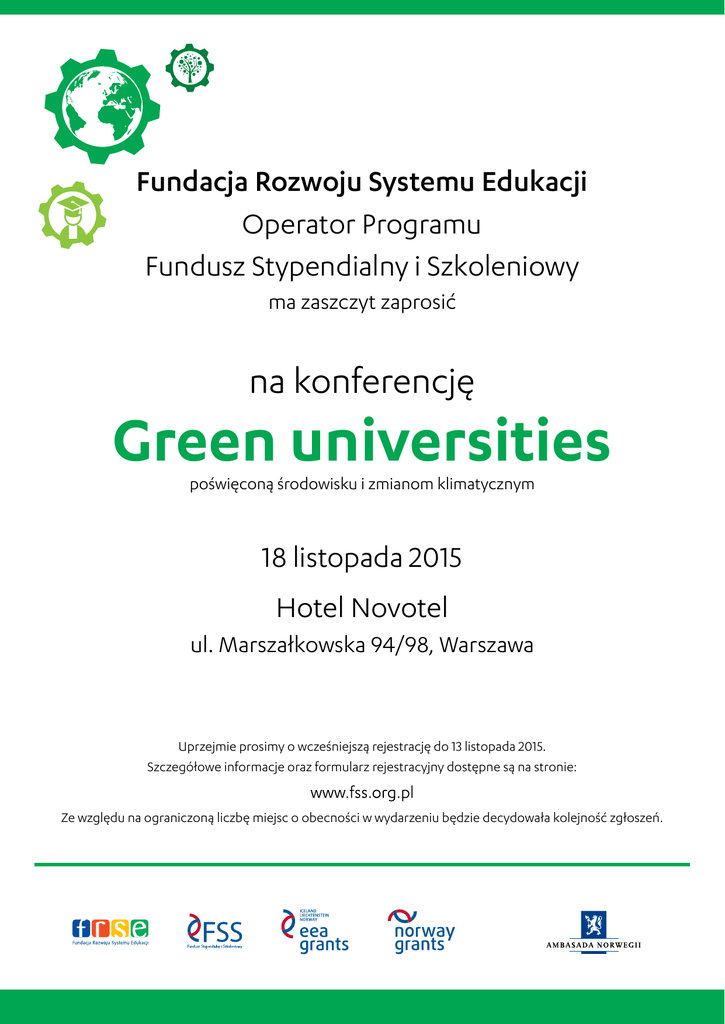 Fundacja Rozwoju Systemu Edukacji Operator Programu Fundusz Stypendialny i Szkoleniowy ma zaszczyt zaprosić na konferencję Green universities poświęconą środowisku i zmianom klimatycznym 18 listopada 2015 Hotel Novotel ul. Marszałkowska 94/98, Warszawa Uprzejmie prosimy o wcześniejszą rejestrację do 13 listopada 2015. Szczegółowe informacje oraz formularz rejestracyjny dostępne są na stronie: Ze względu na ograniczoną liczbę miejsc o obecności w wydarzeniu będzie decydowała kolejność zgłoszeń.