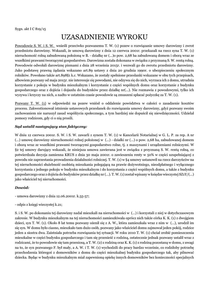 Sygn. akt I C 819/15 UZASADNIENIE WYROKU Powodowie S. W. i S. W. wnieśli przeciwko pozwanemu T. W. (1) pozew o rozwiązanie umowy darowizny i zwrot przedmiotu darowizny. Wskazali, że umową darowizny z dnia 12 czerwca 2001r. przekazali na rzecz syna T. W. (1) nieruchomość rolną zabudowaną położoną w B. - działkę nr (...)o pow. 2,68 ha zabudowaną domem i oborą wraz ze wszelkimi prawami tworzącymi gospodarstwo. Darowizna została dokonana w związku z przyznaną S. W. rentą rolną. Powodowie odwołali darowiznę pismami z dnia 28 września 2015r. i wezwali go do zwrotu przedmiotu darowizny. Jako podstawę prawną żądania wskazano art.89 ustawy z dnia 20 grudnia 1990r. o ubezpieczeniu społecznym rolników. Powołano także art.898§1 k.c. Wskazano, że zostały spełnione przesłanki wskazane w obu tych przepisach, albowiem pozwany od maja 2015r. nie interesuje się powodami, nie odzywa się do nich, wyrzuca ich z domu, utrudnia korzystanie z pokoju w budynku mieszkalnym i korzystanie z części wspólnych domu oraz korzystanie z budynku gospodarczego oraz z dojścia i dojazdu do budynków przez działkę nr(...). Nie rozmawia z powodowymi, tylko ich wyzywa i krzyczy na nich, a nadto w ostatnim czasie powodowie są zmuszeni spłacać pożyczkę za T. W. (1). Pozwany T. W. (1) w odpowiedzi na pozew wniósł o oddalenie powództwa w całości o zasadzenie kosztów procesu. Zakwestionował istnienie ustawowych przesłanek do rozwiązania umowy darowizny, gdyż pozwany swoim zachowaniem nie naruszył zasad współżycia społecznego, a tym bardziej nie dopuścił się niewdzięczności. Udzielał pomocy rodzicom, gdy ci o nią prosili. Sąd ustalił następujący stan faktyczny: W dniu 12 czerwca 2001r. S. W. i S. W. zawarli z synem T. W. (1) w Kancelarii Notarialnej w G. L. P. za rep. A nr (...) umowę darowizny nieruchomości rolnej położonej w (...) - działki nr (...) o pow. 2,68 ha, zabudowanej domem i oborą wraz ze wszelkimi prawami tworzącymi gospodarstwo rolne, tj. z maszynami i urządzeniami rolniczymi. W §2 tej umowy darujący wskazali, że niniejsza umowa zawierana jest w związku z przyznaną S. W. rentą rolną, co potwierdzała decyzja zamienna KRUS z dnia 30 maja 2001r. o zawieszeniu renty w 50% w części uzupełniającej z powodu nie zaprzestania prowadzenia działalności rolniczej. T. W. (1) w §4 umowy ustanowił na rzecz darczyńców na tej nieruchomości służebność osobistą mieszkania polegającą na prawie dożywotniego, nieodpłatnego i wyłącznego korzystania z jednego pokoju w budynku mieszkalnym i do korzystania z części wspólnych domu, a także z budynku gospodarczego oraz z dojścia do budynków przez działkę nr (...). T. W. (1) został wpisany w księdze wieczystej SZ1Y/(...) jako właściciel tej nieruchomości. Dowód: - umowa darowizny z dnia 12.06.2001r. k.55-57; - odpis z księgi wieczystej k.21; S. i S. W. po dokonaniu tej darowizny nadal mieszkali na nieruchomości w (...) i korzystali z niej w dotychczasowym zakresie. W budynku mieszkalnym na tej nieruchomości zamieszkiwała oprócz nich także córka K. K. (1) z dwojgiem dzieci, syn T. W. (1). Około 8 lat temu pozwany ożenił się z A. W., która zamieszkała wraz z nim w (...), urodził im się syn. W domu było ciasno, mieszkało tam dużo osób, pozwany jako właściciel domu zajmował jeden pokój, rodzice jeden a siostra dwa. Zaistniała potrzeba rozwiązania tej sytuacji. W roku 2010 T. W. (1) chciał zrobić pomieszczenia mieszkalne w części budynku gospodarczego i tam się przenieść z rodziną, ostatecznie jednak pozwany ustalił wraz z rodzicami, że to powodowie się tam przeniosą, a T. W. (2) z rodziną oraz K. K. (1) z rodziną pozostaną w domu, z uwagi na to, że syn pozwanego F. był mały, a A. W. i T. W. (1) wychodzili do pracy bardzo wcześnie, co rodziłoby potrzebę przechodzenia któregoś z domowników z domu do części mieszkalnej budynku gospodarczego tak, aby pilnować dziecka. Będąc w budynku mieszkalnym miał zapewnioną opiekę innych domowników bez konieczności specjalnych działań. Powodowie przystali na to. Pozwany pomagał im w przystosowaniu budynku gospodarczego do warunków mieszkalnych, brał w tym udział także brat powoda. Relacje rodzinne rodziny W. były dość burzliwe, dochodziło tam często do krzyków, potyczek słownych, ostrej wymiany zdań i kumulacji emocji, pomiędzy wszystkimi członkami tej rodziny. Decydujący głos w sprawach zasadniczych mieli nadal rodzice, T. W. (1) jako właściciel nieruchomości nie miał większych praw niż pozostali, oprócz obowiązku ponoszenia kosztów nieruchomości. Powodowie dokładali się do rachunków za dom, natomiast siostra K. K. (1) nie, pomimo faktu, że przez cały czas mieszkała tam ze swoją rodziną. S. W. nadal prowadził gospodarstwo rolne, z udziałem T. W. (1), na tym tle nie dochodziło do sporów, gdyż warunki glebowe ograniczały możliwości uprawy. Powodowie nie akceptowali synowej A. W., zarzucali jej min. złe traktowanie dzieci, zazdrość o męża. Uważali, że nie pozwala ona T. W. (1) na czynności mające na celu pomoc powodom i wprowadza zamieszanie w rodzinie. T. W. (1) słuchał się żony. T. W. (1) pomagał rodzicom i siostrze K. K. (1), woził ich samochodem do lekarzy, na zakupy, do miasta, czasem robił zakupy. Powodowie pomagali T. W. (1) w opiece nad jego dwoma synami, wnuki lubiły być u dziadków. Dowód: - częściowo zeznania świadka K. K. (1) k.135-136; - zeznania świadka J. D. k.136-138; - zeznania świadka A. W. k.147-150; - przesłuchanie powoda S. W. k. 151-156; - przesłuchanie powoda S. W. k. 156-159 - przesłuchanie pozwanego T. W. (1) k. 173-175; Stosunki pomiędzy powodami a pozwanym pogorszyły się znacznie w 2015r. kiedy A. W. i K. K. (1) zaczęły pracę w D.. K. K. (1) nie szło dobrze w tej pracy, nie przedłużono z nią umowy po listopadzie 2014., a A. W. została. Ta sytuacja zawodowa obu pań spowodowała i