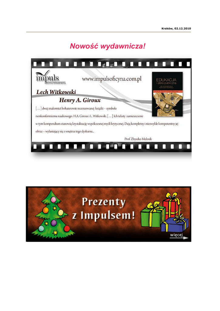 Kraków, 02.12.2010 Nowość wydawnicza! Przedstawiamy Państwu naszą najnowszą książkę: Krystyna Bęczkowska Współczesna powieść dla dzieci i młodzieży po roku 1990 Przedmiotem rozprawy Współczesna powieść dla dzieci i młodzieży po roku 1990 są tematy, problemy, bohaterowie, wartości w powieściach : społeczno – obyczajowych, powieściach dla dziewcząt, powieściach fantastycznych, powieściach psychologicznych dla dzieci i młodzieży oraz dorosłych. Monografia zawiera siedem rozdziałów. Występują w niej tematy: rodzina, szkoła i pozarodzinne i pozaszkolne środowiska wychowawcze oraz problemy psychologiczne, moralne, socjologiczne, wartości wychowawcze i estetyczne. Analizowano wybrane powieści: M. Musierowicz, M. Fox, B. Kosmowskiej, E. Przybylskiej, A, Onichimowskiej, D. Terakowskiej, E. Nowak, P. Beręsowicza, J. Zającówny, A. Klawittera, B. Ostrowickiej, T Menciny, J. Świecickiej. Przewagę ilościową nad innymi powieściami mają powieści E. Przybylskiej i M. Fox. Wykorzystano recenzje niektórych powieści z „Guliwera”, „Nowych Książek” i Internetu. ... więcej Spis treści I Fragment książki ISBN: 978-83-7587-190-6 Wydanie I, Kraków 2010, Format B5, Objętość 68 strony, Oprawa miękka, klejona, folia matowa Cena: 19,80 zł Polecamy następne nowości: Krystyna Bęczkowska Opowiadania i opowieści dla młodzieży po roku 1970 NOWOŚĆ Przedmiotem rozważań w prezentowanej monografii Opowiadania i opowieści dla dzieci i młodzieży po roku 1970 są małe formy literackie, opowiadania dla dzieci, opowiadania i opowieści dla młodzieży. Praca zawiera bogactwo problemów i tematów oraz wartości. Dotyczy ona najtrudniejszych w życiu człowieka okresu zwanego dojrzewaniem, dorastaniem lub adolescencją. Rozdział pierwszy poświęcony jest analizie wybranych opowiadań realistycznych dla dzieci jako ważnego etapu edukacji literackiej, przygotowującego do odbioru prozy obyczajowej kierowanej do młodzieży. Rozdział drugi ma charakter informacyjny, zawiera informacje o wybranych wydawnictwach, seriach i nazwiskach autorów opowiadań i opowieści... Czytaj więcej ISBN 978-83-7587-204-0 Wydanie I, Kraków 2010 Format B5, objętość 64 strony Oprawa miękka, klejona, folia matowa Spis treści Fragment książki Cena: 19,80 zł Wielka zapowiedź w Impulsie: Książka obejmuje 25 lat współpracy Autorów na rzecz dyskursu krytycznego o publicznej misji edukacji, wieńcząc jubileusz 20-lecia Oficyny Wydawniczej „Impuls” Lech Witkowski, Henry A. Giroux Edukacja i sfera publiczna Idee i doświadczenia pedagogiki radykalnej Otrzymujemy wyjątkową książkę, głęboko inspirującą do refleksji, prowokującą do namysłu nad sobą i otaczającym oraz determinującym nas światem w wymiarach: politycznych, społecznych, gospodarczych, kulturowych i edukacyjnych, które muszą być zanurzane w wymiarze chronos i kairos. […] niewątpliwie treść tej książki poruszy niejednego czytelnika (oby też polityka oświatowego) i nie pozwoli na milczenie wokół jej treści. Do centrum przesuwa się zarówno nowa jakość języka wypowiedzi, stylistyki narracji, jak i wartość sporu o rolę edukacji i pedagogiki jako nauki. Prof. Bogusław Śliwerski (fragmenty Aneksu)...Czytaj więcej ISBN 978-83-7587-536-2 Wydanie I, Kraków 2010 Format B5, objętość 526 stron Oprawa twarda, szyta Spis treści Recenzja Fragment książki Grażyna Tuchmacher Zdrowe odżywianie i higiena kobiety ciężarnej Zdrowe odżywianie i higiena kobiety ciężarnej to książka przeznaczona zarówno dla kobiet oczekujących dziecka, jak i tych, które planują posiadanie potomstwa. Przystępnie przedstawia zasady nie tylko prawidłowego odżywiania się, ale także zdrowego stylu życia, higieny i kosmetyki ciała. Poradnik podpowiada czytelniczkom, jak komponować swój jadłospis, aby dostarczyć sobie i rozwijającemu się dziecku wszystkich niezbędnych dla zdrowia składników, a jednocześnie zachować dobrą formę w czasie ciąży i po porodzie. W ciągu ostatnich lat zmieniły się poglądy i zalecenia dotyczące odżywiania przyszłych matek. Książka uwzględnia te nowości, a zaproponowane w niej przepisy oparte są zarówno na kuchni tradycyjnej, jak i współczesnej....Czytaj więcej ISBN 978-83-7587-438-9 Wydanie I, Kraków 2010 Format A4, objętość 218 stron Oprawa miękka, klejona, folia matowa Spis terści Fragment książki Grażyna Durka (red. nauk.) Współczesna rzeczywistość w wybranych problemach społecznych Prezentowana publikacja stanowi zbiór prac autorów z różnych środowisk akademickich. Książka ma charakter publikacji teoretyczno-empirycznej i dotyczy wybranych problemów społecznych. W prezentowanej publikacji zostały przedstawione kwestie społeczne skoncentrowane wokół organizacji przestrzeni społecznej, jej wymiaru wartościującego, a także tematy związane z rodziną, ze zdrowiem, z rehabilitacją osób chorych i niepełnosprawnych, z jakością życia, a także problemy związane z bezdomnością i rolą dzielnicowego w kształtowaniu poczucia bezpieczeństwa. Celem książki jest ukazanie tylko niektórych problemów, jakie nurtują współczesne społeczeństwo, aby zwrócić uwagę na powagę i możliwości rozwiązań.... Czytaj więcej ISBN 978-83-7587-424-2 Wydanie I, Kraków 2010 Format B5, objętość 242 stron Oprawa miękka, klejona, folia matowa Spis treści Fragment książki Cena: 34,80 zł Irina Surina (red. nauk.) Przestrzeń edukacyjna wobec wyzwań i oczekiwań społecznych Książka jest próbą odpowiedzi na pytania, które powstają z powodu przemian współczesnej przestrzeni i rzeczywistości edukacyjnej. W niej przedstawione refleksje nad problemami powstającymi w różnych obszarach działalności edukacyjnej na różnych poziomach systemu oświaty w Polsce, a także w wybranych krajach Europy i USA. Publikacja, która ma charakter pracy zbiorowej, nawiązuje przedstawioną w 