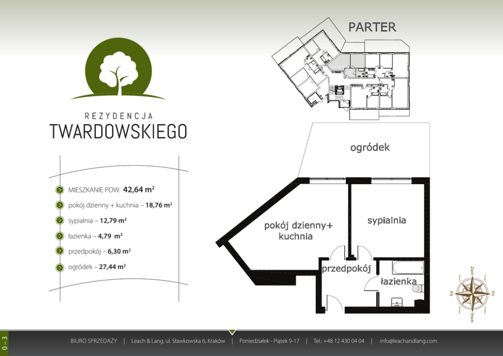 0–3 l MIESZKANIE POW. 42,64 m2 l pokój dzienny + kuchnia – 18,76 m2 l sypialnia – 12,79 m2 l łazienka – 4,79 m2 l przedpokój – 6,30 m2 l ogródek – 27,44 m2 Biuro Sprzedaży | Leach & Lang, ul. Sławkowska 6, Kraków | Poniedziałek - Piątek 9-17 | Tel.: +48 12 430 04 04 | [email protected]
