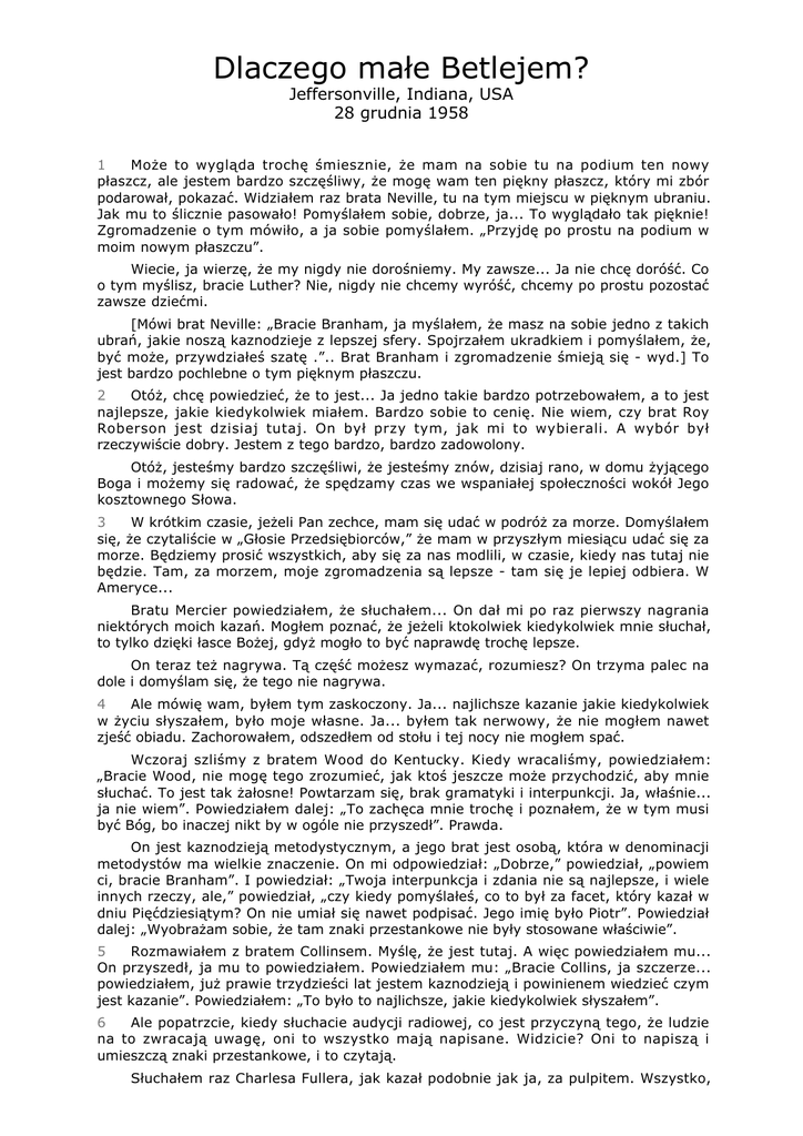 Dlaczego małe Betlejem? Jeffersonville, Indiana, USA 28 grudnia 1958 1 Może to wygląda trochę śmiesznie, że mam na sobie tu na podium ten nowy płaszcz, ale jestem bardzo szczęśliwy, że mogę wam ten piękny płaszcz, który mi zbór podarował, pokazać. Widziałem raz brata Neville, tu na tym miejscu w pięknym ubraniu. Jak mu to ślicznie pasowało! Pomyślałem sobie, dobrze, ja... To wyglądało tak pięknie! Zgromadzenie o tym mówiło, a ja sobie pomyślałem. „Przyjdę po prostu na podium w moim nowym płaszczu”. Wiecie, ja wierzę, że my nigdy nie dorośniemy. My zawsze... Ja nie chcę doróść. Co o tym myślisz, bracie Luther? Nie, nigdy nie chcemy wyróść, chcemy po prostu pozostać zawsze dziećmi. [Mówi brat Neville: „Bracie Branham, ja myślałem, że masz na sobie jedno z takich ubrań, jakie noszą kaznodzieje z lepszej sfery. Spojrzałem ukradkiem i pomyślałem, że, być może, przywdziałeś szatę .”.. Brat Branham i zgromadzenie śmieją się - wyd.] To jest bardzo pochlebne o tym pięknym płaszczu. 2 Otóż, chcę powiedzieć, że to jest... Ja jedno takie bardzo potrzebowałem, a to jest najlepsze, jakie kiedykolwiek miałem. Bardzo sobie to cenię. Nie wiem, czy brat Roy Roberson jest dzisiaj tutaj. On był przy tym, jak mi to wybierali. A wybór był rzeczywiście dobry. Jestem z tego bardzo, bardzo zadowolony. Otóż, jesteśmy bardzo szczęśliwi, że jesteśmy znów, dzisiaj rano, w domu żyjącego Boga i możemy się radować, że spędzamy czas we wspaniałej społeczności wokół Jego kosztownego Słowa. 3 W krótkim czasie, jeżeli Pan zechce, mam się udać w podróż za morze. Domyślałem się, że czytaliście w „Głosie Przedsiębiorców,” że mam w przyszłym miesiącu udać się za morze. Będziemy prosić wszystkich, aby się za nas modlili, w czasie, kiedy nas tutaj nie będzie. Tam, za morzem, moje zgromadzenia są lepsze - tam się je lepiej odbiera. W Ameryce... Bratu Mercier powiedziałem, że słuchałem... On dał mi po raz pierwszy nagrania niektórych moich kazań. Mogłem poznać, że jeżeli ktokolwiek kiedykolwiek mnie słuchał, to tylko dzięki łasce Bożej, gdyż mogło to być naprawdę trochę lepsze. On teraz też nagrywa. Tą część możesz wymazać, rozumiesz? On trzyma palec na dole i domyślam się, że tego nie nagrywa. 4 Ale mówię wam, byłem tym zaskoczony. Ja... najlichsze kazanie jakie kiedykolwiek w życiu słyszałem, było moje własne. Ja... byłem tak nerwowy, że nie mogłem nawet zjeść obiadu. Zachorowałem, odszedłem od stołu i tej nocy nie mogłem spać. Wczoraj szliśmy z bratem Wood do Kentucky. Kiedy wracaliśmy, powiedziałem: „Bracie Wood, nie mogę tego zrozumieć, jak ktoś jeszcze może przychodzić, aby mnie słuchać. To jest tak żałosne! Powtarzam się, brak gramatyki i interpunkcji. Ja, właśnie... ja nie wiem”. Powiedziałem dalej: „To zachęca mnie trochę i poznałem, że w tym musi być Bóg, bo inaczej nikt by w ogóle nie przyszedł”. Prawda. On jest kaznodzieją metodystycznym, a jego brat jest osobą, która w denominacji metodystów ma wielkie znaczenie. On mi odpowiedział: „Dobrze,” powiedział, „powiem ci, bracie Branham”. I powiedział: „Twoja interpunkcja i zdania nie są najlepsze, i wiele innych rzeczy, ale,” powiedział, „czy kiedy pomyślałeś, co to był za facet, który kazał w dniu Pięćdziesiątym? On nie umiał się nawet podpisać. Jego imię było Piotr”. Powiedział dalej: „Wyobrażam sobie, że tam znaki przestankowe nie były stosowane właściwie”. 5 Rozmawiałem z bratem Collinsem. Myślę, że jest tutaj. A więc powiedziałem mu... On przyszedł, ja mu to powiedziałem. Powiedziałem mu: „Bracie Collins, ja szczerze... powiedziałem, już prawie trzydzieści lat jestem kaznodzieją i powinienem wiedzieć czym jest kazanie”. Powiedziałem: „To było to najlichsze, jakie kiedykolwiek słyszałem”. 6 Ale popatrzcie, kiedy słuchacie audycji radiowej, co jest przyczyną tego, że ludzie na to zwracają uwagę, oni to wszystko mają napisane. Widzicie? Oni to napiszą i umieszczą znaki przestankowe, i to czytają. Słuchałem raz Charlesa Fullera, jak kazał podobnie jak ja, za pulpitem. Wszystko, Dlaczego małe Betlejem? 2 co on powiedział, to on to po prostu przeczytał - strona nr 1, nr 2, nr 3, nr 4. To wszystko w odpowiedniej chwili, skorygowane i ocenzurowane itd. Podobnie u Billy Grahama. Ja to widziałem. On stał i mówił, ale on tylko czytał i to tak szybko, jak tylko mógł. On to wszystko miał przygotowane. Myślę, że tam można umieścić znaki przestankowe. 7 Ale ze mną problem jest inny. Ja nie mogę tego nawet przeczytać. Jeśli coś napiszę, jestem pewny, że tego nie potrafię przeczytać. Czy nie jest to zdumiewająca łaska, że mogę oglądać co On dla nas czyni? Jestem wdzięczny, że kończymy ten stary rok, aby rozpocząć nowy. Słuchałem kolejki modlitwy i nie byłem z tego zadowolony. Stało się to pierwszy raz, że słyszałem samego siebie głoszącego poselstwo i byłem zdziwiony, że kolejka modlitwy nie przebiega właściwie. Myślę, iż w krótkim czasie stanie się, że każdy, nim uwierzy, będzie musiał się o nich wszystko dowiedzieć. A od pierwszego dnia tego roku pragnę to zmienić zgodnie z tym, co do mnie mówi Bóg: „Ta osoba nie jest w porządku”. Ona uczyniła coś niedobrego. Ja się przy niej zatrzymam. Niech reszta z nich przechodzi dalej kolejką, inaczej moglibyśmy modlić się tylko za niewielu. Ludzie o sobie wiedzą jakimi są i co uczynili, lecz kiedy stwierdzą, że w nich jest coś nie w porządku z Bogiem, wtenczas ja się zatrzymam przy takiej osobie, rozumiecie? Więc po przesłuchaniu tej kolejki, myślę, że uczynię jakąś zmianę, bracie Leo. Ufam, że Bóg pomoże nam w tym nadchodzącym roku. 8 Wierzę, że dziś wieczór będziecie mieć tutaj zgromadzenie w kaplicy a ja mam przemawiać wieczorem u brata Rud
