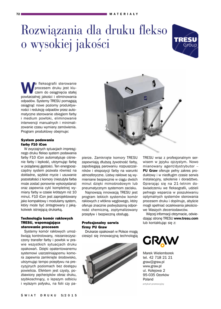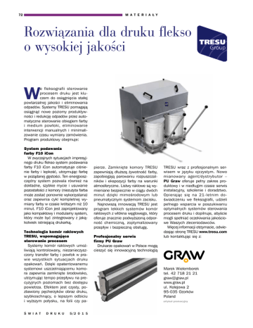 M A T E R I A Ł Y 72 Rozwiązania dla druku flekso o wysokiej jakości W e fleksografii sterowanie procesem druku jest kluczem do osiągnięcia stałej powtarzalnej jakości i eliminowania odpadów. Systemy TRESU pomagają osiągnąć nowe poziomy produktywności i redukcję odpadów przez automatyczne sterowanie obiegiem farby i medium powłoki, eliminowanie interwencji manualnych i minimalizowanie czasu wymiany zamówienia. Program produktowy obejmuje: System podawania farby F10 iCon W zwyczajnych sytuacjach impresyjnego druku flekso system podawania farby F10 iCon automatyzuje ciśnienie farby i lepkość, utrzymując farbę w pożądanej gęstości. Ten energooszczędny system pozwala również na dokładne, szybkie mycie i usuwanie pozostałości z komory (niezużyta farba może zostać ponownie wykorzystana) oraz zapewnia cykl kompletnej wymiany farby w czasie krótszym niż 10 minut. F10 iCon jest zaprojektowany jako kompaktowy i modularny system, który może być zintegrowany z jakąkolwiek istniejącą drukarką. Technologia komór raklowych TRESU, wspomagająca sterowanie procesem Systemy komór raklowych umożliwiają kontrolowany, niezanieczyszczony transfer farby i powłok w prawie wszystkich sytuacjach druku opakowań. Dzięki opatentowanemu systemowi uszczelniającemu komora zapewnia zamknięte środowisko, utrzymując tempo przepływu na precyzyjnych poziomach bez dostępu powietrza. Efektem jest czysty, pozbawiony pęcherzyków obraz druku, szybkoschnący, o lepszym odbiciu i wyższym połysku, na folii czy pa- Ś W I A T D R U K U 5/2 0 1 5 pierze. Zamknięte komory TRESU zapewniają dłuższą żywotność farby, zapobiegają parowaniu rozpuszczalników i ekspozycji farby na warunki atmosferyczne. Listwy raklowe są wymieniane bezpiecznie w ciągu dwóch minut dzięki mimośrodowym lub pneumatycznym systemom zacisku. Najnowszą innowacją TRESU jest program lekkich systemów komór raklowych z włókna węglowego, który oferuje znacznie podwyższoną odporność chemiczną, zoptymalizowany przepływ i bezpieczną obsługę. Profesjonalny serwis firmy PU Graw Drukarze opakowań w Polsce mogą cieszyć się innowacyjną technologią TRESU wraz z profesjonalnym serwisem w języku ojczystym. Nowo mianowany agent/dystrybutor – PU Graw oferuje pełny zakres produktowy i w niedługim czasie serwis instalacyjny, szkolenie i doradztwo. Opierając się na 21-letnim doświadczeniu we fleksografii, udzieli pełnego wsparcia w poszukiwaniu optymalnych systemów sterowania procesem druku i dopilnuje, abyście mogli spełniać oczekiwania jakościowe Waszych zleceniodawców. Więcej informacji otrzymacie, odwiedzając stronę TRESU www.tresu.com lub kontaktując się z: Marek Wielemborek tel. 42 718 21 21 [email protected] www.graw.pl ul. Kolejowa 2 95-035 Ozorków Poland artykuł promocyjny