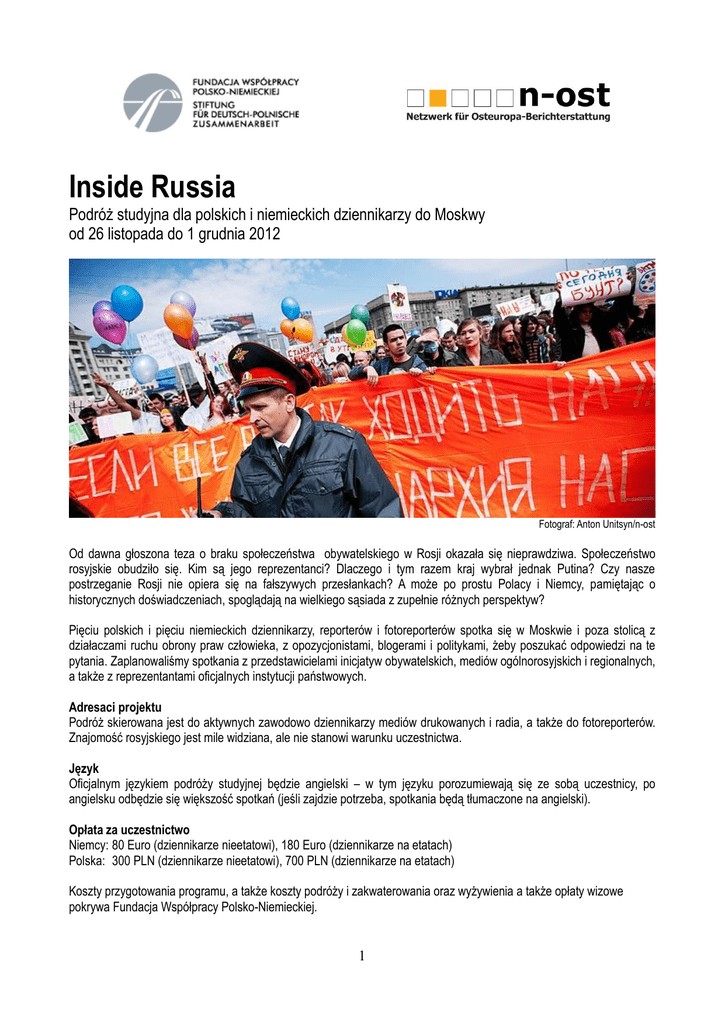Inside Russia Podróż studyjna dla polskich i niemieckich dziennikarzy do Moskwy od 26 listopada do 1 grudnia 2012 Fotograf: Anton Unitsyn/n-ost Od dawna głoszona teza o braku społeczeństwa obywatelskiego w Rosji okazała się nieprawdziwa. Społeczeństwo rosyjskie obudziło się. Kim są jego reprezentanci? Dlaczego i tym razem kraj wybrał jednak Putina? Czy nasze postrzeganie Rosji nie opiera się na fałszywych przesłankach? A może po prostu Polacy i Niemcy, pamiętając o historycznych doświadczeniach, spoglądają na wielkiego sąsiada z zupełnie różnych perspektyw? Pięciu polskich i pięciu niemieckich dziennikarzy, reporterów i fotoreporterów spotka się w Moskwie i poza stolicą z działaczami ruchu obrony praw człowieka, z opozycjonistami, blogerami i politykami, żeby poszukać odpowiedzi na te pytania. Zaplanowaliśmy spotkania z przedstawicielami inicjatyw obywatelskich, mediów ogólnorosyjskich i regionalnych, a także z reprezentantami oficjalnych instytucji państwowych. Adresaci projektu Podróż skierowana jest do aktywnych zawodowo dziennikarzy mediów drukowanych i radia, a także do fotoreporterów. Znajomość rosyjskiego jest mile widziana, ale nie stanowi warunku uczestnictwa. Język Oficjalnym językiem podróży studyjnej będzie angielski – w tym języku porozumiewają się ze sobą uczestnicy, po angielsku odbędzie się większość spotkań (jeśli zajdzie potrzeba, spotkania będą tłumaczone na angielski). Opłata za uczestnictwo Niemcy: 80 Euro (dziennikarze nieetatowi), 180 Euro (dziennikarze na etatach) Polska: 300 PLN (dziennikarze nieetatowi), 700 PLN (dziennikarze na etatach) Koszty przygotowania programu, a także koszty podróży i zakwaterowania oraz wyżywienia a także opłaty wizowe pokrywa Fundacja Współpracy Polsko-Niemieckiej. 1 PROGRAM (może ulec zmianie) PONIEDZIAŁEK, 26 LISTOPADA 2012 Przyjazd uczestników programu i zakwaterowanie w hotelu Wspólna kolacja WTOREK, 27 LISTOPADA 2012 Rozmowa z Aleksiejem Nawalnym, jednym z najbardziej znanych przedstawicieli rosyjskiej opozycji. Kontrowersyjny ze względu na powiązania z nacjonalistycznie nastawioną częścią opozycji prawnik, zdobył rozgłos, gdy jako akcjonariusz mniejszościowy dużych rosyjskich przedsiębiorstw postanowił zdemaskować przypadki korupcji wśród urzędników i w przedsiębiorstwach państwowych. Spotkanie w telewizji „Dożd“: ostatniej zimy stacja ta stała się jedną z najważniejszych platform debaty dla ruchów opozycyjnych. „Dożd” nadaje z położonego naprzeciw Kremla studia relacje z demonstracji, zaprasza przedstawicieli każdej frakcji politycznej, nie przejmując się cenzurę kremlowską. Dyskusja ze Stanisławem Belkowskim, jednym z tzw. „polittechnologów”, którzy „stwarzali” polityków, organizowali kampanie wyborcze i forsowali debaty publiczne w ciągu ostatnich dwóch dekad. Belkowskij porusza się w szarej strefie między opozycją a Kremlem i ma zawsze własne zdanie na temat sytuacji w Rosji. ŚRODA, 28 LISTOPADA 2012 Spotkanie z 27-letnim politykiem „grassroots“ Maxem Katzem w jego dzielnicy Schukino. Jeszcze ostatniej jesieni Katz, niezwiązany z polityką, był jednym z najlepszych rosyjskich pokerzystów. Zimą zaangażował się w opozycyji, a w marcu został wybrany do rady dzielnicowej Schukino. Od tego czasu stara się zmieniać rzeczywistość na poziomie dzielnicy. Jego blogi dotyczące posiedzeń rady dzielnicowej cieszą się wielką popularnością. Rozmowa z Władimirem Ryżkowem, jednym z najważniejszych przedstawicieli opozycji. Przez długie lata Ryżkow był deputowanym do Dumy, potem działalność jego Partii Republikańskiej została zdelegalizowana. Współorganizował protesty zimowe. W maju 2012 roku partia powróciła na scenę polityczną – ale czy to oznacza, że ma ona rzeczywiście szanse w kolejnych wyborach? Spotkanie z prawnikiem i politykiem Andrejem Makarovem. Adwokat ten jest czołowym politykiem partii Jedna Rosja i wiceprzewodniczącym Dumy Państwowej. Należy on do liberalnego skrzydła „partii oszustów i złodziei”, jak opozycja nazywa partię rządzącą. Jest on także moderatorem programu „Wolność i sprawiedliwość”, który początkowo emitowany był przez niezależną stację „REN-TV”, a od roku jest na antenie pierwszego kanału rosyjskiej telewizji. CZWARTEK, 29 LISTOPADA 2012 Wyjazd do miasta Żukow, podczas którego uczestnicy mają przekonać się, czym jest wolność prasy poza Moskwą: 2 spotkanie z Natalią Snamenskają, redaktorką naczelną gazety „Żukowskije Westi” i innymi dziennikarzami gazety, która walczy na poziomie regionalnym z korupcją w kręgach władzy i, sądząc po liczbie abonentów, cieszy się zaufaniem obywateli. Dyskusja z dziennikarzem i pisarzem Zacharem Prilepinem, którego powieści o wojnie w Czeczenii i walce młodego bolszewika-narodowca z systemem Putina („Sańkja” – powieść wydana w Polsce, a ostatnio także w Niemczech), sprawiły, że jest on jednym z najbardziej kontrowersyjnych autorów dzisiejszej Rosji. Prilepin nie tylko ostro krytykuje rząd, ale także uważnie przygląda się liberalnej opozycji. Kolacja i dyskusja z korespondentami polskich i niemieckich mediów w Moskwie: spojrzenie na Rosję z polskiej i niemieckiej perspektywy. PIĄTEK, 30 LISTOPADA 2012 Pierwsza część dnia: czas na indywidualne spotkania Wywiad z Michaiłem Fedotovem, przewodniczącym Rady Prezydenckiej ds. Praw Człowieka i Rozwoju Społeczeństwa Obywatelskiego. Jaki wpływ może wywierać komórka „usankcjonowana” przez prezydenta, mająca swą siedzibę w budynkach rządowych? Fedotov, ekspert ds. mediów, opowie o planowanym na maj 2013 roku utworzeniu publicznej telewizji i o sytuacji rosyjskich mediów. Zwiedzanie Centrum Sztuki Współczesnej "Winzavod" z Andriejem Jerofejewem, jednym z najbardziej znanych kuratorów współczesnej sztuki rosyjskiej, który w 2010 za krytyczną wobec religii