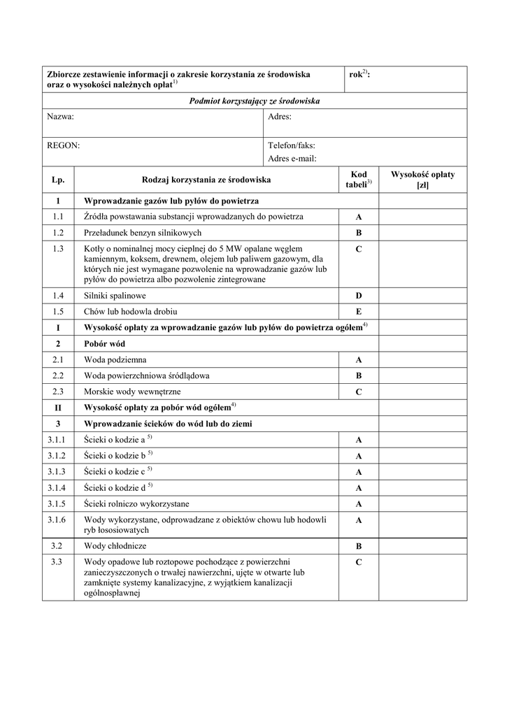 z dnia . . . . . . . . . . . . . . . . . . 2014 r. (poz . . . . . . ) WZÓR WYKAZU ZAWIERAJĄCEGO ZBIORCZE ZESTAWIENIE INFORMACJI O ZAKRESIE KORZYSTANIA ZE ŚRODOWISKA ORAZ O WYSOKOŚCI NALEŻNYCH OPŁAT Zbiorcze zestawienie informacji o zakresie korzystania ze środowiska oraz o wysokości należnych opłat1) rok2): Podmiot korzystający ze środowiska Nazwa: Adres: REGON: Telefon/faks: Adres e-mail: Lp. 1 Rodzaj korzystania ze środowiska Kod tabeli3) Wprowadzanie gazów lub pyłów do powietrza 1.1 Źródła powstawania substancji wprowadzanych do powietrza A 1.2 Przeładunek benzyn silnikowych B 1.3 Kotły o nominalnej mocy cieplnej do 5 MW opalane węglem kamiennym, koksem, drewnem, olejem lub paliwem gazowym, dla których nie jest wymagane pozwolenie na wprowadzanie gazów lub pyłów do powietrza albo pozwolenie zintegrowane C 1.4 Silniki spalinowe D 1.5 Chów lub hodowla drobiu E I Wysokość opłaty za wprowadzanie gazów lub pyłów do powietrza ogółem4) 2 Pobór wód 2.1 Woda podziemna A 2.2 Woda powierzchniowa śródlądowa B 2.3 Morskie wody wewnętrzne C 4) II Wysokość opłaty za pobór wód ogółem 3 Wprowadzanie ścieków do wód lub do ziemi 3.1.1 Ścieki o kodzie a 5) A 3.1.2 Ścieki o kodzie b 5) A 3.1.3 Ścieki o kodzie c 5) A 3.1.4 Ścieki o kodzie d 5) A 3.1.5 Ścieki rolniczo wykorzystane A 3.1.6 Wody wykorzystane, odprowadzane z obiektów chowu lub hodowli ryb łososiowatych A 3.2 Wody chłodnicze B 3.3 Wody opadowe lub roztopowe pochodzące z powierzchni zanieczyszczonych o trwałej nawierzchni, ujęte w otwarte lub zamknięte systemy kanalizacyjne, z wyjątkiem kanalizacji ogólnospławnej C Wysokość opłaty [zł] 3.4 Wody zasolone D 3.5 Wody wykorzystane, odprowadzane z obiektów chowu lub hodowli ryb innych niż łososiowate lub innych organizmów wodnych E III Wysokość opłaty za wprowadzanie ścieków do wód lub do ziemi ogółem4) 4 Składowanie odpadów 4.1 Odpady składowane selektywnie A 4.2 Odpady składowane nieselektywnie A IV Wysokość opłaty za składowanie odpadów ogółem4) Suma opłat ogółem6) [zł] Ob j aś n ie ni a: 1) Wypełnia się w każdym przypadku przedkładania któregokolwiek z wykazów zawartych w załącznikach nr 2−5 do rozporządzenia Ministra Środowiska z dnia 27 lutego 2014 r. w sprawie wykazów zawierających informacje i dane o zakresie korzystania ze środowiska oraz o wysokości należnych opłat (Dz. U. poz. 274). 2) Należy podać rok, którego dotyczy wykaz. 3) Oznaczenie literowe tabel w załącznikach nr 2−5 do rozporządzenia Ministra Środowiska z dnia 27 lutego 2014 r. w sprawie wykazów zawierających informacje i dane o zakresie korzystania ze środowiska oraz o wysokości należnych opłat; należy podkreślić kod tej tabeli, którą dany podmiot korzystający ze środowiska wypełnił. 4) Zaokrągla się do pełnych złotych w ten sposób, że końcówkę kwoty mniejszą niż 50 groszy pomija się, a końcówkę kwoty wynoszącą 50 groszy i więcej podwyższa się do pełnych złotych. 5) Kody rodzajów ścieków wprowadzanych do wód lub do ziemi: a ścieki bytowe, z wyłączeniem ścieków bytowych wchodzących w skład ścieków komunalnych, ścieków przemysłowych lub ścieków innych niż ścieki komunalne albo ścieki przemysłowe, b ścieki komunalne inne niż ścieki bytowe wprowadzane urządzeniami służącymi do realizacji zadań własnych gminy w zakresie kanalizacji i oczyszczania ścieków komunalnych, c ścieki przemysłowe wprowadzane z urządzeń innych niż wymienione w kodzie b, d ścieki inne niż oznaczone kodami a−c. 6) Suma opłat za poszczególne rodzaje korzystania ze środowiska, określonych w wierszach I, II, III i IV; nie wlicza się do niej opłat z tytułu tych rodzajów korzystania ze środowiska, których roczna wysokość nie przekracza 800 zł. P o ucz e nie : Zawarte w wykazie informacje o wysokości należnych opłat stanowią podstawę do wystawienia tytułu wykonawczego zgodnie z przepisami ustawy z dnia 17 czerwca 1966 r. o postępowaniu egzekucyjnym w administracji (Dz. U. z 2012 r. poz. 1015, z późn. zm.). .................................. (data) ................................................ (podpis osoby wypełniającej) ................................................................................................... (podpis osoby upoważnionej do reprezentowania podmiotu korzystającego ze środowiska)