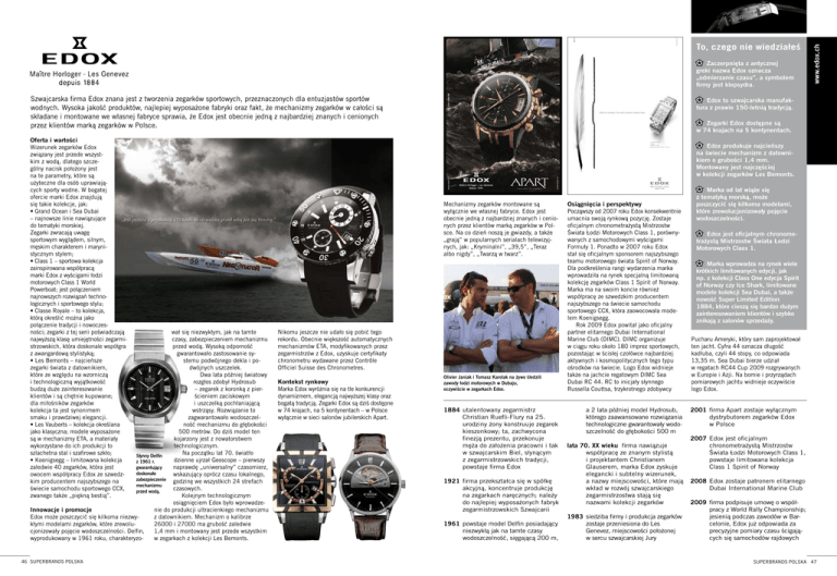 J Zaczerpnięta z antycznej greki nazwa Edox oznacza „odmierzanie czasu”, a symbolem firmy jest klepsydra. Szwajcarska firma Edox znana jest z tworzenia zegarków sportowych, przeznaczonych dla entuzjastów sportów wodnych. Wysoka jakość produktów, najlepiej wyposażone fabryki oraz fakt, że mechanizmy zegarków w całości są składane i montowane we własnej fabryce sprawia, że Edox jest obecnie jedną z najbardziej znanych i cenionych przez klientów marką zegarków w Polsce. Oferta i wartości Wizerunek zegarków Edox związany jest przede wszystkim z wodą, dlatego szczególny nacisk położony jest na te parametry, które są użyteczne dla osób uprawiających sporty wodne. W bogatej ofercie marki Edox znajdują się takie kolekcje, jak: • Grand Ocean i Sea Dubai – najnowsze linie nawiązujące do tematyki morskiej. Zegarki zwracają uwagę sportowym wyglądem, silnym, męskim charakterem i marynistycznym stylem; • Class 1 – sportowa kolekcja zainspirowana współpracą marki Edox z wyścigami łodzi motorowych Class 1 World Powerboat; jest połączeniem najnowszych rozwiązań technologicznych i sportowego stylu; • Classe Royale – to kolekcja, którą określić można jako połączenie tradycji i nowoczesności; zegarki z tej serii poświadczają najwyższą klasę umiejętności zegarmistrzowskich, która doskonale współgra z awangardową stylistyką; • Les Bemonts – najcieńsze zegarki świata z datownikiem, które ze względu na wzorniczą i technologiczną wyjątkowość budzą duże zainteresowanie klientów i są chętnie kupowane; dla miłośników zegarków kolekcja ta jest synonimem smaku i prawdziwej elegancji. • Les Vauberts – kolekcja określana jako klasyczna; modele wyposażone są w mechanizmy ETA, a materiały wykorzystane do ich produkcji to szlachetna stal i szafirowe szkło; • Koenigsegg – limitowana kolekcja zaledwie 40 zegarków, która jest owocem współpracy Edox ze szwedzkim producentem najszybszego na świecie samochodu sportowego CCX, zwanego także „piękną bestią”. wał się niezwykłym, jak na tamte czasy, zabezpieczeniem mechanizmu przed wodą. Wysoką odporność gwarantowało zastosowanie systemu podwójnego dekla i podwójnych uszczelek. Dwa lata później światowy rozgłos zdobył Hydrosub – zegarek z koronką z pierścieniem zaciskowym i uszczelką pochłaniającą wstrząsy. Rozwiązanie to zagwarantowało wodoszczelność mechanizmu do głębokości 500 metrów. Do dziś model ten kojarzony jest z nowatorstwem technologicznym. Na początku lat 70. światło Słynny Delfin dzienne ujrzał Geoscope – pierwszy z 1961 r. naprawdę „uniwersalny” czasomierz, gwarantujący doskonałe wskazujący oprócz czasu lokalnego, zabezpieczenie godzinę we wszystkich 24 strefach mechanizmu czasowych. przed wodą. Kolejnym technologicznym osiągnięciem Edox było wprowadzeInnowacje i promocje nie do produkcji ultracienkiego mechanizmu Edox może poszczycić się kilkoma niezwyz datownikiem. Mechanizm o kalibrze kłymi modelami zegarków, które zrewolu26000 i 27000 ma grubość zaledwie cjonizowały pojęcie wodoszczelności. Delfin, 1,4 mm i montowany jest przede wszystkim wyprodukowany w 1961 roku, charakteryzow zegarkach z kolekcji Les Bemonts. 46 SUPERBRANDS POLSKA www.edox.ch www.edox.ch To, czego nie wiedziałeś J Edox to szwajcarska manufaktura z prawie 150-letnią tradycją. EDOX Les Fontaines. The world’s slimmest calendar watch. J Zegarki Edox dostępne są w 74 krajach na 5 kontynentach. all stainless steel 3 ATM sapphire crystal Movement Edox 27000 (1.4mm) J Edox produkuje najcieńszy na świecie mechanizm z datownikiem o grubości 1,4 mm. Montowany jest najczęściej w kolekcji zegarków Les Bemonts. J Marka od lat wiąże się Playboy [2009-06] Edox Grand Oce1 1 2009-06-17 14:24:34 Mechanizmy zegarków montowane są wyłącznie we własnej fabryce. Edox jest obecnie jedną z najbardziej znanych i cenionych przez klientów marką zegarków w Polsce. Na co dzień noszą je gwiazdy, a także „grają” w popularnych serialach telewizyjnych, jak: „Kryminalni”, „39,5”, „Teraz albo nigdy”, „Twarzą w twarz”. Nikomu jeszcze nie udało się pobić tego rekordu. Obecnie większość automatycznych mechanizmów ETA, modyfikowanych przez zegarmistrzów z Edox, uzyskuje certyfikaty chronometru wydawane przez Contrôle Officiel Suisse des Chronometres. Kontekst rynkowy Marka Edox wyróżnia się na tle konkurencji dynamizmem, elegancją najwyższej klasy oraz bogatą tradycją. Zegarki Edox są dziś dostępne w 74 krajach, na 5 kontynentach – w Polsce wyłącznie w sieci salonów jubilerskich Apart. Olivier Janiak i Tomasz Karolak na żywo śledzili zawody łodzi motorowych w Dubaju, oczywiście w zegarkach Edox. 1884 utalentowany zegarmistrz Christian Ruefli-Flury na 25. urodziny żony konstruuje zegarek kieszonkowy; ta, zachwycona finezją prezentu, przekonuje męża do założenia pracowni i tak w szwajcarskim Biel, słynącym z zegarmistrzowskich tradycji, powstaje firma Edox 1921 firma przekształca się w spółkę akcyjną, koncentruje produkcję na zegarkach naręcznych; należy do najlepiej wyposażonych fabryk zegarmistrzowskich Szwajcarii 1961 powstaje model Delfin posiadający niezwykłą jak na tamte czasy wodoszczelność, sięgającą 200 m, Osiągnięcia i perspektywy Począwszy od 2007 roku Edox konsekwentnie umacnia swoją rynkową pozycję. Zostaje oficjalnym chronometrażystą Mistrzostw Świata Łodzi Motorowych Class 1, porównywanych z samochodowymi wyścigami Formuły 1. Ponadto w 2007 roku Edox stał się oficjalnym sponsorem najszybszego teamu motorowego świata Spirit of Norway. Dla podkreślenia rangi wydarzenia marka wprowadziła na rynek specjalną limitowaną kolekcję zegarków Class 1 Spirit of Norway. Marka ma na swoim koncie również współpracę ze szwedzkim producentem najszybszego na świecie samochodu sportowego CCX, która zaowocowała mode