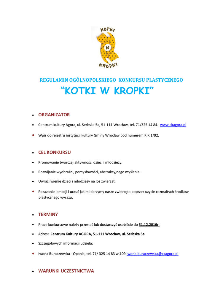 REGULAMIN OGÓLNOPOLSKIEGO KONKURSU PLASTYCZNEGO “KOTKI W KROPKI” ORGANIZATOR Centrum kultury Agora, ul. Serbska 5a, 51-111 Wrocław, tel. 71/325 14 84. www.ckagora.pl Wpis do rejestru instytucji kultury Gminy Wrocław pod numerem RIK 1/92. CEL KONKURSU Promowanie twórczej aktywności dzieci i młodzieży. Rozwijanie wyobraźni, pomysłowości, abstrakcyjnego myślenia. Uwrażliwienie dzieci i młodzieży na los zwierząt. Pokazanie emocji i uczuć jakimi darzymy nasze zwierzęta poprzez użycie rozmaitych środków plastycznego wyrazu. TERMINY Prace konkursowe należy przesłać lub dostarczyć osobiście do 31.12.2016r. Adres: Centrum Kultury AGORA, 51-111 Wrocław, ul. Serbska 5a Szczegółowych informacji udziela: Iwona Buraczewska - Opania, tel. 71/ 325 14 83 w.109 [email protected] WARUNKI UCZESTNICTWA Czekamy na prace z zakresu malarstwa, grafiki, rysunku, rzeźby i płaskorzeźby (glina, masa solna i papierowa). Mile widziane będą również prace wykonane w technice kolażu (bez użycia materiałów sypkich) i innych technikach własnych. Format prac płaskich nie może przekraczać 50 x 70cm., prace przestrzenne minimalna wysokość 15 cm. Konkurs adresowany jest do dzieci i młodzieży, prace będą oceniane w czterech kategoriach wiekowych: 5-6 lat (zerówki szkolne i przedszkolne) 7-9 lat (kl. I-III) 10-12 lat (kl. IV-VI) 13-15 lat (kl. I-III gimnazjum). Do każdej pracy należy dołączyć wypełnioną kartę zgłoszenia dostępną również na stronie internetowej www.ckagora.pl Każda praca powinna zawierać na odwrocie imię, nazwisko, wiek autora. Nie przyjmujemy prac zbiorowych. Z jednej placówki można dostarczyć maksymalnie 10 prac. Każdy uczestnik może być autorem tylko jednej pracy. Udział w konkursie wiąże się z wyrażeniem zgody na: Przetwarzanie danych osobowych uczestnika, zgodnie z ustawą z dnia 29 sierpnia 1997 roku o ochronie danych osobowych (tj. Dz. U. 2002r. nr101, poz. 926 ze zm.) do celów związanych bezpośrednio z konkursem i jego promocją. Wykorzystanie nadesłanych prac oraz wizerunku uczestnika bez ograniczeń terytorialnych, czasowych na następujących polach eksploatacji: rozpowszechnianie w formie wystawy, publikacja w mediach tradycyjnych i internetowych, na profilu FB oraz na stronie CK AGORA, partnerów oraz patronów medialnych projektu, na potrzeby reklamowe konkursu i działalności statutowej organizatora, utrwalanie i zwielokrotnianie dowolną techniką, rozpowszechnianie i publiczne prezentowanie w materiałach audiowizualnych, fotograficznych, internetowych, poligraficznych, stanowiących materiały promocyjne, informacyjne i reklamowe. Wprowadzenie do pamięci komputera oraz sieci multimedialnych. Wszystkie prace przechodzą na własność organizatora i nie będą odsyłane. Organizator zastrzega sobie prawo do ewentualnej zmiany postanowień Regulaminu w razie wystąpienia przeszkód z przyczyn od niego niezależnych. Równocześnie zobowiązuje się do powiadomienia o wszelkich dokonanych zmianach z odpowiednim wyprzedzeniem na stronie www.ckagora.pl Udział w konkursie jest równoznaczny z akceptacją Regulaminu. ROZSTRZYGNIĘCIE KONKURSU Prace będą oceniane przez jury powołane przez organizatora, w skład którego wejdą wrocławscy artyści i przedstawiciel CK AGORA. Jury przyzna nagrody i wyróżnienia w każdej kategorii wiekowej. Protokół z posiedzenia Komisji Konkursowej zostanie zamieszczony na stronie internetowej Centrum Kultury AGORA. Wernisaż wystawy pokonkursowej wraz z wręczeniem nagród odbędzie się w galerii Centrum Kultury AGORA 27 stycznia 2017 roku o godz.14.00. Centrum Kultury AGORA / Ul. Serbska 5a , 51-111 Wrocław / www.ckagora.pl KARTA ZGŁOSZENIOWA OGÓLNOPOLSKIEGO KONKURSU PLASTYCZNEGO “KOTKI W KROPKI” TYTUŁ PRACY …………………………………………………………………………………………………………………………………………………….. NAZWA PLACÓWKI DELEGUJĄCEJ ……………………………………………………………………………………………………………………………………………………… IMIĘ I NAZWISKO, WIEK AUTORA …………………………………………………………………………………………………………………………………………………….. IMIĘ I NAZWISKO NAUCZYCIELA/ INSTRUKTORA/ OPIEKUNA PRAWNEGO/ RODZICA ……………………………………………………………………………………………………………………………………………………. DOKŁADNY ADRES Z KODEM POCZTOWYM …………………………………………………………………………………………………………………………………………………… …………………………………………………………………………………………………………………………………………………… …………………………………………………………………………………………………………………………………………………… TELEFON, MAIL PLACÓWKI REKOMENDYJĄCEJ PRACĘ/ OPIEKUNA PRAWNEGO/ RODZICA TEL. ……………………………………………………………………………………………………………………………….. MAIL. ……………………………………………………………………………………………………………………………..