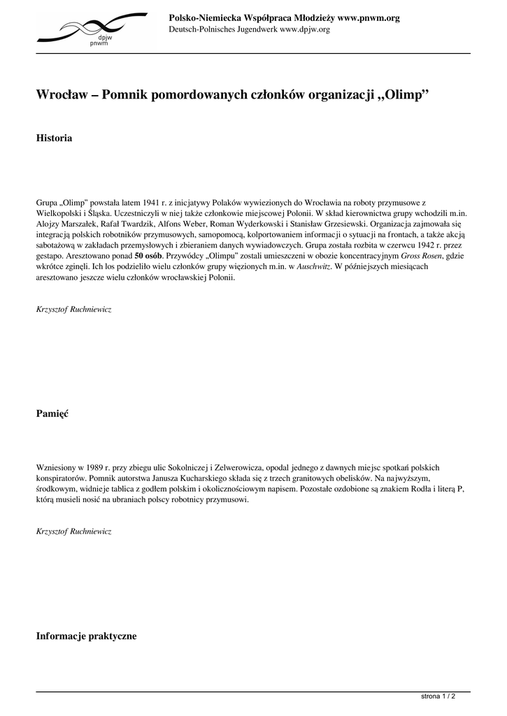 Polsko-Niemiecka Współpraca Młodzieży www.pnwm.org Deutsch-Polnisches Jugendwerk www.dpjw.org Wrocław – Pomnik pomordowanych członków organizacji „Olimp” Historia Grupa „Olimp” powstała latem 1941 r. z inicjatywy Polaków wywiezionych do Wrocławia na roboty przymusowe z Wielkopolski i Śląska. Uczestniczyli w niej także członkowie miejscowej Polonii. W skład kierownictwa grupy wchodzili m.in. Alojzy Marszałek, Rafał Twardzik, Alfons Weber, Roman Wyderkowski i Stanisław Grzesiewski. Organizacja zajmowała się integracją polskich robotników przymusowych, samopomocą, kolportowaniem informacji o sytuacji na frontach, a także akcją sabotażową w zakładach przemysłowych i zbieraniem danych wywiadowczych. Grupa została rozbita w czerwcu 1942 r. przez gestapo. Aresztowano ponad 50 osób. Przywódcy „Olimpu” zostali umieszczeni w obozie koncentracyjnym Gross Rosen, gdzie wkrótce zginęli. Ich los podzieliło wielu członków grupy więzionych m.in. w Auschwitz. W późniejszych miesiącach aresztowano jeszcze wielu członków wrocławskiej Polonii. Krzysztof Ruchniewicz Pamięć Wzniesiony w 1989 r. przy zbiegu ulic Sokolniczej i Zelwerowicza, opodal jednego z dawnych miejsc spotkań polskich konspiratorów. Pomnik autorstwa Janusza Kucharskiego składa się z trzech granitowych obelisków. Na najwyższym, środkowym, widnieje tablica z godłem polskim i okolicznościowym napisem. Pozostałe ozdobione są znakiem Rodła i literą P, którą musieli nosić na ubraniach polscy robotnicy przymusowi. Krzysztof Ruchniewicz Informacje praktyczne strona 1 / 2 Polsko-Niemiecka Współpraca Młodzieży www.pnwm.org Deutsch-Polnisches Jugendwerk www.dpjw.org Wrocław – Pomnik pomordowanych członków organizacji „Olimp” Dojazd: koleją (rozkłady jazdy na www.pkp.pl); plan Wrocławia dostępny m.in. na stronie www.wroclaw.pl. ul. Sokolnicza, Wrocław strona 2 / 2 Powered by TCPDF (www.tcpdf.org)