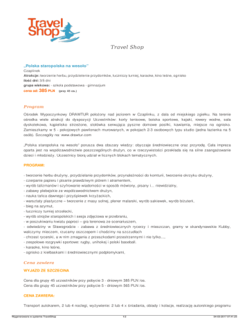 Travel Shop „Polska staropolska na wesoło” Czaplinek Atrakcje: tworzenie herbu, przydzielenie przydomków, łuczniczy turniej, karaoke, kino leśne, ognisko ilość dni: 3/5 dni grupa wiekowa: - szkoła podstawowa - gimnazjum cena od: 385 PLN (przy 45 os.) Program Ośrodek Wypoczynkowy DRAWTUR położony nad jeziorem w Czaplinku, z dala od miejskiego zgiełku. Na terenie ośrodka wiele atrakcji do dyspozycji Uczestników: korty tenisowe, boiska sportowe, kajaki, rowery wodne, sala dyskotekowa, kąpielisko strzeżone, stołówka serwująca pyszne domowe posiłki, kawiarnia, miejsce na ognisko. Zamieszkamy w 5 - pokojowych pawilonach murowanych, w pokojach 2-3 osobowych typu studio (jedna łazienka na 5 osób). Szczegóły na: www.drawtur.com „Polska staropolska na wesoło” porusza dwa obszary wiedzy: obyczaje średniowieczne oraz przyrodę. Cała impreza oparta jest na współzawodnictwie poszczególnych drużyn, co w rzeczywistości przekłada się na silne zaangażowanie dzieci i młodzieży. Uczestnicy biorą udział w licznych blokach tematycznych. PROGRAM: - tworzenie herbu drużyny, przydzielanie przydomków, przynależności do komturii, tworzenie okrzyku drużyny, - czerpanie papieru i pisanie prawdziwym piórem i atramentem, - wyrób talizmanów i szyfrowanie wiadomości w sposób mówiony, pisany i... niewidzialny, - zabawy plebejskie ze współzawodnictwem drużyn, - nauka tańca dawnego i przyśpiewek krzyżackich, - warsztaty plastyczne – tworzenie z masy solnej, plener malarski, wyrób sakiewek, wyrób biżuterii, - bieg na azymut, - łuczniczy turniej strzelecki, - wyrób strojów staropolskich i sesja zdjęciowa w przebraniu, - w poszukiwaniu kwiatu paproci – gra terenowa ze scenariuszem, - odwiedziny w Sławogrodzie - zabawa z średniowiecznych rycerzy i mieszczan, gramy w skandynawskie Kubby, walczymy mieczem, rzucamy oszczepem i chodzimy na szczudłach - chrzest rycerski, a w nim zmagania z przeszkodami przestrzennymi i nie tylko..., - zespołowe rozgrywki sportowe: rugby, unihokej i polski baseball. - karaoke, kino leśne, - ognisko z kiełbaskami i średniowiecznymi podpłomykami, Cena zawiera WYJAZD ZE SZCZECINA Cena dla grupy 45 uczestników przy pobycie 3 - dniowym 385 PLN /os. Cena dla grupy 45 uczestników przy pobycie 5 - dniowym 565 PLN /os. CENA ZAWIERA: Transport autokarem, 2 lub 4 noclegi, wyżywienie: 2 lub 4 x śniadania, obiady i kolacje, realizację autorskiego programu Wygenerowane w systemie TravelShop 1/2 04-03-2017 07:41:25 edukacyjnego i rekreacyjnego, niezbędne materiały i sprzęt, bilet wstępu wraz z programem animacji w Sławogrodzie, realizację opiekę 3 animatorów Travel Shop, miejsca dla 4 Opiekunów, ubezpieczenie NNW, podatek VAT. Dodatkowe informacje DODATKOWE MOŻLIWOŚCI: Realizacja części programu w języku angielskim lub niemieckim + 500 PLN / grupa, dodatkowy opiekun do sprawowania opieki nad dziećmi w godzinach nocnych (od 22:00 do 6:00) + 25 PLN/os., Warsztaty w profesjonalnych pracowniach – 2 do wyboru: witraże, filc, glina, kuchnia, czerpanie papieru + 37 PLN/os.; Obiad w dniu wyjazdu (dodatkowo płatny + 18 PLN/os.). Wygenerowane w systemie TravelShop 2/2 04-03-2017 07:41:25