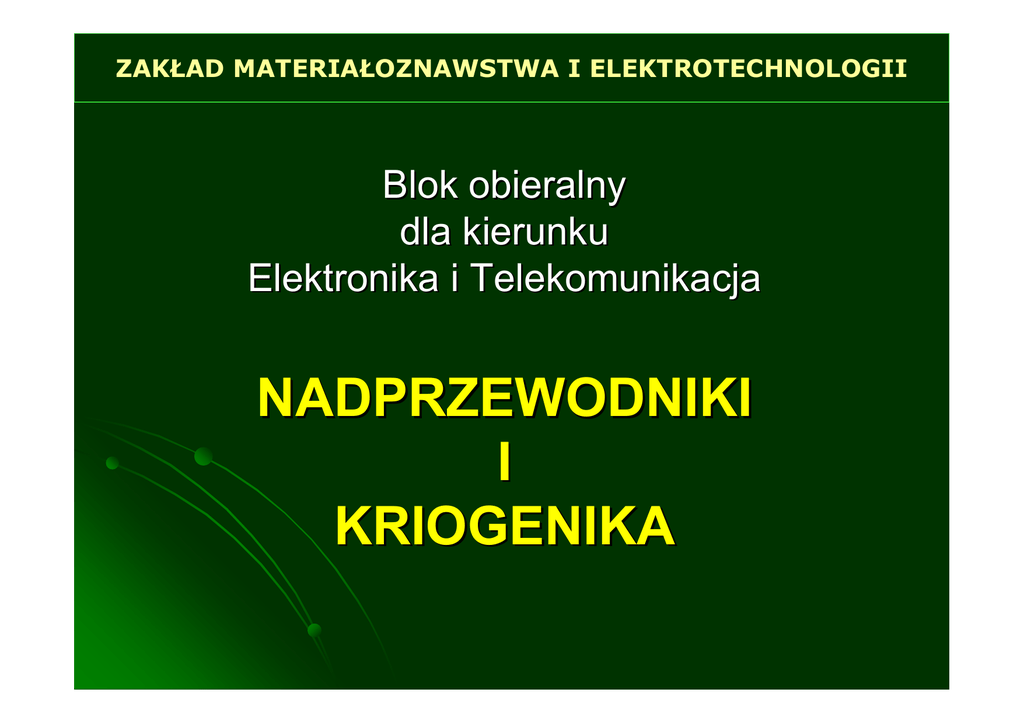 ZAKŁAD MATERIAŁOZNAWSTWA I ELEKTROTECHNOLOGII Blok obieralny dla kierunku Elektronika i Telekomunikacja NADPRZEWODNIKI I KRIOGENIKA ZAKŁAD MATERIAŁOZNAWSTWA I ELEKTROTECHNOLOGII NADPRZEWODNIKI i KRIOGENIKA Przedmioty: Nadprzewodnictwo – 30 h wykładu + 15 h laboratorium Podstawy kriogeniki – 30 h wykładu + 15 h laboratorium Urządzenia nadprzewodnikowe – 15 h wykładu Modelowanie układów kriogenicznych i nadprzewodnikowych – 15 h laboratorium ZAKŁAD MATERIAŁOZNAWSTWA I ELEKTROTECHNOLOGII NADPRZEWODNICTWO PROGRAM PRZEDMIOTU: WYKŁAD: Właściwości nadprzewodników – zerowa rezystywność, idealny diamagnetyzm. Materiały nadprzewodnikowe – historia odkryć. Termodynamika stanu nadprzewodnictwa. Teorie nadprzewodnictwa – wybrane zagadnienia. Nadprzewodniki I-go i II-go rodzaju. Stan mieszany, wiry Abrikosowa. Zastosowania materiałów nadprzewodnikowych. Technologie wytwarzania materiałów nadprzewodnikowych: masywna ceramika, taśmy i druty nadprzewodnikowe. LABORATORIUM: Obserwacje zjawiska Meisnera i lewitacji. Wyznaczanie prądów krytycznych wysokotemperaturowych materiałów nadprzewodnikowych. Badanie wpływu pola magnetycznego na właściwości elektryczne nadprzewodników. Badanie zjawiska ekranowania pola magnetycznego w pierścieniu nadprzewodnikowym. Wyznaczanie charakterystyk temperaturowych materiałów nadprzewodnikowych. Wytwarzanie ceramiki YBaCuO, technologie wytwarzania taśm i drutów nadprzewodzących. ZAKŁAD MATERIAŁOZNAWSTWA I ELEKTROTECHNOLOGII PODSTAWY KRIOGENIKI PROGRAM PRZEDMIOTU: WYKŁAD: Metody uzyskiwania temperatur kriogenicznych - termodynamika procesów. Ciecze kriogeniczne – wytwarzanie, właściwości, transport, przechowywanie. Chłodziarki kriogeniczne. Metody chłodzenia: kontaktowe, w cieczy, w atmosferze gazowej. Pomiary niskotemperaturowe. LABORATORIUM: Kriostaty zalewowe. Kriostaty kontaktowe. Pomiar niskich temperatur. Badanie właściwości elektrycznych materiałów w niskich temperaturach. Badanie właściwości elementów półprzewodnikowych w niskich temperaturach. ZAKŁAD MATERIAŁOZNAWSTWA I ELEKTROTECHNOLOGII URZĄDZENIA NADPRZEWODNIKOWE PROGRAM PRZEDMIOTU: WYKŁAD: Druty i taśmy nadprzewodnikowe. Kable nadprzewodnikowe, transformatory, silniki elektryczne - przesył energii elektrycznej. Elektromagnesy nadprzewodnikowe – wytwarzanie silnych pól magnetycznych, transport. Nadprzewodnikowe zasobniki energii, nadprzewodnikowe ograniczniki prądu zwarciowego – poprawa jakości energii elektrycznej. Łożyska nadprzewodnikowe – lewitacja. SQUID-y – detekcja i pomiar ultramałych pól magnetycznych. Złącza Josephsona – źródła napięcia wzorcowego. Tranzystory nadprzewodnikowe. ZAKŁAD MATERIAŁOZNAWSTWA I ELEKTROTECHNOLOGII MODELOWANIE UKŁADÓW KRIOGENICZNYCH I NADPRZEWODNIKOWYCH PROGRAM PRZEDMIOTU: LABORATORIUM: Właściwości materiałów w temperaturach kriogenicznych – anomalie. Charakterystyki niskotemperaturowe parametrów materiałowych. Symulacje chłodzenia obiektów metodą kontaktową. Symulacje chłodzenia obiektów zanurzonych we wrzącej cieczy kriogenicznej. Symulacje chłodzenia obiektów umieszczonych w gazie buforowym. Symulacje procesów cieplnych w nadprzewodnikach.