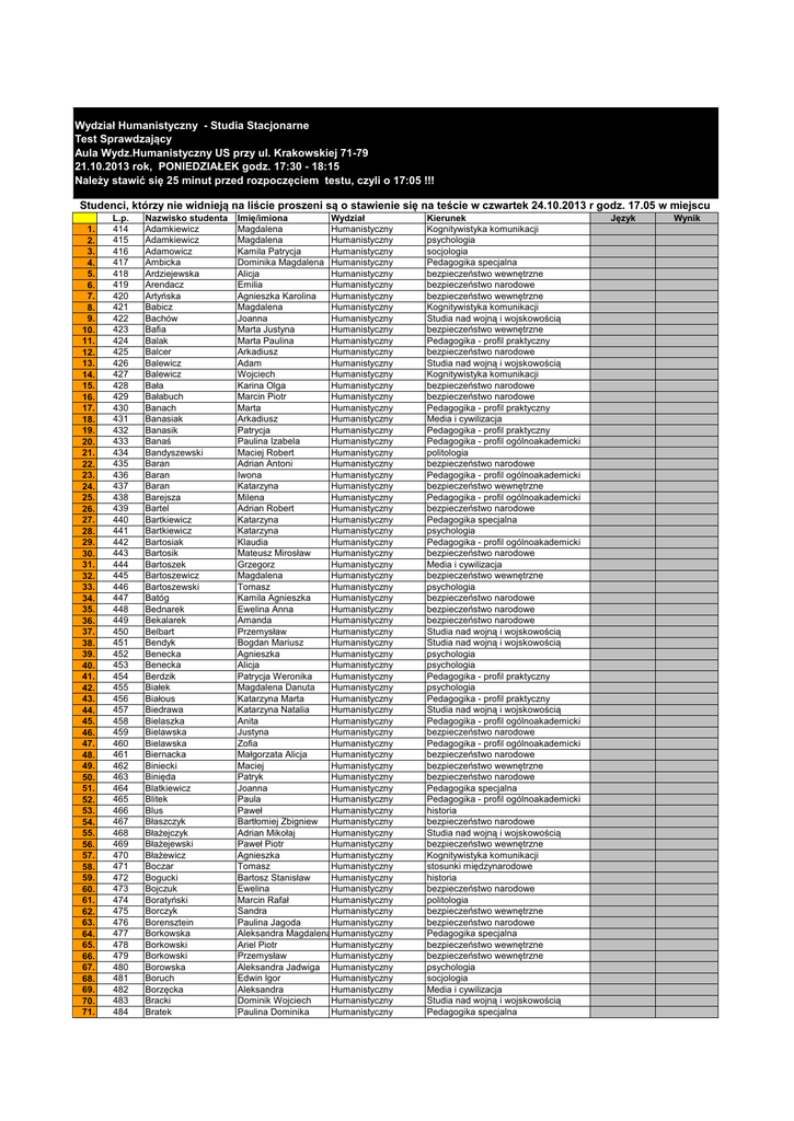 Wydział Humanistyczny - Studia Stacjonarne Test Sprawdzający Aula Wydz.Humanistyczny US przy ul. Krakowskiej 71-79 21.10.2013 rok, PONIEDZIAŁEK godz. 17:30 - 18:15 Należy stawić się 25 minut przed rozpoczęciem testu, czyli o 17:05 !!! Studenci, którzy nie widnieją na liście proszeni są o stawienie się na teście w czwartek 24.10.2013 r godz. 17.05 w miejscu 1. 2. 3. 4. 5. 6. 7. 8. 9. 10. 11. 12. 13. 14. 15. 16. 17. 18. 19. 20. 21. 22. 23. 24. 25. 26. 27. 28. 29. 30. 31. 32. 33. 34. 35. 36. 37. 38. 39. 40. 41. 42. 43. 44. 45. 46. 47. 48. 49. 50. 51. 52. 53. 54. 55. 56. 57. 58. 59. 60. 61. 62. 63. 64. 65. 66. 67. 68. 69. 70. 71. L.p. 414 415 416 417 418 419 420 421 422 423 424 425 426 427 428 429 430 431 432 433 434 435 436 437 438 439 440 441 442 443 444 445 446 447 448 449 450 451 452 453 454 455 456 457 458 459 460 461 462 463 464 465 466 467 468 469 470 471 472 473 474 475 476 477 478 479 480 481 482 483 484 Nazwisko studenta Adamkiewicz Adamkiewicz Adamowicz Ambicka Ardziejewska Arendacz Artyńska Babicz Bachów Bafia Balak Balcer Balewicz Balewicz Bała Bałabuch Banach Banasiak Banasik Banaś Bandyszewski Baran Baran Baran Barejsza Bartel Bartkiewicz Bartkiewicz Bartosiak Bartosik Bartoszek Bartoszewicz Bartoszewski Batóg Bednarek Bekalarek Belbart Bendyk Benecka Benecka Berdzik Białek Białous Biedrawa Bielaszka Bielawska Bielawska Biernacka Biniecki Binięda Blatkiewicz Blitek Blus Błaszczyk Błażejczyk Błażejewski Błażewicz Boczar Bogucki Bojczuk Boratyński Borczyk Borensztein Borkowska Borkowski Borkowski Borowska Boruch Borzęcka Bracki Bratek Imię/imiona Wydział Magdalena Humanistyczny Magdalena Humanistyczny Kamila Patrycja Humanistyczny Dominika Magdalena Humanistyczny Alicja Humanistyczny Emilia Humanistyczny Agnieszka Karolina Humanistyczny Magdalena Humanistyczny Joanna Humanistyczny Marta Justyna Humanistyczny Marta Paulina Humanistyczny Arkadiusz Humanistyczny Adam Humanistyczny Wojciech Humanistyczny Karina Olga Humanistyczny Marcin Piotr Humanistyczny Marta Humanistyczny Arkadiusz Humanistyczny Patrycja Humanistyczny Paulina Izabela Humanistyczny Maciej Robert Humanistyczny Adrian Antoni Humanistyczny Iwona Humanistyczny Katarzyna Humanistyczny Milena Humanistyczny Adrian Robert Humanistyczny Katarzyna Humanistyczny Katarzyna Humanistyczny Klaudia Humanistyczny Mateusz Mirosław Humanistyczny Grzegorz Humanistyczny Magdalena Humanistyczny Tomasz Humanistyczny Kamila Agnieszka Humanistyczny Ewelina Anna Humanistyczny Amanda Humanistyczny Przemysław Humanistyczny Bogdan Mariusz Humanistyczny Agnieszka Humanistyczny Alicja Humanistyczny Patrycja Weronika Humanistyczny Magdalena Danuta Humanistyczny Katarzyna Marta Humanistyczny Katarzyna Natalia Humanistyczny Anita Humanistyczny Justyna Humanistyczny Zofia Humanistyczny Małgorzata Alicja Humanistyczny Maciej Humanistyczny Patryk Humanistyczny Joanna Humanistyczny Paula Humanistyczny Paweł Humanistyczny Bartłomiej Zbigniew Humanistyczny Adrian Mikołaj Humanistyczny Paweł Piotr Humanistyczny Agnieszka Humanistyczny Tomasz Humanistyczny Bartosz Stanisław Humanistyczny Ewelina Humanistyczny Marcin Rafał Humanistyczny Sandra Humanistyczny Paulina Jagoda Humanistyczny Aleksandra MagdalenaHumanistyczny Ariel Piotr Humanistyczny Przemysław Humanistyczny Aleksandra Jadwiga Humanistyczny Edwin Igor Humanistyczny Aleksandra Humanistyczny Dominik Wojciech Humanistyczny Paulina Dominika Humanistyczny Kierunek Kognitywistyka komunikacji psychologia socjologia Pedagogika specjalna bezpieczeństwo wewnętrzne bezpieczeństwo narodowe bezpieczeństwo wewnętrzne Kognitywistyka komunikacji Studia nad wojną i wojskowością bezpieczeństwo wewnętrzne Pedagogika - profil praktyczny bezpieczeństwo narodowe Studia nad wojną i wojskowością Kognitywistyka komunikacji bezpieczeństwo narodowe bezpieczeństwo narodowe Pedagogika - profil praktyczny Media i cywilizacja Pedagogika - profil praktyczny Pedagogika - profil ogólnoakademicki politologia bezpieczeństwo narodowe Pedagogika - profil ogólnoakademicki bezpieczeństwo wewnętrzne Pedagogika - profil ogólnoakademicki bezpieczeństwo narodowe Pedagogika specjalna psychologia Pedagogika - profil ogólnoakademicki bezpieczeństwo narodowe Media i cywilizacja bezpieczeństwo wewnętrzne psychologia bezpieczeństwo narodowe bezpieczeństwo narodowe bezpieczeństwo narodowe Studia nad wojną i wojskowością Studia nad wojną i wojskowością psychologia psychologia Pedagogika - profil praktyczny psychologia Pedagogika - profil praktyczny Studia nad wojną i wojskowością Pedagogika - profil ogólnoakademicki bezpieczeństwo narodowe Pedagogika - profil ogólnoakademicki bezpieczeństwo narodowe bezpieczeństwo wewnętrzne bezpieczeństwo narodowe Pedagogika specjalna Pedagogika - profil ogólnoakademicki historia bezpieczeństwo narodowe Studia nad wojną i wojskowością bezpieczeństwo wewnętrzne Kognitywistyka komunikacji stosunki międzynarodowe historia bezpieczeństwo narodowe politologia bezpieczeństwo wewnętrzne bezpieczeństwo narodowe Pedagogika specjalna bezpieczeństwo wewnętrzne bezpieczeństwo wewnętrzne psychologia socjologia Media i cywilizacja Studia nad wojną i wojskowością Pedagogika specjalna Język Wynik 72. 73. 74. 75. 76. 77. 78. 79. 80. 81. 82. 83. 84. 85. 86. 87. 88. 89. 90. 91. 92. 93. 94. 95. 96. 97. 98. 99. 100. 101. 102. 103. 104. 105. 106. 107. 108. 109. 110. 111. 112. 113. 114. 115. 116. 117. 118. 119. 120. 121. 122. 123. 124. 125. 126. 127. 128. 129. 130. 131. 132. 133. 134. 135. 136. 137. 138. 139. 140. 141. 142. 143. 144. 145. 146. 147. 148. 149. 150. 151. 152. 153. 485 486 487 488 489 490 491 492 493 494 495 496 497 498 499 500 501 502 503 504 505 506 507 508 509 510 511 512 513 514 515 516 517 518 519 520 521 522 523 524 525 526 527 528 529 530 531 532 533 534 535 536 537 538 539 540 541 542 543 544 545 546 547 548 549 550 551 552 553 554 555 556 557 558 559 560 561 562 563 564 565 566 Brodniak Brodzińska Bronie