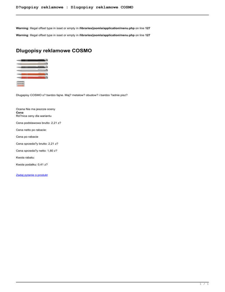 D?ugopisy reklamowe : Dlugopisy reklamowe COSMO Warning: Illegal offset type in isset or empty in /libraries/joomla/application/menu.php on line 127 Warning: Illegal offset type in isset or empty in /libraries/joomla/application/menu.php on line 127 Dlugopisy reklamowe COSMO Dlugapisy COSMO s? bardzo fajne. Maj? metalow? obudow? i bardzo ?adnie pisz? Ocena Nie ma jeszcze oceny Cena Ró?nica ceny dla wariantu Cena podstawowa brutto: 2,21 z? Cena netto po rabacie: Cena po rabacie Cena sprzeda?y brutto: 2,21 z? Cena sprzeda?y netto: 1,80 z? Kwota rabatu: Kwota podatku: 0,41 z? Zadaj pytanie o produkt 1 / 1 Powered by TCPDF (www.tcpdf.org)