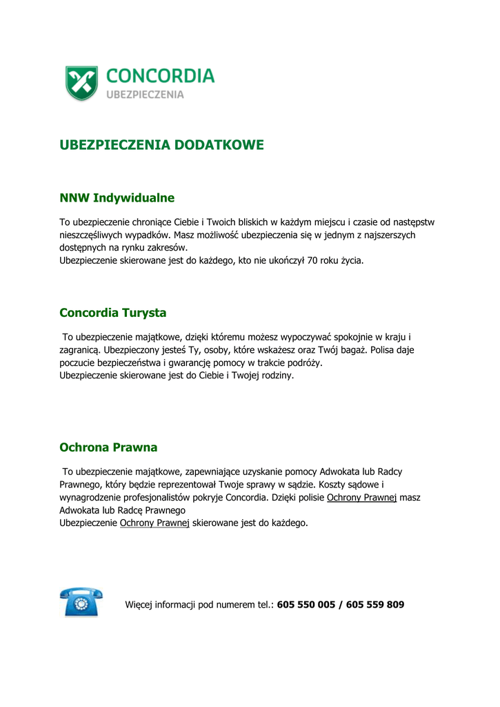 UBEZPIECZENIA DODATKOWE NNW Indywidualne To ubezpieczenie chroniące Ciebie i Twoich bliskich w każdym miejscu i czasie od następstw nieszczęśliwych wypadków. Masz możliwość ubezpieczenia się w jednym z najszerszych dostępnych na rynku zakresów. Ubezpieczenie skierowane jest do każdego, kto nie ukończył 70 roku życia. Concordia Turysta To ubezpieczenie majątkowe, dzięki któremu możesz wypoczywać spokojnie w kraju i zagranicą. Ubezpieczony jesteś Ty, osoby, które wskażesz oraz Twój bagaż. Polisa daje poczucie bezpieczeństwa i gwarancję pomocy w trakcie podróży. Ubezpieczenie skierowane jest do Ciebie i Twojej rodziny. Ochrona Prawna To ubezpieczenie majątkowe, zapewniające uzyskanie pomocy Adwokata lub Radcy Prawnego, który będzie reprezentował Twoje sprawy w sądzie. Koszty sądowe i wynagrodzenie profesjonalistów pokryje Concordia. Dzięki polisie Ochrony Prawnej masz Adwokata lub Radcę Prawnego Ubezpieczenie Ochrony Prawnej skierowane jest do każdego. Więcej informacji pod numerem tel.: 605 550 005 / 605 559 809