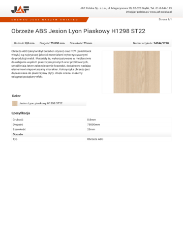 JAF Polska Sp. z o.o., ul. Magazynowa 19, 62-023 Gądki, Tel. 61-8-144-113 [email protected], www.jaf-polska.pl Strona 1/1 Obrzeże ABS Jesion Lyon Piaskowy H1298 ST22 Grubość 0,8 mm Długość 75 000 mm Szerokość 23 mm Obrzeża ABS (akrylonitryl butadien styren) oraz PCV (polichlorek winylu) są najwyższej jakości materiałami wykorzystywanymi do produkcji mebli. Materiały te, wykorzystywane w meblarstwie do oklejania wąskich płaszczyzn prostych oraz profilowanych, umożliwiają łatwe zabezpieczenie krawędzi, dodatkowo nadając elementowi niepowtarzalny charakter. Kolorystyka obrzeża jest dopasowana do płaszczyzny płyty, dzięki czemu możemy osiągnąć pożądany efekt. Dekor Jesion Lyon piaskowy H1298 ST22 Specyfikacja Grubość 0.8mm Długość 75000mm Szerokość 23mm Obrzeże Typ Obrzeże ABS Numer artykułu: 24744/1298