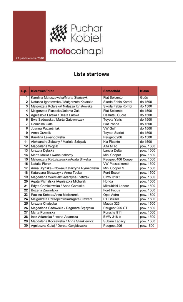 23 października 2010 Lista startowa L.p. 1 2 3 4 5 6 7 8 9 10 11 12 13 14 15 16 17 18 19 20 21 22 23 24 25 26 27 28 29 30 Kierowca/Pilot Samochód Klasa Karolina Matuszewska/Marta Stańczyk Natasza Ignatowska / Małgorzata Kolarska Małgorzata Kolarska/ Natasza Ignatowska Małgorzata Piasecka/Jolanta śuk Agnieszka Larska / Beata Larska Ewa Sadowska / Marta Gajowniczek Dominika Gała Joanna Pacześniak Anna Grzesik Karolina Lewandowska Aleksandra śelazny / Mariola Szlęzak Magdalena Wójcik Urszula Dębska Marta Molka / Iwona Łakomy Małgorzata Radziszewska/Agata Śliwska Natalia Florek Anna Bryńska - Nowak/Katarzyna Rymkowska Katarzyna Błaszczyk / Anna Tocka Magdalena Wierciak/Katarzyna Pietrzak Agata Michalska /Agnieszka Michalak Edyta Chmielewska / Anna Góralska BoŜena Zawadzka Paulina Sobota/Anna Mielczarek Małgorzata Szczepkowska/Agata Stawarz Urszula Chajęcka Magdalena Sadowska / Dagmara StęŜycka Marta Pomorska Inez Adamska / Iwona Adamska Magdalena Koczewska / Anna Stankiewicz Agnieszka Gułaj / Dorota Gołębiewska Fiat Seicento Skoda Fabia Kombi Skoda Fabia Kombi Fiat Seicento Daihatsu Cuore Toyota Yaris Fiat Panda VW Golf Toyota Starlet Peugeot 206 Kia Picanto Alfa MiTo Lancia Delta Mini Cooper Peugoet 406 Coupe VW Passat kombi Mini Cooper S Ford Escort BMW 318 ti Honda Mitsubishi Lancer Ford Focus Opel Astra PT Cruiser Mazda 323 Peugeot 205 GTI Porsche 911 BMW 318 is Subaru Legacy Peugeot 206 Gość do 1500 do 1500 do 1500 do 1500 do 1500 do 1500 do 1500 do 1500 do 1500 do 1500 pow. 1500 pow. 1500 pow. 1500 pow. 1500 pow. 1500 pow. 1500 pow. 1500 pow. 1500 pow. 1500 pow. 1500 pow. 1500 pow. 1500 pow. 1500 pow. 1500 pow. 1500 pow. 1500 pow. 1500 pow. 1500 pow.1500