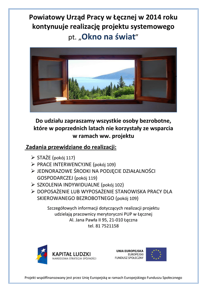 Powiatowy Urząd Pracy w Łęcznej w 2014 roku kontynuuje realizację projektu systemowego pt. „Okno na świat” Do udziału zapraszamy wszystkie osoby bezrobotne, które w poprzednich latach nie korzystały ze wsparcia w ramach ww. projektu Zadania przewidziane do realizacji: STAŻE (pokój 117) PRACE INTERWENCYJNE (pokój 109) JEDNORAZOWE ŚRODKI NA PODJĘCIE DZIAŁALNOŚCI GOSPODARCZEJ (pokój 119) SZKOLENIA INDYWIDUALNE (pokój 102) DOPOSAŻENIE LUB WYPOSAŻENIE STANOWISKA PRACY DLA SKIEROWANEGO BEZROBOTNEGO (pokój 109) Szczegółowych informacji dotyczących realizacji projektu udzielają pracownicy merytoryczni PUP w Łęcznej Al. Jana Pawła II 95, 21-010 Łęczna tel. 81 7521158 Projekt współfinansowany jest przez Unię Europejską w ramach Europejskiego Funduszu Społecznego