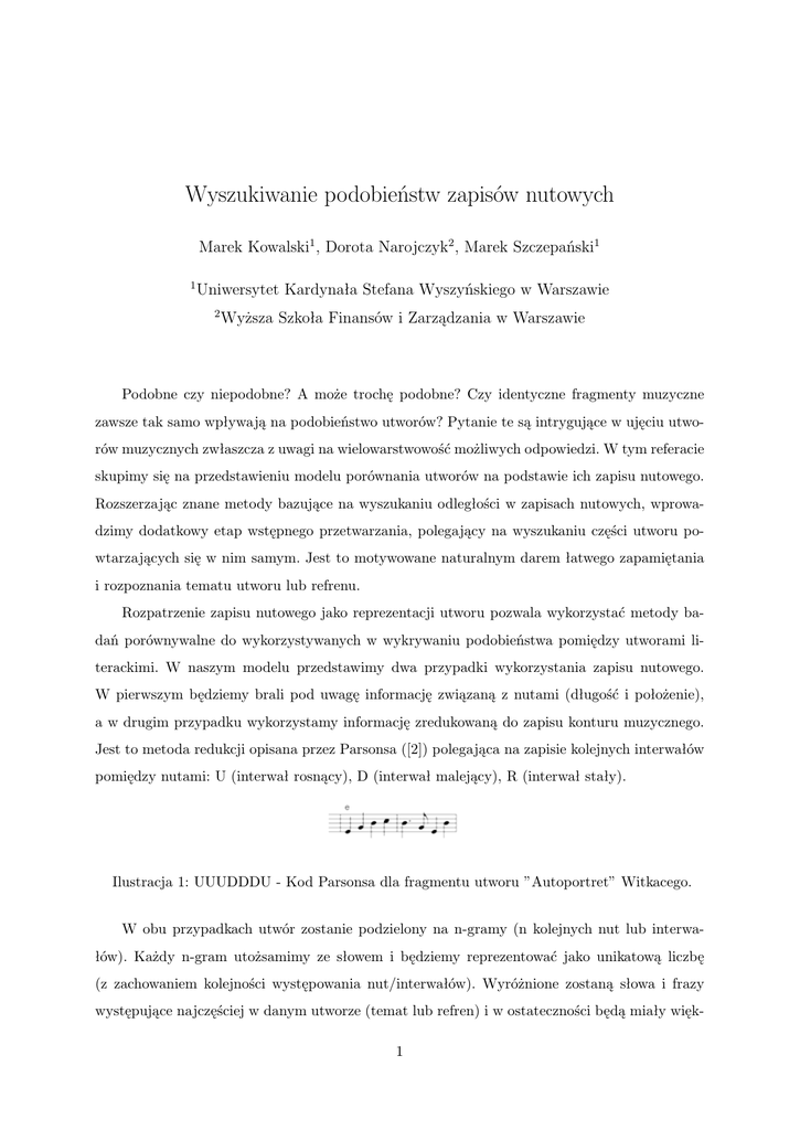 Wyszukiwanie podobieństw zapisów nutowych Marek Kowalski1 , Dorota Narojczyk2 , Marek Szczepański1 1 Uniwersytet Kardynała Stefana Wyszyńskiego w Warszawie 2 Wyższa Szkoła Finansów i Zarządzania w Warszawie Podobne czy niepodobne? A może trochę podobne? Czy identyczne fragmenty muzyczne zawsze tak samo wpływają na podobieństwo utworów? Pytanie te są intrygujące w ujęciu utworów muzycznych zwłaszcza z uwagi na wielowarstwowość możliwych odpowiedzi. W tym referacie skupimy się na przedstawieniu modelu porównania utworów na podstawie ich zapisu nutowego. Rozszerzając znane metody bazujące na wyszukaniu odległości w zapisach nutowych, wprowadzimy dodatkowy etap wstępnego przetwarzania, polegający na wyszukaniu części utworu powtarzających się w nim samym. Jest to motywowane naturalnym darem łatwego zapamiętania i rozpoznania tematu utworu lub refrenu. Rozpatrzenie zapisu nutowego jako reprezentacji utworu pozwala wykorzystać metody badań porównywalne do wykorzystywanych w wykrywaniu podobieństwa pomiędzy utworami literackimi. W naszym modelu przedstawimy dwa przypadki wykorzystania zapisu nutowego. W pierwszym będziemy brali pod uwagę informację związaną z nutami (długość i położenie), a w drugim przypadku wykorzystamy informację zredukowaną do zapisu konturu muzycznego. Jest to metoda redukcji opisana przez Parsonsa ([2]) polegająca na zapisie kolejnych interwałów pomiędzy nutami: U (interwał rosnący), D (interwał malejący), R (interwał stały). Ilustracja 1: UUUDDDU - Kod Parsonsa dla fragmentu utworu ”Autoportret” Witkacego. W obu przypadkach utwór zostanie podzielony na n-gramy (n kolejnych nut lub interwałów). Każdy n-gram utożsamimy ze słowem i będziemy reprezentować jako unikatową liczbę (z zachowaniem kolejności występowania nut/interwałów). Wyróżnione zostaną słowa i frazy występujące najczęściej w danym utworze (temat lub refren) i w ostateczności będą miały więk1 sze znaczenie przy końcowej decyzji o podobieństwie utworów. Do oceny podobieństwa poszczególnych części utworów użyjemy miary Jaccarda: J(A, B) = |A∩B | , |A∪B | gdzie A i B to zbiory n-gramów określające te części. Ostateczna decyzja o podobieństwie utworów zostanie podjęta z wykorzystaniem logiki rozmytej ([1], [3]). Do budowy reguł decyzyjnych zostanie wykorzystany model wpływu bazujący na wyznaczonych wcześniej miarach podobieństwa poszczególnych części utworów. Końcowy wynik zostanie podany w skali słownej określającej podobieństwo. Podsumowaniem będzie eksperyment zbadania losowej próby utworów pod względem podobieństwa przez stworzony system komputerowy oraz przez losową grupę badanych osób. Celem eksperymentu będzie porównanie rozpoznawania podobieństwa utworów przez człowieka i maszynę. Literatura [1] S. Alzahrani, N. Salim, Fuzzy Semantic-Based String Similarity for Extrinsic Plagiarism Detection, Lab Report for PAN at CLEF, 2010. [2] D. Parsons, The directory of tunes and musical themes. New York: Spencer Brown, 1975. [3] L. Suanmali, N. Salim, M. S. Binwahlan, Fuzzy Logic Based Method for Improving Text Summarization, International Journal of Computer Science and Information Security, Vol. 2, No. 1, 2009. 2