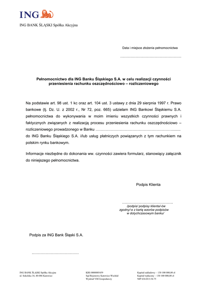 ING BANK ŚLĄSKI Spółka Akcyjna Data i miejsce złożenia pełnomocnictwa ………………………………………… Pełnomocnictwo dla ING Banku Śląskiego S.A. w celu realizacji czynności przeniesienia rachunku oszczędnościowo – rozliczeniowego Na podstawie art. 98 ust. 1 kc oraz art. 104 ust. 3 ustawy z dnia 29 sierpnia 1997 r. Prawo bankowe (tj. Dz. U. z 2002 r., Nr 72, poz. 665) udzielam ING Bankowi Śląskiemu S.A. pełnomocnictwa do wykonywania w moim imieniu wszystkich czynności prawnych i faktycznych związanych z realizacją procesu przeniesienia rachunku oszczędnościowo – rozliczeniowego prowadzonego w Banku ……………………………………………………........ do ING Banku Śląskiego S.A. i/lub usług płatniczych powiązanych z tym rachunkiem na polskim rynku bankowym. Informacje niezbędne do dokonania ww. czynności zawiera formularz, stanowiący załącznik do niniejszego pełnomocnictwa. Podpis Klienta …………………………………. /podpis/ podpisy klienta/-ów zgodny/-e z kartą wzorów podpisów w dotychczasowym banku/ Podpis za ING Bank Śląski S.A. .……………………………… ING BANK ŚLĄSKI Spółka Akcyjna ul. Sokolska 34, 40-086 Katowice KRS 0000005459 Sąd Rejonowy Katowice-Wschód Wydział VIII Gospodarczy Kapitał zakładowy – 130 100 000,00 zł Kapitał wpłacony – 130 100 000,00 zł NIP 634-013-54-75