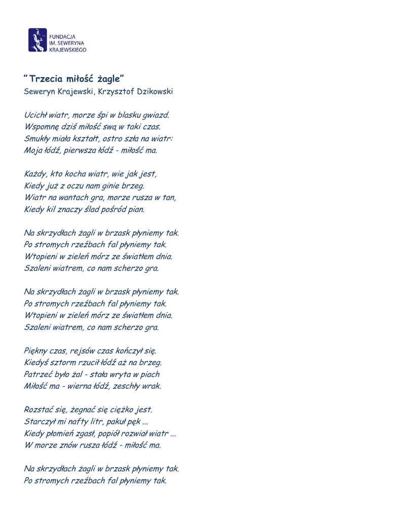 ” Trzecia miłość żagle”” Seweryn Krajewski, Krzysztof Dzikowski Ucichł wiatr, morze śpi w blasku gwiazd. Wspomnę dziś miłość swą w taki czas. Smukły miała kształt, ostro szła na wiatr: Moja łódź, pierwsza łódź - miłość ma. Każdy, kto kocha wiatr, wie jak jest, Kiedy już z oczu nam ginie brzeg. Wiatr na wantach gra, morze rusza w tan, Kiedy kil znaczy ślad pośród pian. Na skrzydłach żagli w brzask płyniemy tak. Po stromych rzeźbach fal płyniemy tak. Wtopieni w zieleń mórz ze światłem dnia. Szaleni wiatrem, co nam scherzo gra. Na skrzydłach żagli w brzask płyniemy tak. Po stromych rzeźbach fal płyniemy tak. Wtopieni w zieleń mórz ze światłem dnia. Szaleni wiatrem, co nam scherzo gra. Piękny czas, rejsów czas kończył się. Kiedyś sztorm rzucił łódź aż na brzeg. Patrzeć było żal - stała wryta w piach Miłość ma - wierna łódź, zeschły wrak. Rozstać się, żegnać się ciężko jest. Starczył mi nafty litr, pakuł pęk ... Kiedy płomień zgasł, popiół rozwiał wiatr ... W morze znów rusza łódź - miłość ma. Na skrzydłach żagli w brzask płyniemy tak. Po stromych rzeźbach fal płyniemy tak. Wtopieni w zieleń mórz ze światłem dnia. Szaleni wiatrem, co nam scherzo gra. Gra, gra. Na skrzydłach żagli w brzask płyniemy tak. Po stromych rzeźbach fal płyniemy tak. Wtopieni w zieleń mórz ze światłem dnia. Szaleni wiatrem, co nam scherzo gra.