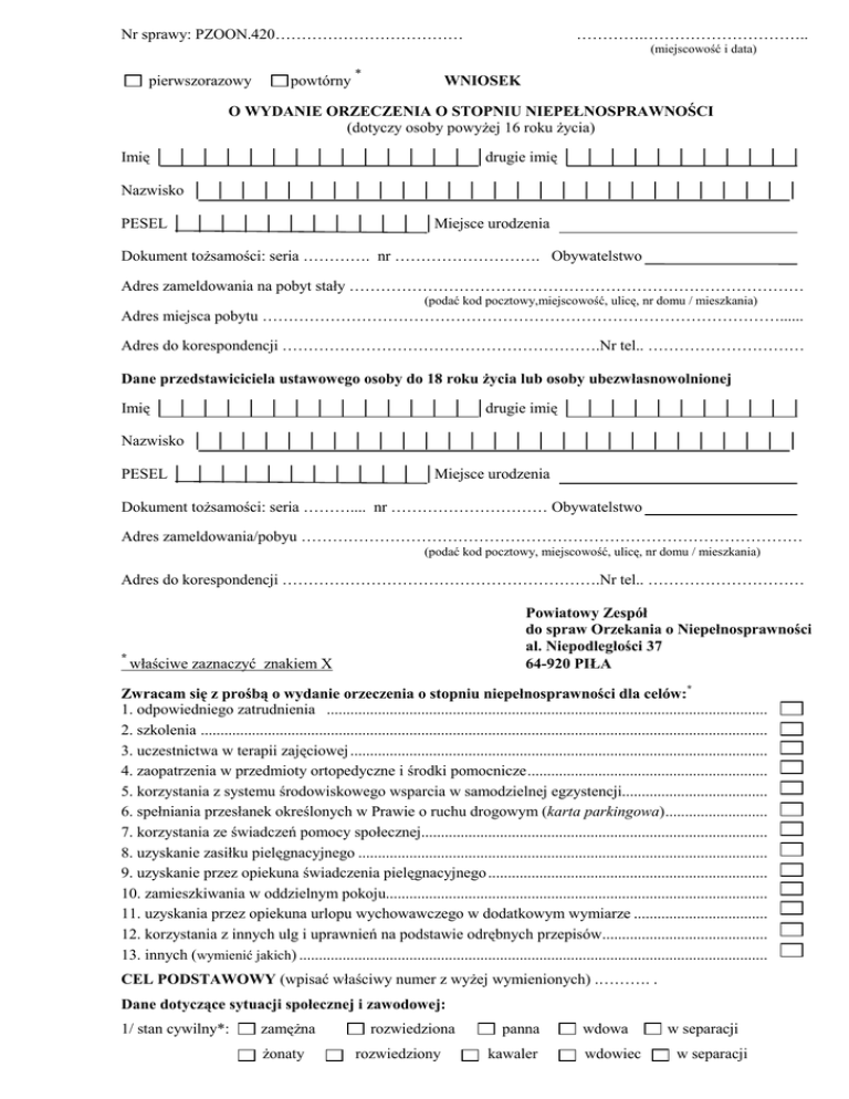 Nr sprawy: PZOON.420……………………………… ………….………………………….. (miejscowość i data) pierwszorazowy powtórny * WNIOSEK O WYDANIE ORZECZENIA O STOPNIU NIEPEŁNOSPRAWNOŚCI (dotyczy osoby powyżej 16 roku życia) Imię │ │ │ │ │ │ │ │ │ │ │ │ │ │ │drugie imię │ │ │ │ │ │ │ │ │ │ │ Nazwisko │ │ │ │ │ │ │ │ │ │ │ │ │ │ │ │ │ │ │ │ │ │ │ │ │ │ │ PESEL │ │ │ │ │ │ │ │ │ │ │ │Miejsce urodzenia Dokument tożsamości: seria …………. nr ………………………. Obywatelstwo Adres zameldowania na pobyt stały …………………………………………………………………………… (podać kod pocztowy,miejscowość, ulicę, nr domu / mieszkania) Adres miejsca pobytu ………………………………………………………………………………………...... Adres do korespondencji …………………………………………………….Nr tel.. ………………………… Dane przedstawiciciela ustawowego osoby do 18 roku życia lub osoby ubezwłasnowolnionej Imię │ │ │ │ │ │ │ │ │ │ │ │ │ │ │drugie imię │ │ │ │ │ │ │ │ │ │ │ Nazwisko │ │ │ │ │ │ │ │ │ │ │ │ │ │ │ │ │ │ │ │ │ │ │ │ │ │ │ PESEL │ │ │ │ │ │ │ │ │ │ │ │Miejsce urodzenia Dokument tożsamości: seria ……….... nr ………………………… Obywatelstwo Adres zameldowania/pobyu …………………………………………………………………………………… (podać kod pocztowy, miejscowość, ulicę, nr domu / mieszkania) Adres do korespondencji …………………………………………………….Nr tel.. ………………………… * Powiatowy Zespół do spraw Orzekania o Niepełnosprawności al. Niepodległości 37 64-920 PIŁA właściwe zaznaczyć znakiem X Zwracam się z prośbą o wydanie orzeczenia o stopniu niepełnosprawności dla celów:* 1. odpowiedniego zatrudnienia ................................................................................................................ 2. szkolenia ................................................................................................................................................ 3. uczestnictwa w terapii zajęciowej .......................................................................................................... 4. zaopatrzenia w przedmioty ortopedyczne i środki pomocnicze ............................................................. 5. korzystania z systemu środowiskowego wsparcia w samodzielnej egzystencji..................................... 6. spełniania przesłanek określonych w Prawie o ruchu drogowym (karta parkingowa) .......................... 7. korzystania ze świadczeń pomocy społecznej........................................................................................ 8. uzyskanie zasiłku pielęgnacyjnego ........................................................................................................ 9. uzyskanie przez opiekuna świadczenia pielęgnacyjnego ....................................................................... 10. zamieszkiwania w oddzielnym pokoju................................................................................................. 11. uzyskania przez opiekuna urlopu wychowawczego w dodatkowym wymiarze .................................. 12. korzystania z innych ulg i uprawnień na podstawie odrębnych przepisów.......................................... 13. innych (wymienić jakich) ....................................................................................................................... CEL PODSTAWOWY (wpisać właściwy numer z wyżej wymienionych) .………. . Dane dotyczące sytuacji społecznej i zawodowej: 1/ stan cywilny*: zamężna żonaty rozwiedziona rozwiedziony panna kawaler wdowa wdowiec w separacji w separacji 2/ zdolność do samodzielnego funkcjonowania*: a) wykonywanie czynności samoobsługowych: samodzielnie z pomocą konieczna opieka, b) poruszanie się: samodzielnie z pomocą konieczna opieka, c) prowadzenie gospodarstwa domowego: samodzielnie z pomocą konieczna opieka, 3/ wykształcenie*: bez wykształcenia podstawowe zasadnicze średnie wyższe 4/ zawód wyuczony ………………………………... 5/ zawód wykonywany ……………………………….. 6/ aktualne zatrudnienie ......................................................................................................................................... 7/ korzystanie ze sprzętu rehabilitacyjnego, ortopedycznego (jakiego?).............................................................. . Oświadczam, że*: pobieram emeryturę rentę - podać z jakiej instytucji (ZUS, KRUS, MON, MSWiA) ............................... aktualnie nie toczy się toczy się w mojej sprawie postępowanie przed innym organem orzeczniczym,podać jakim (ZUS, Sąd Pracy, Wojewódzki Zespół) ....................................................................... nie posiadam posiadam orzeczenie (podać przez kogo wydane i do kiedy jest ważne) ............................ .................................................................................................................................................................................. nie składałem(am) składałem(am) wniosek o wydanie orzeczenia o stopniu niepełnosprawności (podać rok i nazwę powiatowego zespołu) .............................................................................................................. Na posiedzenie składu orzekającego*: mogę przybyć, nie mogę przybyć (w tym przypadku należy dołączyć zaświadczenie lekarskie potwierdzające niemożność wzięcia udziału z powodu długotrwałej i nie rokującej poprawy choroby). W związku z p