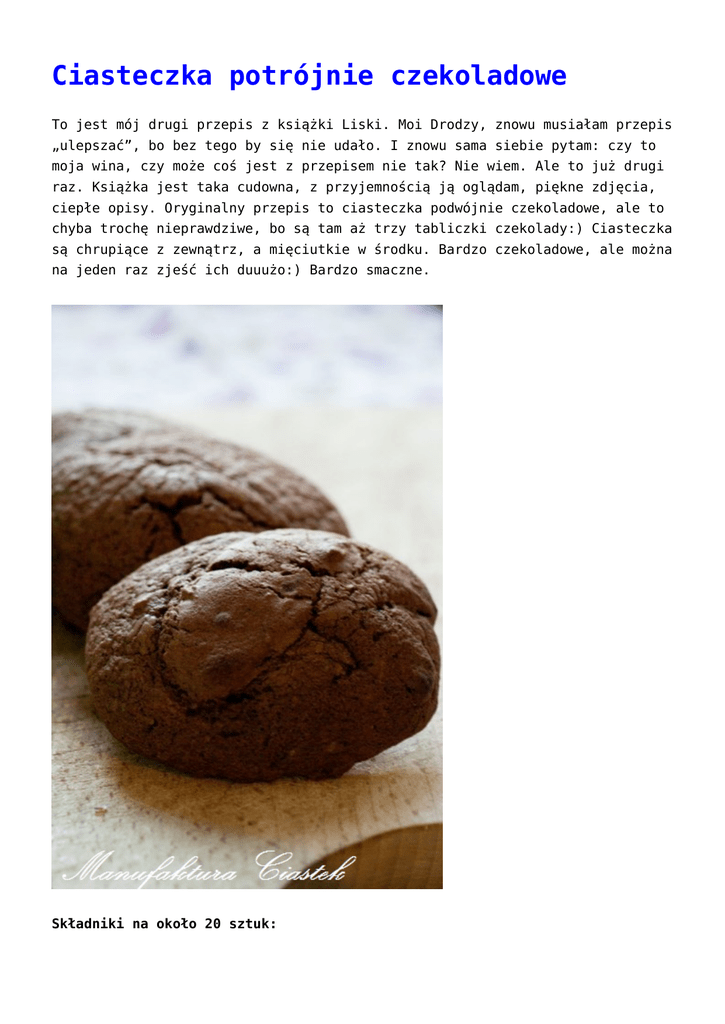 Ciasteczka potrójnie czekoladowe To jest mój drugi przepis z książki Liski. Moi Drodzy, znowu musiałam przepis „ulepszać”, bo bez tego by się nie udało. I znowu sama siebie pytam: czy to moja wina, czy może coś jest z przepisem nie tak? Nie wiem. Ale to już drugi raz. Książka jest taka cudowna, z przyjemnością ją oglądam, piękne zdjęcia, ciepłe opisy. Oryginalny przepis to ciasteczka podwójnie czekoladowe, ale to chyba trochę nieprawdziwe, bo są tam aż trzy tabliczki czekolady:) Ciasteczka są chrupiące z zewnątrz, a mięciutkie w środku. Bardzo czekoladowe, ale można na jeden raz zjeść ich duuużo:) Bardzo smaczne. Składniki na około 20 sztuk: 200 g mąki (w oryginalnym przepisie jest tylko 100 g, ale ciasto jest zbyt rzadkie) 1/4 łyżeczki proszku do pieczenia 1/4 łyżeczki sody oczyszczonej 200 g gorzkiej czekolady 100 g drobn posiekanej gorzkiej czekolady 3 jajka 180 g cukru trzcinowego 100 g masła Przygotowanie 1. W kąpieli wodnej rozpuścić 200 g czekolady i masło. wystudzić. 2. W misie robota kuchennego ubić cukier z jajkami do białej, puszystej masy. 3. Wymieszać wszystkie składniki. 4. Na blaszce wyłożonej papierem do pieczenia wykładać dwoma łyżkami kule wielkości orzecha włoskiego. Ciasteczka podczas pieczenia rozlewają się, więc należy zachować spore odstępy. 5. Piec w temperaturze 180 stopni przez 12 minut. 6. Studzić na kratce. 7. Smacznego!