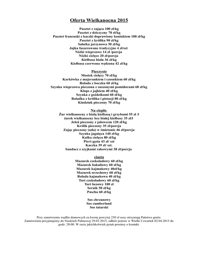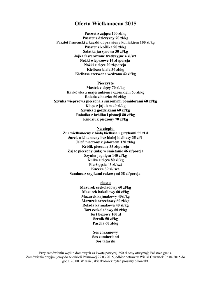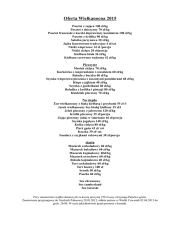 Oferta Wielkanocna 2015 Pasztet z zająca 100 zł/kg Pasztet z dziczyzny 70 zł/kg Pasztet francuski z kaczki doprawiony koniakiem 100 zł/kg Pasztet z królika 90 zł/kg Sałatka jarzynowa 30 zł/kg Jajka faszerowane tradycyjne 4 zł/szt Nóżki wieprzowe 14 zł /porcja Nóżki cielęce 20 zł/porcja Kiełbasa biała 36 zł/kg Kiełbasa czerwona wędzona 42 zł/kg Pieczyste Mostek cielęcy 70 zł/kg Karkówka z majerankiem i czosnkiem 60 zł/kg Rolada z boczku 60 zł/kg Szynka wieprzowa pieczona z suszonymi pomidorami 68 zł/kg Klops z jajkiem 40 zł/kg Szynka z goździkami 60 zł/kg Roladka z królika i pistacji 80 zł/kg Kindziuk pieczony 70 zł/kg Na ciepło Żur wielkanocny z białą kiełbasą i grzybami 55 zł /l żurek wielkanocny bez białej kiełbasy 35 zł/l Jeleń pieczony z jałowcem 120 zł/kg Królik pieczony 35 zł/porcja Zając pieczony (uda) w śmietanie 46 zł/porcja Szynka jagnięca 140 zł/kg Kulka cielęca 80 zł/kg Pierś gęsia 43 zł/ szt Kaczka 39 zł/ szt. Sandacz z szyjkami rakowymi 38 zł/porcja ciasta Mazurek czekoladowy 60 zł/kg Mazurek bakaliowy 60 zł/kg Mazurek kajmakowy 40zł/kg Mazurek orzechowy 60 zł/kg Rolada kajmakowa 40 zł/kg Tort czekoladowy 60 zł/kg Tort bezowy 100 zł Sernik 50 zł/kg Pascha 60 zł/kg Sos chrzanowy Sos cumberland Sos tatarski Przy zamówieniu wędlin domowych za kwotę powyżej 250 zł sosy otrzymają Państwo gratis. Zamówienia przyjmujemy do Niedzieli Palmowej 29.03.2015, odbiór potraw w Wielki Czwartek 02.04.2015 do godz. 20:00. W razie jakichkolwiek pytań prosimy o kontakt.