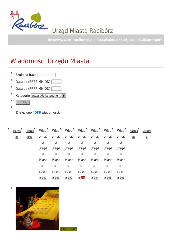 Urząd Miasta Racibórz http://www.xn--racibrz-p0a.pl/urzad/aktualnosci_lista/st:103/printpdf Wiadomości Urzędu Miasta Szukana fraza Data od (RRRR-MM-DD) Data do (RRRR-MM-DD) Kategorie wszystkie kategorie ... ▼ Szukaj Znaleziono 4086 wiadomości. Pierws Poprze Wiad Wiad Wiad Wiad Wiad Wiad Wiad Następ Ostatni za dnia omoś omoś omoś omoś omoś omoś omoś na a ci ci ci ci ci ci ci Urzęd Urzęd Urzęd Urzęd Urzęd Urzęd Urzęd u u u u u u u Miast Miast Miast Miast Miast Miast Miast a- a- a- a- a- a- a- stron stron stron stron stron stron stron a 100 a 101 a 102 a 103 a 104 a 105 a 106 2015-05-07 Spektakl dla dzieci w RCK kategoria: Wiadomości i wydarzenia 24 maja o godz. 16.00 Raciborskie Centrum Kultury zaprasza dzieci na spektakl pt. "Nowe przygody Koziołka Matołka" w wykonaniu Teatru Lalek BANIALUKA w Bielsku-Białej. 2015-05-06 8 budynków nagrodzono w konkursie "Najładniejsza elewacja 2014" kategoria: Wiadomości i wydarzenia Podsumowano konkurs na najładniejszą elewację 2014 roku. Z 26. zgłoszeń nagrodzono 8. budynków. Laureaci konkursu otrzymali nagrody, które wręczyli Mirosław Lenk - prezydent Raciborza oraz Wojciech Krzyżek – zastępca prezydenta. 2015-05-06 Zbiórka zużytego sprzętu elektrycznego i elektronicznego kategoria: Wiadomości i wydarzenia 16 maja, w sobotę Urząd Miasta Racibórz organizuje zbiórkę zużytego sprzętu elektrycznego i elektronicznego. 2015-05-06 Trening systemu alarmowania i ostrzegania kategoria: Wiadomości i wydarzenia 12 maja w godzinach 6.00 - 19.00 w ramach krajowych ćwiczeń obronnych odbędzie się trening systemu alarmowania i ostrzegania, w trakcie którego mogą zostać uruchomione syreny alarmowe. 2015-05-06 kategoria: Wieczór w Muzeum Wiadomości i wydarzenia 29 maja raciborskie Muzeum serdecznie zaprasza do udziału w cyklicznej i cieszącej sie dużym zainteresowaniem imprezie pn" Wieczór w Muzeum". 2015-05-04 Wyniki Biegu bez granic kategoria: Wiadomości i wydarzenia 3 maja w Raciborzu odbyła się kolejna edycja imprezy sportowo - rekreacyjnej "Bieg bez granic". Rywalizacja tradycyjnie dotyczyła dystansów: 10 km – Bieg Główny, 3,7 km– Bieg Młodzieżowy, 3,7 km K i M, 3,7 km – Nordic Walking. Poniżej publikujemy wyniki poszczególnych biegów. 2015-05-04 10 maja wybory Prezydenta Rzeczypospolitej Polskiej kategoria: Wiadomości i wydarzenia 10 maja wybierać będziemy Prezydenta Rzeczypospolitej Polskiej. Głosowanie odbywać się będzie bez przerwy od godziny 7:00 do godziny 21:00 w 28. lokalach Obwodowych Komisji Wyborczych usytuowanych na terenie Raciborza. 2015-05-04 Urodzinowe atrakcje z okazji pierwszego roku funkcjonowania H2Ostróg kategoria: Wiadomości i wydarzenia Raciborski aquapark H2Ostróg świętował pierwszy rok funkcjonowania. Z tej okazji odbyło się wiele atrakcji. Rozstrzygnięto również konkurs plastyczny H2Ostróg 2015-05-04 kategoria: Głosujemy codziennie w konkursie Podwórko NIVEA Wiadomości i wydarzenia Rozpoczeliśmy II - majowy - etap głosowania na budowę placu zabaw dla dzieci w konkursie Podwórko NIVEA. W czasie publikacji tej informacji Racibórz (ul. Pawła Stalamacha/Winna) zajmuje 16 miejsce. 2015-04-30 kategoria: Zmiany w kursowaniu autobusów komunikacji miejskiej Wiadomości i wydarzenia Od 4 maja obowiązywać będą zmiany w kursowaniu autobusów komunikacji miejskiej na liniach nr 1, 6 i 9. Pierws Poprze Wiad Wiad Wiad Wiad Wiad Wiad Wiad Następ Ostatni za dnia omoś omoś omoś omoś omoś omoś omoś na a ci ci ci ci ci ci ci Urzęd Urzęd Urzęd Urzęd Urzęd Urzęd Urzęd u u u u u u u Miast Miast Miast Miast Miast Miast Miast a- a- a- a- a- a- a- stron stron stron stron stron stron stron a 100 a 101 a 102 a 103 a 104 a 105 a 106
