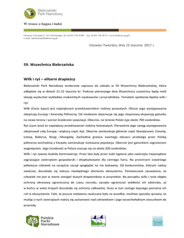 W trosce o bagna i ludzi Osowiec-Twierdza 8 | 19-110 Goniądz | tel. (0 85) 738 30 00 | fax. (0 85) 738 30 21 | www.biebrza.org.pl | e-mail: [email protected] Osowiec-Twierdza, dnia 13 stycznia 2017 r. 59. Wszechnica Biebrzańska Wilk i ryś – elitarni drapieżcy Biebrzański Park Narodowy serdecznie zaprasza do udziału w 59 Wszechnicy Biebrzańskiej, która odbędzie się w dniach 21-22 stycznia br. Podczas pierwszego dnia Wszechnicy uczestnicy będą mieli okazję wysłuchać wykładów znakomitych naukowców i przyrodników. Tematem spotkania będzie wilk i ryś. Wilk (Canis lupus) jest największym przedstawicielem rodziny psowatych. Obszar jego występowania obejmuję Eurazję i Amerykę Północną. Od niedawne obserwuje się jego stopniową ekspansję gatunku na nowe tereny i wzrost liczebności populacji. Obecnie, na terenie Polski żyje około 700 osobników. Ryś (Lynx lynx) to największy przedstawiciel rodziny kotowatych. Pierwotnie jego zasięg występowania obejmował całą Europę i większą część Azji. Obecnie zamieszkuje głównie część Skandynawii, Estonię, Łotwę, Białoruś, Rosję i Mongolię. Zachodnia granica zwartego obszaru przebiega przez Polskę północno-wschodnią a Karpaty zamieszkuje izolowana populacja. Obecnie jest gatunkiem zagrożonym wyginięciem. Jego liczebność w Polsce szacuje się na około 200 osobników. Wilk i ryś zawsze budziły kontrowersje. Przez lata były przez ludzi tępione jako zwierzęta niepożądane zagrażające zwierzętom gospodarski i eksploatowane dla cennego futra. Na przestrzeni ostatniego półwiecza człowiek na szczęście zaczął spoglądać na nie łaskawiej. Od konkurentów, których należy zwalczać, doczekały się statusu niezbędnego elementu ekosystemu. Poniewczasie zauważono, że człowiek nie jest w stanie zastąpić dużych drapieżników w przyrodzie. Na początku wilki i rysie objęto ochroną okresową ograniczoną do czasu rozrodu, zaczęto ograniczać wielkości ich odstrzału, aż w końcu w wielu krajach doczekały się ochrony całkowitej. Duża w tym zasługa lepszego poznania ich roli w ekosystemie. Fakt, że jeszcze niedawno zwalczane były na wszelkie, możliwe sposoby sprawia, że myśląc o tych zwierzętach należy się zastanowić nad człowiekiem i jego wszechwładnym stosunkiem do przyrody. Drugi dzień Wszechnicy to tradycyjnie dzień terenowy. Zapraszamy wszystkich zainteresowanych do uczestnictwa w wycieczce na ścieżkę edukacyjną „Barwik”. Na koniec proponujemy wspólne ognisko. Jeszcze raz serdecznie zapraszamy! Kontakt: Beata Głębocka – Dział Edukacji i Udostępniania Biebrzańskiego Parku Narodowego, tel. (85) 738 30 09; e-mail: [email protected] Więcej informacji o Wszechnicach Biebrzańskich: Strona internetowa BbPN: www.biebrza.org.pl. Ścieżka dostępu: Strona BbPN/Menu główne/Imprezy promocyjne/Wszechnica Biebrzańska. Link: http://www.biebrza.org.pl/132,wszechnica-biebrzanska.html 2/2