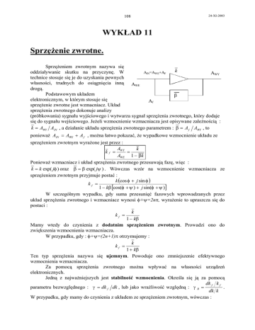 108 24-XI-2003 WYKŁAD 11 Sprzężenie zwrotne. Sprzężeniem zwrotnym nazywa się k oddziaływanie skutku na przyczynę. W AIN=AWE+AF AWY technice stosuje się je do uzyskania pewnych własności, trudnych do osiągnięcia inną AWE drogą. Podstawowym układem β elektronicznym, w którym stosuje się Af sprzężenie zwrotne jest wzmacniacz. Układ sprzężenia zwrotnego dokonuje analizy (próbkowania) sygnału wyjściowego i wytwarza sygnał sprzężenia zwrotnego, który dodaje się do sygnału wejściowego. Jeżeli wzmocnienie wzmacniacza jest opisywane zależnością : k = AWY AIN , a działanie układu sprzężenia zwrotnego parametrem : β = A f AWY , to ponieważ AIN = AWE + A f , można łatwo pokazać, że wypadkowe wzmocnienie układu ze sprzężeniem zwrotnym wyrażone jest przez : A k k f = WY = AWE 1 − βk Ponieważ wzmacniacz i układ sprzężenia zwrotnego przesuwają fazę, więc : k = k exp( jφ ) oraz β = β exp( jψ ) . Wówczas wzór na wzmocnienie wzmacniacza ze sprzężeniem zwrotnym przyjmuje postać : k (cos φ + j sin φ ) kf = 1 − kβ [cos(φ + ψ ) + j sin(φ + ψ )] W szczególnym wypadku, gdy suma przesunięć fazowych wprowadzanych przez układ sprzężenia zwrotnego i wzmacniacz wynosi φ+ψ=2nπ, wyrażenie to upraszcza się do postaci : k kf = 1 − kβ Mamy wtedy do czynienia z dodatnim sprzężeniem zwrotnym. Prowadzi ono do zwiększenia wzmocnienia wzmacniacza. W przypadku, gdy : φ+ψ=(2n+1)π otrzymujemy : k kf = 1 + kβ Ten typ sprzężenia nazywa się ujemnym. Powoduje ono zmniejszenie efektywnego wzmocnienia wzmacniacza. Za pomocą sprzężenia zwrotnego można wpływać na własności urządzeń elektronicznych. Jedną z najważniejszych jest stabilność wzmocnienia. Określa się ją za pomocą dk f k f parametru bezwzględnego : γ = dk f dk , lub jako wrażliwość względną : γ R = . dk k W przypadku, gdy mamy do czynienia z układem ze sprzężeniem zwrotnym, wówczas : 24-XI-2003 109 γ = 1 (1 − βk ) oraz 2 γ R = 1 1 − βk . Dla dodatniego sprzężenia zwrotnego otrzymujemy : 1 1 γR= γ = oraz , 2 1 − βk (1 − βk ) czyli stabilność wzmacniacza ulega zmniejszeniu w stosunku do stabilności wzmacniacza bez sprzężenia. Natomiast gdy mamy do czynienia z ujemnym sprzężeniem zwrotnym : 1 1 γ = γR= oraz . 2 1 + βk (1 + βk ) Wynika stąd, że za pomocą ujemnego sprzężenia zwrotnego możemy poprawić stabilność układu. Szczególnie, gdy wzmocnienie wzmacniacza jest bardzo duże (k f → ∞ ) , w przypadku ujemnego sprzężenia zwrotnego k f → 1 β . Parametry układu są więc wyznaczone tylko przez parametry układu sprzężenia zwrotnego, a te mogą być bardzo stabilne, gdyż obwody sprzężenia zwrotnego często buduje się wyłącznie z elementów biernych. Za pomocą ujemnego sprzężenia zwrotnego można również poprawić własności szumowe układu elektrycznego : zredukować pojawiające się na jego wyjściu niepożądane sygnały jak szumy, zakłócenia i zniekształcenia. Zakładamy, że szumy i zakłócenia nie dostają się do wzmacniacza wraz z sygnałem wejściowym, lecz powstają w wyniku niedoskonałości układu w jego wnętrzu. Szumowe własności układu elektronicznego opisuje współczynnik szumów : N NWE AWE N NWY = N + kNWE AWY = kAWE k’ k β wzmacniacz zakłócający wzmacniacz zakłócający z korekcją AWE / N WE AWY / N WY Współczynnik szumów układu idealnego (niewprowadzającego zakłóceń) wynosi 1. Tworząc obwód złożony ze wzmacniacza korekcyjnego (k’) wzmacniającego sygnał wejściowy dla badanego wzmacniacza oraz pętli sprzężenia zwrotnego uzyskujemy dla sygnału wejściowego wzmocnienie efektywne : k'k =k 1 − βkk ' F= 24-XI-2003 110 Jednak dla zakłóceń i szumów wytwarzanych we wzmacniaczu wzmocnienie efektywne wynosi : k kN = 1 − βkk ' Można pokazać, że współczynnik szumów wynosi wtedy : N F = 1+ k ' N WE W przypadku ujemnego sprzężenia zwrotnego, by uzyskać identyczne wzmocnienie układu z korekcją i układu bez korekcji, wzmocnienie wzmacniacza korekcyjnego powinno być k’ > 1, dzięki czemu uzyska się współczynnik szumów mniejszy niż dla układu bez korekcji : ( F = 1 + N N WE ). Gdy zastosowane będzie dodatnie sprzężenie zwrotne należy użyć tłumika w miejsce wzmacniacza korekcyjnego, (czyli 0 < k’ < 1), ale wtedy współczynnik szumów ulegnie zwiększeniu. Powyższe rozważania sugerują, że w złożonych układach elektronicznych powinno się, o ile to możliwe, stosować jedną wspólną pętlę silnego ujemnego sprzężenia zwrotnego, obejmującego całość układu. Należy szczególnie starannie dbać o wysoką jakość wejściowych stopni elektronicznych, gdyż im dalej od wejścia układu pojawiają się szumy i zniekształcenia, tym łatwiej jest wyeliminować je z sygnału wyjściowego. Za pomocą sprzężenia zwrotnego można także korygować własności częstotliwościowe układów elektronicznych. Jak wiadomo, ze względu na elementy reaktancyjne, efekt Millera itd. charakterystykę częstotliwościową układu można opisać k0 wzorem : k (ω ) = . wzmocnienie 1+ j ω ωg Jeżeli wzmacniacz pracuje w układzie ze sprzężeniem zwrotnym : k (ω ) = k f (ω ) = 1 − βk (ω ) k0 1+ j ω = 1− β k0 dodatnie sprzęż. zwrotne bez sprzężenia ujemne sprzęż. zwrotne ωg 1+ jω ωg+ ω0 ωg ωg- częstotliwość 24-XI-2003 111 Oznaczając : k f 0 = k 0 (1 − β k 0 ) wzmocnienie układu : k f (ω ) = ( ) oraz : ω fg = ω g 1 − β k 0 otrzymujemy znaną postać na kf0 1+ j ω . W przypadku gdy zastosowane zostanie ujemne ω fg sprzężenie zwrotne następuje zmniejszenie maksymalnego wzmocnienia wzmacniacza do wartości k- lecz równocześnie zwiększenie częstotliwości granicznej do wartości ω-. Dodatnie sprzężenie zwrotne wywoła zwiększenie maksymalnego wzmocnienia do wartości k+ lecz jednocześnie pasmo przenoszenia wzmacniacza ulegnie ograniczeniu do częstotliwości ω+. Podsumowują