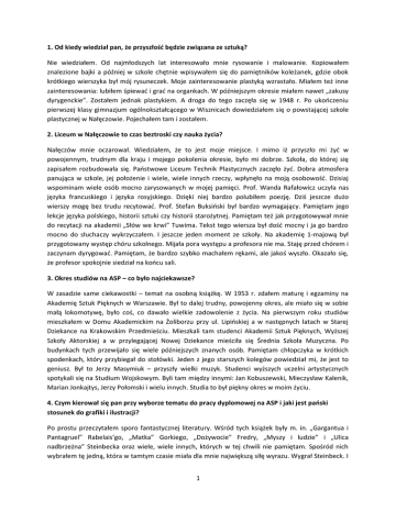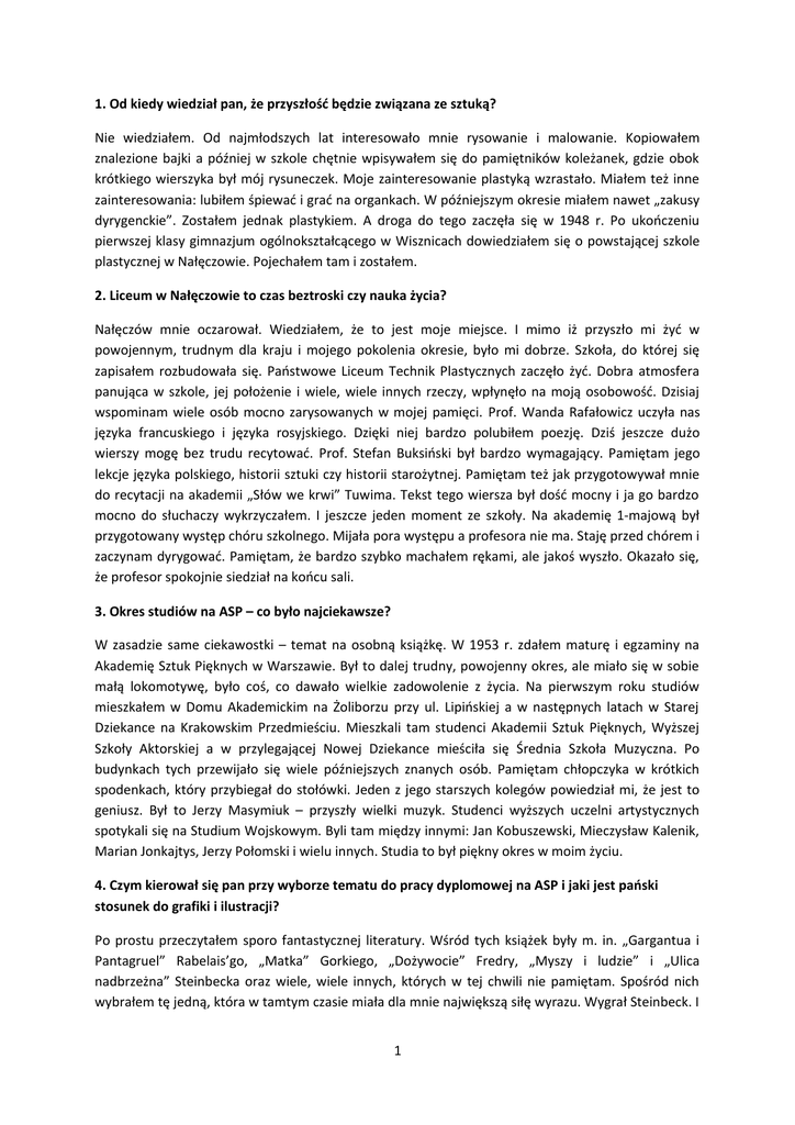 1. Od kiedy wiedział pan, że przyszłość będzie związana ze sztuką? Nie wiedziałem. Od najmłodszych lat interesowało mnie rysowanie i malowanie. Kopiowałem znalezione bajki a później w szkole chętnie wpisywałem się do pamiętników koleżanek, gdzie obok krótkiego wierszyka był mój rysuneczek. Moje zainteresowanie plastyką wzrastało. Miałem też inne zainteresowania: lubiłem śpiewać i grać na organkach. W późniejszym okresie miałem nawet „zakusy dyrygenckie”. Zostałem jednak plastykiem. A droga do tego zaczęła się w 1948 r. Po ukończeniu pierwszej klasy gimnazjum ogólnokształcącego w Wisznicach dowiedziałem się o powstającej szkole plastycznej w Nałęczowie. Pojechałem tam i zostałem. 2. Liceum w Nałęczowie to czas beztroski czy nauka życia? Nałęczów mnie oczarował. Wiedziałem, że to jest moje miejsce. I mimo iż przyszło mi żyć w powojennym, trudnym dla kraju i mojego pokolenia okresie, było mi dobrze. Szkoła, do której się zapisałem rozbudowała się. Państwowe Liceum Technik Plastycznych zaczęło żyć. Dobra atmosfera panująca w szkole, jej położenie i wiele, wiele innych rzeczy, wpłynęło na moją osobowość. Dzisiaj wspominam wiele osób mocno zarysowanych w mojej pamięci. Prof. Wanda Rafałowicz uczyła nas języka francuskiego i języka rosyjskiego. Dzięki niej bardzo polubiłem poezję. Dziś jeszcze dużo wierszy mogę bez trudu recytować. Prof. Stefan Buksiński był bardzo wymagający. Pamiętam jego lekcje języka polskiego, historii sztuki czy historii starożytnej. Pamiętam też jak przygotowywał mnie do recytacji na akademii „Słów we krwi” Tuwima. Tekst tego wiersza był dość mocny i ja go bardzo mocno do słuchaczy wykrzyczałem. I jeszcze jeden moment ze szkoły. Na akademię 1-majową był przygotowany występ chóru szkolnego. Mijała pora występu a profesora nie ma. Staję przed chórem i zaczynam dyrygować. Pamiętam, że bardzo szybko machałem rękami, ale jakoś wyszło. Okazało się, że profesor spokojnie siedział na końcu sali. 3. Okres studiów na ASP – co było najciekawsze? W zasadzie same ciekawostki – temat na osobną książkę. W 1953 r. zdałem maturę i egzaminy na Akademię Sztuk Pięknych w Warszawie. Był to dalej trudny, powojenny okres, ale miało się w sobie małą lokomotywę, było coś, co dawało wielkie zadowolenie z życia. Na pierwszym roku studiów mieszkałem w Domu Akademickim na Żoliborzu przy ul. Lipińskiej a w następnych latach w Starej Dziekance na Krakowskim Przedmieściu. Mieszkali tam studenci Akademii Sztuk Pięknych, Wyższej Szkoły Aktorskiej a w przylegającej Nowej Dziekance mieściła się Średnia Szkoła Muzyczna. Po budynkach tych przewijało się wiele późniejszych znanych osób. Pamiętam chłopczyka w krótkich spodenkach, który przybiegał do stołówki. Jeden z jego starszych kolegów powiedział mi, że jest to geniusz. Był to Jerzy Masymiuk – przyszły wielki muzyk. Studenci wyższych uczelni artystycznych spotykali się na Studium Wojskowym. Byli tam między innymi: Jan Kobuszewski, Mieczysław Kalenik, Marian Jonkajtys, Jerzy Połomski i wielu innych. Studia to był piękny okres w moim życiu. 4. Czym kierował się pan przy wyborze tematu do pracy dyplomowej na ASP i jaki jest pański stosunek do grafiki i ilustracji? Po prostu przeczytałem sporo fantastycznej literatury. Wśród tych książek były m. in. „Gargantua i Pantagruel” Rabelais’go, „Matka” Gorkiego, „Dożywocie” Fredry, „Myszy i ludzie” i „Ulica nadbrzeżna” Steinbecka oraz wiele, wiele innych, których w tej chwili nie pamiętam. Spośród nich wybrałem tę jedną, która w tamtym czasie miała dla mnie największą siłę wyrazu. Wygrał Steinbeck. I 1 tak po sześciu latach studiów w 1959 r. otrzymałem w pracowni prof. Marcina Szancera dyplom z wyróżnieniem. Było to dla mnie wielkie osiągnięcie. A potem przyszła pora na znalezienie pracy i swego miejsca w społeczeństwie. Na mojej drodze pojawiła się telewizja. 5. Praca w Telewizji Polskiej w Warszawie to zaplanowany rozwój drogi artystycznej? Skądże. Nadarzyła mi się okazja pracy w warszawskim ośrodku Telewizji Polskiej, więc skorzystałem z niej. I tak, od 1959 r., przepracowałem tam prawie 40 lat, tworząc szatę graficzną niezliczonych programów. Grafikę, którą wykorzystywałem cechowała maksymalna skrótowość i czytelność, przede wszystkim ze względu na jej krótki czas życia na wizji. 6. Czy plansze telewizyjne, zwane też sekundówkami, to forma charakterystyczna dla telewizji? Oczywiście - ze względu na specyfikę samej telewizji. Informacja w formie wizualnej musiała być podana w maksymalnie skróconej graficznie formie, tak by natychmiast wprowadzić widza w charakter nadawanego programu, ukazać to, co najbardziej charakterystyczne. Grafika telewizyjna jest jak błysk flesza w aparacie fotograficznym, musi być z jednej strony lapidarna a z drugiej naładowana skondensowaną treścią, którą przekazujemy błyskawicznie, w mgnieniu oka. Widz nawet nie ma czasu na refleksję, tu wszystko musi być oczywiste, jasne, klarowne i… zrobione „na wczoraj”. Żywot takiej planszy jest zawsze bardzo krótki, kilka sekund i jej kariera się kończy. Dzieło grafika przestaje istnieć, chyba że program jest powtarzany. Ale tak czy inaczej to są tylko sekundy. Dlatego ekspozycja takich plansz w formie wystawy jest czymś absolutnie wyjątkowym, dającym możliwość przyglądania się im przez dłuższy czas – co nigdy nie było możliwe w telewizji. Czas jest tutaj chyba kryterium kluczowym. Grafika telewizyjna nie różni się od innej dobrej grafiki. Jest może trochę ograniczona wymogami technicznymi i żyje bardzo krótko. Tylko tyle i aż tyle. 7. Co związanego z pracą w telewizji najbardziej utkwiło panu w pamięci? Och, jest tego tak dużo, że aż trudno cokolwiek wybrać. Było tyle niezwykłych momentów, ludz