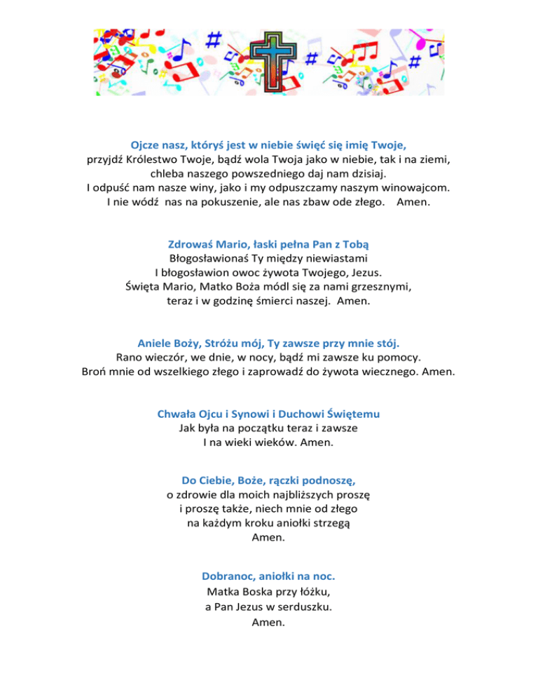 Ojcze nasz, któryś jest w niebie święć się imię Twoje, przyjdź Królestwo Twoje, bądź wola Twoja jako w niebie, tak i na ziemi, chleba naszego powszedniego daj nam dzisiaj. I odpuść nam nasze winy, jako i my odpuszczamy naszym winowajcom. I nie wódź nas na pokuszenie, ale nas zbaw ode złego. Amen. Zdrowaś Mario, łaski pełna Pan z Tobą Błogosławionaś Ty między niewiastami I błogosławion owoc żywota Twojego, Jezus. Święta Mario, Matko Boża módl się za nami grzesznymi, teraz i w godzinę śmierci naszej. Amen. Aniele Boży, Stróżu mój, Ty zawsze przy mnie stój. Rano wieczór, we dnie, w nocy, bądź mi zawsze ku pomocy. Broń mnie od wszelkiego złego i zaprowadź do żywota wiecznego. Amen. Chwała Ojcu i Synowi i Duchowi Świętemu Jak była na początku teraz i zawsze I na wieki wieków. Amen. Do Ciebie, Boże, rączki podnoszę, o zdrowie dla moich najbliższych proszę i proszę także, niech mnie od złego na każdym kroku aniołki strzegą Amen. Dobranoc, aniołki na noc. Matka Boska przy łóżku, a Pan Jezus w serduszku. Amen.