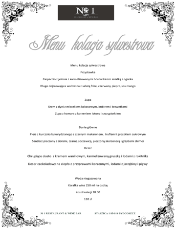 Menu kolacja sylwestrowa Przystawka Carpaccio z jelenia z karmelizowanymi borowikami i sałatką z ogórka Długo dojrzewająca wołowina z sałatą frize, czerwony pieprz, sos mango Zupa Krem z dyni z mleczkiem kokosowym, imbirem i krewetkami Zupa z homara z korzeniem lotosu i szczypiorkiem Danie główne Pierś z kurczaka kukurydzianego z czarnym makaronem , truflami i groszkiem cukrowym Sandacz pieczony z ziołami, czarną soczewicą, pieczoną skorzonerą i grzybami shimei Deser Chrupiące ciasto z kremem waniliowym, karmelizowaną gruszką i lodami z rokitnika Deser czekoladowy na ciepło z przyprawami korzennymi, lodami z jarzębiny i pigwy Woda niegazowana Karafka wina 250 ml na osobę Koszt kolacji 18.00 110 zł № 1 RESTAURANT & WINE BAR STASZICA 1 85-014 BYDGOSZCZ Kolacja godzina 20.00- 22.00 Woda niegazowana Karafka wina 250 ml na osobę Lampka wina musującego na przywitanie nowego roku Możliwość korzystania z zimnych bufetów 40 zł od osoby 125 zł № 1 RESTAURANT & WINE BAR STASZICA 1 85-014 BYDGOSZCZ