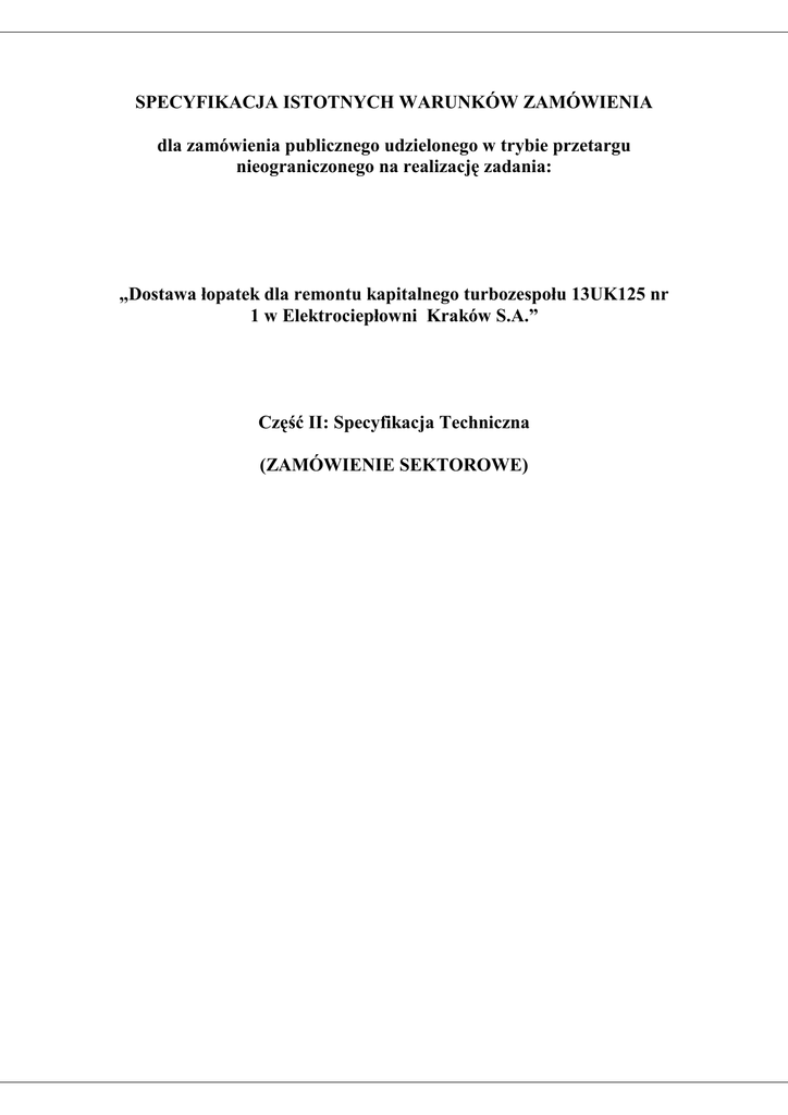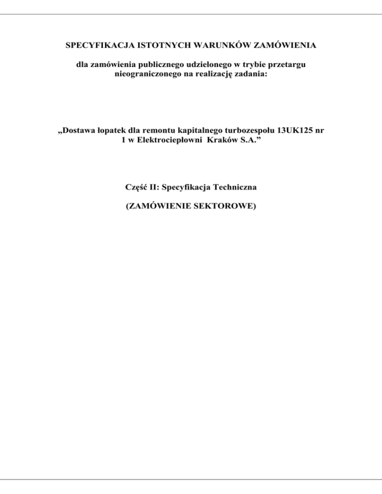 SPECYFIKACJA ISTOTNYCH WARUNKÓW ZAMÓWIENIA dla zamówienia publicznego udzielonego w trybie przetargu nieograniczonego na realizację zadania: „Dostawa łopatek dla remontu kapitalnego turbozespołu 13UK125 nr 1 w Elektrociepłowni Kraków S.A.” Część II: Specyfikacja Techniczna (ZAMÓWIENIE SEKTOROWE) „Dostawa łopatek dla remontu kapitalnego turbozespołu 13UK125 nr 1 w Elektrociepłowni Kraków S.A.” ROZDZIAŁ II SPECYFIKACJA TECHNICZNA Specyfikacja Techniczna do zamówienia na łopatki wirnikowe WP i SP turbiny 13UK125 nr fabr. 2 1.1 Stal musi się charakteryzować dużą odpornością na pęknięcia na skutek drgań. 1.2 Materiał musi być wykonany ze stali odpornej na pęknięcia wskutek korozji naprężeniowej w warunkach opisanych poniższymi parametrami pracy turbiny w systemie kondensacyjnym i ciepłowniczym: 1.2.1 Przewodność pary świeżej nie większa niż 0,2 µS/cm 1.2.2 Zawartość jonów sodu Na+ w parze świeżej nie większa niż 20 mg/l 1.2.3 pH w zakresie od 8 do 9 1.2.4 Zawartość tlenu w wodzie zasilającej do kotła nie większa niż 30 µg/l 1.2.5 Temperatura pary świeżej na wlocie do kadłuba WP t=5350C ciśnienie p=12,75 MPa nadc. 1.2.6 Temperatura pary na wylocie z kadłuba WP t= 3360C ciśnienie p=2,82MPa nadc 1.2.7 Temperatura pary na wlocie do kadłuba SP t= 5350C p= 2,56 MPa nadc. 1.2.8 Temperatura pary wylotowej z turbiny w trybie pracy kondensacyjnej 45 o C 1.2.9 Temperatura pary wylotowej z turbiny w trybie pracy ciepłowniczej 150 oC 1.3 W materiale łopatkowym oraz bandażach zawartość chromu nie mniejsza niż 11% wagowo. 1.4 Materiał wykorzystywany do produkcji łopatek musi się charakteryzować jednorodnością własności mechanicznych – odkuwki. 1.5 Dopuszcza się wykonanie łopatek z materiału o lepszych własnościach wytrzymałościowych. Dla proponowanych materiałów łopatkowych należy przedstawić referencje oraz zgodnie z pkt 3 dokonać odpowiednich obliczeń wytrzymałościowych. 1.6 Dla wszystkich zastosowanych materiałów należy dostarczyć świadectwo odbioru wg EN10204- 3.1 1.7 Ze względu na planowaną legalizację (czyszczenie) wrębów łopatkowych na tarczach wirnikowych należy uwzględnić wykonanie stopek łopatek z naddatkami 0,2 mm w stosunku do oryginalnego rozwiązania. 1.8 W komplecie łopatek należy przewidzieć wykonanie podziałki z wartościami tolerancji na minus i na plus w celu zamknięcia obwodu. 1.9 Bandaż łopatki powinien być wykonany ze zintegrowanymi ostrzami uszczelniającymi promieniowymi i dopasowanymi wymiarami do uszczelnienia nadbandażowego firmy Motor Energy. Dla wirnika WP należy wykonać pomiary po jego demontażu z turbiny tj. około 15.06.2011r. [w załączeniu rysunek Zabudowy komórkowych uszczelnień nadbandażowych na turbinę 13UK125 część WP]. Po dokonanych pomiarach do 15.07.2011r. należy dostarczyć bandaże z naddatkiem materiałowym. Dla wirnika SP ostrza na bandażach wykonać z naddatkiem materiałowym na końcową obróbkę zgodnie z załączonym rysunkiem Motor Energy 1.10 Bandaż łopatki powinien być wykonany z naddatkiem pod ostrze uszczelniające osiowe. 1.11 Bandaże będą dostarczone bez otworów pod nity. Otwory te wytrasuje i wykona wykonawca remontu turbiny. 1.12 100% łopatek po wykonanej obróbce mechanicznej musi być przebadana na obecność pęknięć na powierzchni metodą magnetyczną zgodnie z PN-EN 10228-1 grudzień 2000- niedopuszczalne jest wystąpienie jakichkolwiek pęknięć. 1.13 100% materiału przed rozpoczęciem produkcji łopatek musi być przebadana na obecność pęknięć wewnętrznych metodą ultradźwiękową zgodnie z PN-EN 10228-4 klasa jakości nr 3 według tablicy nr 4. 1.14 Dla wszystkich łopatek należy wykonać kontrolę wymiarową na współrzędnościowych maszynach pomiarowych CMM a wyniki wpisać do metryk pomiarowych. 2 Wykonawca przedstawi harmonogram kontroli operacji wykonania łopatek w którym będzie brał udział Zamawiający. 3 Obliczenia wytrzymałościowe łopatek z materiałów innych niż podane w tabeli winny obejmować: 3.1 Obliczenia naprężeń zredukowanych metodą elementów skończonych (MES) obejmujące naprężenia wynikające z działania siły odśrodkowej i oddziaływującej pary; 3.2 Obliczenia amplitudy drgań łopatek w różnych stanach pracy uwzględniające istniejący sposób mocowania łopatki na tarczy wirnikowej w czasie rozruchu (nabór obrotów od 0 do 3300 obr/min); 3.3 Obliczenia żywotności łopatek w oparciu o wytrzymałość zmęczeniową na skutek drgań dla najbardziej wytężonego trybu pracy; 3.4 Wyniki wszystkich obliczeń winny być przesłane do EC Kraków w terminie do 6 miesięcy od podpisania Umowy. 4 Konstrukcja łopatek wirnikowych winna zapewniać: 4.1 Możliwość bezpiecznej eksploatacji przez okres minimum 150 000 ekwiwalentnych godzin pracy. 4.2 Wykonywanie inspekcji łopatek z częstotliwością nie większą niż 45 000 ekwiwalentnych godzin pracy. 4.3 Dużą odporność na erozję zarówno krawędzi wlotowej jak i wylotowej. 4.4 Możliwość wykonywania zwyżki obrotów w czasie uruchomienia do poziomu 3300 obr/min w celu sprawdzenia regulatora bezpieczeństwa. 5 Dokumentacja winna zawierać: 5.1 Kopie atestów materiałowych na wszystkie dostarczone elementy. 5.2 Raport z przeprowadzonych badań twardości dla 100% prętów użytych do produkcji 5.3 Kopie wyników badań wytrzymałościowych materiałów wykorzystywanych do produkcji elementów 5.4 Wypełnione wszystkie metryki pomiarowe 5.5 Sprawozdania z przeprowadzonych badań i prób. 6 Na dostarczone łopatki i pozostałe elementy należy udzielić gwarancji minimum 24 miesiące od ruchu próbnego turbozespołu tj 28.09.2011. 7 Płatność 2 fakturami: Terminy: Realizacja - od daty podpisania umowy do 15.07.2011 „Zakres Dostaw” Tabela nr 1A. Termin dostaw do 30.05.2011. Ołopatkowanie wirnika WP nr rys 1027120 Wyszczególnienie Ilość Nr rys Rodzaj Gatunek materiału War.technicz