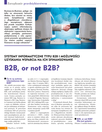 Zarządzanie przedsiębiorstwem Business-to-Business polega nie tylko na utworzeniu łańcucha dostaw, lecz również na nawiązaniu kompleksowej relacji o długofalowym charakterze. Jego zewnętrznym objawem jest przede wszystkim funkcjonujący system informatyczny, obejmujący aplikacje służące do ułatwienia i usprawnienia komunikacji pomiędzy partnerami, podejmowanej w celu usprawnienia procesów sprzedażowych. Czy można uzyskać wsparcie finansowe na jego wdrożenie? Systemy informatyczne typu B2B i możliwości uzyskania wsparcia na ich sfinansowanie B2B, or not B2B? Co to są systemy informatyczne typu B2B? Aby udzielić precyzyjnej odpowiedzi na to pytanie należy zagłębić się w specyfikę relacji B2B, czyli zachodzącej pomiędzy kontrahentami biznesowymi. Granica pomiędzy systemem B2B (ang. Business-toBusiness) a B2C (ang. Businessto-Customer) jest bardzo płynna i często jej dokładne wytyczenie jest uzależnione od interpretacji prawnych. W potocznym rozumieniu B2B jest procesem obsługi klientów instytucjonalnych (przedsiębiorstw, jak również instytucji budżetowych – jednostek samorządu terytorialnego, wojska, policji itp.). Jednakże fachowe źródła, 10 PlastNews 12’2009 na czele z § 3. 1. 1 rozporządzenia Ministra Rozwoju Regionalnego z dnia 13 sierpnia 2008 r. (wraz z późniejszymi zmianami) w sprawie udzielania przez Polską Agencję Rozwoju Przedsiębiorczości pomocy finansowej na wspieranie tworzenia i rozwoju gospodarki elektronicznej w ramach Programu Operacyjnego Innowacyjna Gospodarka 2007-2013, definiują B2B w sposób dużo bardziej restrykcyjny. Wymienione wyżej rozporządzenie interpretuje system B2B w poniższy sposób: „Ilekroć w rozporządzeniu jest mowa o […] B2B […] należy przez to rozumieć relację usługową oraz klasę systemów teleinformatycznych przeznaczonych do automatycznej informa- cji handlowej (wymiany danych) oraz koordynacji działań między przedsiębiorcami, stanowiące niezbędne ogniwo procesów biznesowych tych przedsiębiorców, dotyczące różnego rodzaju współpracy między tymi przedsiębiorcami, w tym również modelu wirtualnego przedsiębiorstwa, z zastosowaniem e-usług”. W prostszych słowach, Business-to-Business sprowadza się nie tylko do utworzenia łańcucha dostaw, lecz również do nawiązania kompleksowej relacji o długofalowym charakterze. Relacja powinna obejmować swoim zakresem zdecydowaną większość procesów działalności przedsiębiorstwa – zarządzanie, sprzedaż, marketing (zwłaszcza dystrybucję i komunikację), jak również płaszczyznę logistyczną (przepływ produktów lub towarów pomiędzy partnerami), finansową (politykę względem należności i płatności) oraz informatyczną. Ponadto, powinny one funkcjonować w obu kierunkach. Zewnętrznym, widocznym objawem relacji B2B jest przede wszystkim funkcjonujący system informatyczny, obejmujący aplikacje służące do ułatwienia i usprawnienia komunikacji pomiędzy partnerami, podejmowanej w celu usprawnienia procesów sprzedażowych. B2B, or not B2B? Oto jest pytanie… Obranie w modelu biznesowym Zarządzanie przedsiębiorstwem przedsiębiorstwa polityki działań w kierunku B2B (czyli obsługi wszelkiego rodzaju pośredników: producentów, dystrybutorów itp.) lub B2C (czyli obsługi bezpośredniej klientów ostatecznych) stanowi jedną z kluczowych decyzji strategicznych, jeśli nie najważniejszą. Każdy z tych systemów posiada szereg wad i zalet. W krótkim horyzoncie czasowym odsprzedaż produktów, usług lub towarów pośrednikom oznacza dla przedsiębiorstwa przede wszystkim konieczność rezygnacji z wygórowanych marż (które można byłoby wygenerować w przypadku zaoferowania produktów klientom ostatecznym). Ważną rolę we współpracy typu B2B pełni odpowiedni system premiowania za osiągnięte pułapy obrotów, które stanowią czynnik motywujący do zacieśniania współpracy. Drugi, co do ważności, niekorzystny czynnik stanowią koszty wzajemnego „docierania się” z kontrahentem pod kątem stworzenia spójnego systemu współpracy. Opracowywane i wdrażane procedury w początkowym okresie funkcjonowania nie zawsze okazują się trafne, a każda zmiana przynosi większe ryzyko ze strony technicznej (związanej z logistyką, informacją itp.) lub ze strony czynnika ludzkiego. In ny m n i e k o r z y s t ny m aspektem jest także wydłużenie łańcucha dostaw. W wielu firmach skomplikowana procedura dotycząca obiegu informacji, dokumentów, płatności oraz samego przedmiotu transakcji (czyli produktu bądź towaru) powoduje zawirowania w dostawach, na czym może stracić ostateczny odbiorca. Powszechnym zjawiskiem występującym przy skomplikowanych modelach logistycznych jest tzw. efekt sprzedaży utraconej. W prostych słowach polega on na tym, iż przedsiębiorstwo w wyniku nadmiernego skomplikowania procedur informacyjnych, sprzedażowych, magazynowych, logistycznych itp., traci możliwość dokonania transakcji w stopniu możliwym do osiągnięcia. Zjawisko jest szczególnie widoczne w przypadku dużych hurtowni oraz magazynów, zwłaszcza przy dużych dostawach. Sposobem na zniwelowanie wymienionego efektu jest dążenie do opracowania idealnego systemu B2B, którego zadaniem jest minimalizacja wpływu kluczowych barier na całokształt działań przedsiębiorstwa: 1) Obszar logistyki Przedsiębiorstwo dysponuje fizycznie towarem już od chwili jego wyładowania i położenia na półce. W praktyce jednak w tym momencie pojawia się bariera w postaci wdrożonych procedur. Zazwyczaj dopiero po rozładowaniu całej dostawy generowany jest dokument PZ, umożliwiający wprowadzenie towaru do systemu informatycznego. Inną frapującą kwestią jest np. poszukiwanie towaru przez magazyniera. Ze względu na istotną rolę czynnika ludzkiego oraz duży stopień rotacji pracowników ta z pozoru prosta czynność bywa w znacznej mierze utrudniona. Bywa tak, że „brakując