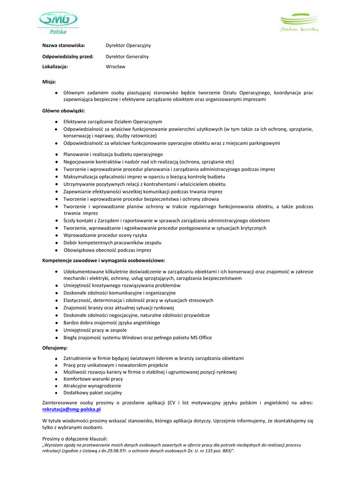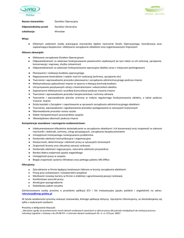 Nazwa stanowiska: Dyrektor Operacyjny Odpowiedzialny przed: Dyrektor Generalny Lokalizacja: Wrocław Misja: Głównym zadaniem osoby piastującej stanowisko będzie tworzenie Działu Operacyjnego, koordynacja prac zapewniająca bezpieczne i efektywne zarządzanie obiektem oraz organizowanymi imprezami Główne obowiązki: Efektywne zarządzanie Działem Operacyjnym Odpowiedzialnośd za właściwe funkcjonowanie powierzchni użytkowych (w tym także za ich ochronę, sprzątanie, konserwację i naprawy, służby ratownicze) Odpowiedzialnośd za właściwe funkcjonowanie operacyjne obiektu wraz z miejscami parkingowymi Planowanie i realizacja budżetu operacyjnego Negocjowanie kontraktów i nadzór nad ich realizacją (ochrona, sprzątanie etc) Tworzenie i wprowadzanie procedur planowania i zarządzania administracyjnego podczas imprez Maksymalizacja opłacalności imprez w oparciu o bieżącą kontrolę budżetu Utrzymywanie pozytywnych relacji z kontrahentami i właścicielem obiektu Zapewnianie efektywności wszelkiej komunikacji podczas trwania imprez Tworzenie i wprowadzanie procedur bezpieczeostwa i ochrony zdrowia Tworzenie i wprowadzanie planów ochrony w trakcie regularnego funkcjonowania obiektu, a także podczas trwania imprez Ścisły kontakt z Zarządem i raportowanie w sprawach zarządzania administracyjnego obiektem Tworzenie, wprowadzanie i egzekwowanie procedur postępowania w sytuacjach krytycznych Wprowadzanie procedur oceny ryzyka Dobór kompetentnych pracowników zespołu Obowiązkowa obecnośd podczas imprez Kompetencje zawodowe i wymagania osobowościowe: Udokumentowane kilkuletnie doświadczenie w zarządzaniu obiektami i ich konserwacji oraz znajomośd w zakresie mechaniki i elektryki, ochrony, usług sprzątających, zarządzania bezpieczeostwem Umiejętnośd kreatywnego rozwiązywania problemów Doskonałe zdolności komunikacyjne i organizacyjne Elastycznośd, determinacja i zdolnośd pracy w sytuacjach stresowych Znajomośd branży oraz aktualnej sytuacji rynkowej Doskonałe zdolności negocjacyjne, naturalne zdolności przywódcze Bardzo dobra znajomośd języka angielskiego Umiejętnośd pracy w zespole Biegła znajomośd systemu Windows oraz pełnego pakietu MS Office Oferujemy: Zatrudnienie w firmie będącej światowym liderem w branży zarządzania obiektami Pracę przy unikatowym i nowatorskim projekcie Możliwośd rozwoju kariery w firmie o stabilnej i ugruntowanej pozycji rynkowej Komfortowe warunki pracy Atrakcyjne wynagrodzenie Dodatkowy pakiet socjalny Zainteresowane osoby prosimy o przesłanie aplikacji (CV i list motywacyjny języku polskim i angielskim) na adres: [email protected] W tytule wiadomości prosimy wskazad stanowisko, którego aplikacja dotyczy. Uprzejmie informujemy, że skontaktujemy się tylko z wybranymi osobami. Prosimy o dołączenie klauzuli: „Wyrażam zgodę na przetwarzanie moich danych osobowych zawartych w ofercie pracy dla potrzeb niezbędnych do realizacji procesu rekrutacji (zgodnie z Ustawą z dn.29.08.97r. o ochronie danych osobowych Dz. U. nr 133 poz. 883)”.