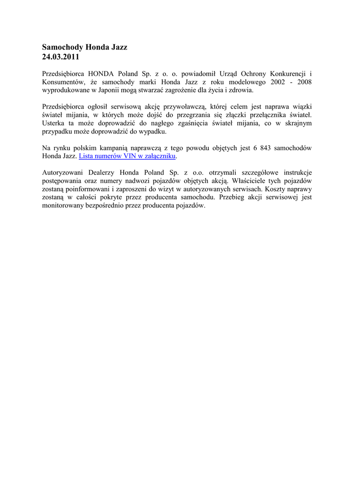 Samochody Honda Jazz 24.03.2011 Przedsiębiorca HONDA Poland Sp. z o. o. powiadomił Urząd Ochrony Konkurencji i Konsumentów, że samochody marki Honda Jazz z roku modelowego 2002 - 2008 wyprodukowane w Japonii mogą stwarzać zagrożenie dla życia i zdrowia. Przedsiębiorca ogłosił serwisową akcję przywoławczą, której celem jest naprawa wiązki świateł mijania, w których może dojść do przegrzania się złączki przełącznika świateł. Usterka ta może doprowadzić do nagłego zgaśnięcia świateł mijania, co w skrajnym przypadku może doprowadzić do wypadku. Na rynku polskim kampanią naprawczą z tego powodu objętych jest 6 843 samochodów Honda Jazz. Lista numerów VIN w załączniku. Autoryzowani Dealerzy Honda Poland Sp. z o.o. otrzymali szczegółowe instrukcje postępowania oraz numery nadwozi pojazdów objętych akcją. Właściciele tych pojazdów zostaną poinformowani i zaproszeni do wizyt w autoryzowanych serwisach. Koszty naprawy zostaną w całości pokryte przez producenta samochodu. Przebieg akcji serwisowej jest monitorowany bezpośrednio przez producenta pojazdów.