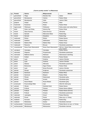 „Czarne punkty wodne” na Mazowszu Lp Powiat Gmina Miejscowość Akwen 1. garwoliński Wilga Morskie Oko Zalew 2. garwoliński Maciejowice Ostrów Rzeka Wisła 3. garwoliński Maciejowice Oblin Jezioro Oblin 4. grójecki Grójec Worów Staw 5. kozienicki Kozienice Kłoda Rzeka Wisła 6. legionowski Wieliszew Wieliszew Dzika plaża nad rzeką Narew 7. lipski Solec nad Wisłą Kolonia Raj Rzeka Wisła 8. łosicki Stara Kornica Stara Kornica Glinianka 9. łosicki Sarnaki Mierzwice Stare Rzeka Bug 10. łosicki Sarnaki Serpelice Rzeka Bug 11. makowski Różan Różan Rzeka Narew 12. makowski Szelków Zakliczewo Rzeka Orzyc 13. makowski Maków Maz. Maków Maz. Rzeka Orzyc 14. makowski Rzewnie Brzuze Wyrobisko pożwirowe 15. nowodworski Nowy Dwór Mazowiecki Nowy Dwór Mazowiecki 16. ostrołęcki Ostrołęka Ostrołęka 552 km. Rzeki Wisły strona prawa przy moście Rzeka Narew 17. ostrowski Wąsewo Przyborowie Wyrobisko pożwirowe 18. ostrowski Małkinia Górna Kiełczew Starorzecze rzeki Bug 19. otwocki Kołbiel Dobrzyniec Rzeka Świder 20. płocki Łąck Grabina Jezioro Górskie 21. płocki Łąck Grabina Jezioro Górskie 22. płocki Słubice Alfonsów Wyrobisko pożwirowe 23. płocki Bodzanów Kępa Polska Rzeka Wisła 24. płocki Łąck Nowe Rumunki Jezioro Górskie 25. płoński Raciąż Krajkowo Wyrobisko pożwirowe 26. płoński Sochocin Sochocin Rzeka Wkra 27. płoński Sochocin Bolęcin Rzeka Wisła 28. płoński Płońsk Dalanówek Wyrobisko gliny 29. płoński Płońsk Arcelin Wyrobisko gliny 30. płoński Nowe Miasto Nowe Miasto Wyrobisko gliny 31. przasnyski Krzynowłoga Mała Łoje Zbiornik retencyjny 32. pułtuski Obryte Zambski Kość Rzeka Narew 33. pułtuski Pułtusk Pułtusk Rzeka Narew (66km) 34. pułtuski Pułtusk Pułtusk Rzeka Narew (63 km) 35. pułtuski Pułtusk Gnojno Wyrobisko pożwirowe 36. radomski Jastrzębia Goryń Rzeka Rdomka 37. radomski Pionki Pionki Staw przy ul. Polnej 38. siedlecki Korczew Mogielnica Rzeka Bug 39. siedlecki Mokobody Żuków Wyrobisko żwirowe 40. sochaczewski Sochaczew Sochaczew Rzeka Bzura na wys. ul. Farnej 41. sochaczewski Młodzieszyn Mistrzewice Wyrobisko żwirowe 42. sochaczewski Brochów Plecewice Wyrobisko gliny 43. sochaczewski Brochów Przęsławice 44. sokołowski Jabłonna Lacka Mołożew Rzeka Wisła, przy wale przeciwpow. Rzeka Bug 45. sokołowski Jabłonna Lacka Gródek Rzeka Bug 46. warszawski Warszawa Warszawa 47. warszawski Warszawa Warszawa 48. warszawski Warszawa Warszawa 49. warszawski Warszawa Warszawa 50. warszawski Warszawa Warszawa 51. warszawski Warszawa Warszawa 52. warszawski Warszawa Warszawa 53. warszawski Warszawa Warszawa 54. warszawski Warszawa Warszawa 55. warszawski Łomianki Kiełpno Glinianki „Sznajdra” ul. Połczyńska Jeziorko Szczęśliwickie w Parku Szczęśliwickim Jeziorko Szczęśliwickie od ul. Bielskiej w Parku Szczęśliwickim Zbiornik wodny przy ul. Dudziarskiej w Warszawie Jeziorko Kamionkowskie w Parku Skaryszewskim w Warszawie Jeziorko Balaton przy ul. Abrahama Jeziorko Goławskie przy Al. Stanów Zjednoczonych Zbiornik wodny mieszczący się przy ul. Stężyckiej Plaża Rusałka, 515 km rzeki Wisły Jeziorko Kiełpińskie 56. węgrowski Sadowne Rażny Rzeka Bug 57. węgrowski Łochów Szumin Rzeka Bug 58. węgrowski Łochów Wywółka Starorzecze rzeki Bug 59. wołomiński Zielonka Zielonka Kąpielisko „Glinianki” 60. wołomiński Klembów Krusze Żwirownia 61. wołomiński Dąbrówka Kuligów Rzeka Bug 62. wyszkowski Długosiodło Ostrykół Dworski Rzeka Narew 63. wyszkowski Wyszków Kamieńczyk Rzeka Bug