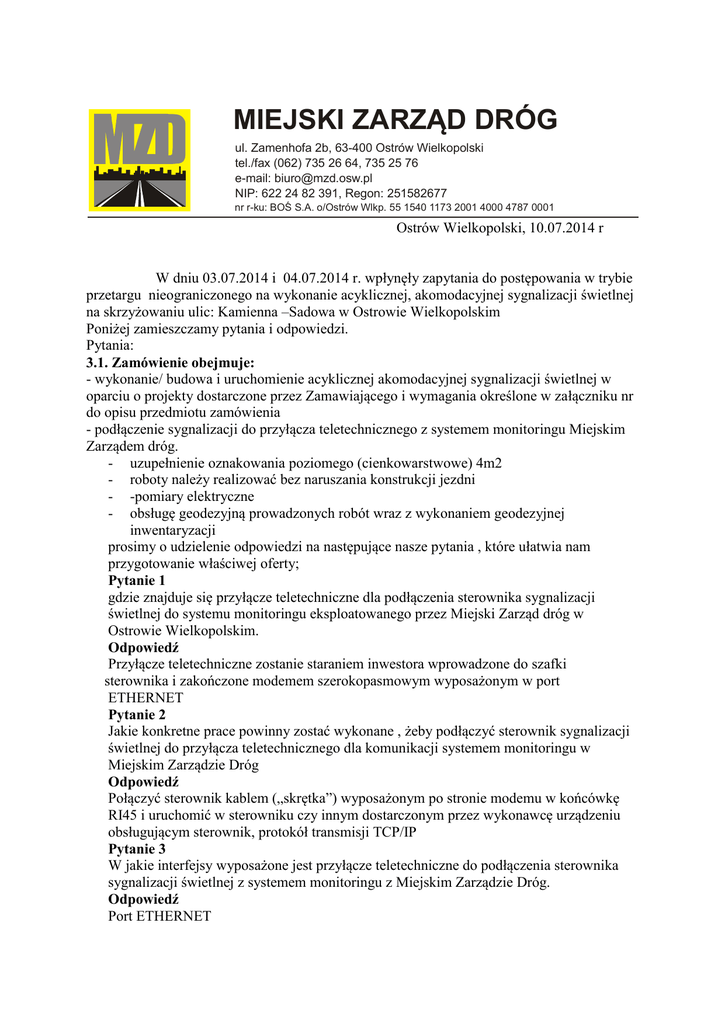 MIEJSKI ZARZĄD DRÓG ul. Zamenhofa 2b, 63-400 Ostrów Wielkopolski tel./fax (062) 735 26 64, 735 25 76 e-mail: [email protected] NIP: 622 24 82 391, Regon: 251582677 nr r-ku: BOŚ S.A. o/Ostrów Wlkp. 55 1540 1173 2001 4000 4787 0001 Ostrów Wielkopolski, 10.07.2014 r W dniu 03.07.2014 i 04.07.2014 r. wpłynęły zapytania do postępowania w trybie przetargu nieograniczonego na wykonanie acyklicznej, akomodacyjnej sygnalizacji świetlnej na skrzyżowaniu ulic: Kamienna –Sadowa w Ostrowie Wielkopolskim Poniżej zamieszczamy pytania i odpowiedzi. Pytania: 3.1. Zamówienie obejmuje: - wykonanie/ budowa i uruchomienie acyklicznej akomodacyjnej sygnalizacji świetlnej w oparciu o projekty dostarczone przez Zamawiającego i wymagania określone w załączniku nr do opisu przedmiotu zamówienia - podłączenie sygnalizacji do przyłącza teletechnicznego z systemem monitoringu Miejskim Zarządem dróg. - uzupełnienie oznakowania poziomego (cienkowarstwowe) 4m2 - roboty należy realizować bez naruszania konstrukcji jezdni - -pomiary elektryczne - obsługę geodezyjną prowadzonych robót wraz z wykonaniem geodezyjnej inwentaryzacji prosimy o udzielenie odpowiedzi na następujące nasze pytania , które ułatwia nam przygotowanie właściwej oferty; Pytanie 1 gdzie znajduje się przyłącze teletechniczne dla podłączenia sterownika sygnalizacji świetlnej do systemu monitoringu eksploatowanego przez Miejski Zarząd dróg w Ostrowie Wielkopolskim. Odpowiedź Przyłącze teletechniczne zostanie staraniem inwestora wprowadzone do szafki sterownika i zakończone modemem szerokopasmowym wyposażonym w port ETHERNET Pytanie 2 Jakie konkretne prace powinny zostać wykonane , żeby podłączyć sterownik sygnalizacji świetlnej do przyłącza teletechnicznego dla komunikacji systemem monitoringu w Miejskim Zarządzie Dróg Odpowiedź Połączyć sterownik kablem („skrętka”) wyposażonym po stronie modemu w końcówkę RI45 i uruchomić w sterowniku czy innym dostarczonym przez wykonawcę urządzeniu obsługującym sterownik, protokół transmisji TCP/IP Pytanie 3 W jakie interfejsy wyposażone jest przyłącze teletechniczne do podłączenia sterownika sygnalizacji świetlnej z systemem monitoringu z Miejskim Zarządzie Dróg. Odpowiedź Port ETHERNET Pytanie 4 Czy przyłącze teletechniczne pozwala na nadanie sterownikowi sygnalizacji stały adres IP w sieci Internet lub Intranet Odpowiedź Tak Pytanie 5 Jakie funkcje i parametry monitorowania sygnalizacji powinny być realizowane w system monitoringu w Miejskim Zarządzie Dróg Odpowiedź. 1. Wymagania ogólne: - System musi być dostępny przez stronę www z przeglądarki internetowej (chrome, firefox, explorer) pod dowolnym systemem operacyjnym (Windows, Linux, Mac). - Logowanie musi się odbywać w połączeniu szyfrowanym (ssl) - historyczne dane muszą być przechowywanie w bazie danych 2. Monitoring grupy zarejestrowanych sterowników sygnalizacji świetlnej dostępnych dla danego użytkownika - okno - lista sterowników z informacją o stanie połączenia, statusie sterownika i ewentualnych błędach w postaci ikon graficznych oraz identyfikatorem i lokalizacją sterownika - okno - mapa z z informacją jw w postaci ikon graficznych - okno - lista aktywnych błędów i zdarzeń 3.Monitoring, parametryzacja i przełączanie sterownika sygnalizacji świetlnej 3.1 okno z zakładkami zawierającymi dane - status sterownika, historia zmian statusu, - podgląd aktualnie załadowanych programów - lista błędów aktywnych, nieaktywnych, potwierdzonych, niepotwierdzonych - dzienniki zdarzeń systemu - pomiary natężeniach ruchu w określonych horyzontach czasowych i przedstawienie ich w postaci wykresów, zliczanie pojazdów przejeżdżających na czerwonym świetle - dokumentację wgrana przez użytkownika systemu oraz umożliwiającym użytkownikom o odpowiednich prawach: - zmianę trybu pracy sterownika (praca kolorowa, żółte pulsujące, wyłączenie sygnalizatorów) - wymuszenie realizacji wskazanej struktury programu pracy sygnalizacji - zmianę wartości parametrów programu pracy sygnalizacji (czasów maksymalnych sygnałów, załączanie/wyłączanie detektora ruchu, wydłużanie czasów międzyzielonych, itp.). podzielonych na kategorie : grupa sygnałowa, detekcja, wyjścia, parametry elektryczne, pomiary, elementy dodatkowe 3.2 okno obrazujące aktualna pracę sterownika: - w postaci mapy wizualizującej stany grup sygnałowych, detektorów ruchu , wejść i wyjść, - w postaci diagramów paskowych stanów grup sygnałowych, detektorów ruchu , wejść i wyjść - w postaci tabeli aktualnych pomiarów elektrycznych w poszczególnych kanałach wyjściowych grup sygnalizacyjnych 4. Funkcje administracyjne - konfigurowalne konta użytkownika w zakresie dostępnych danych i praw do modyfikacji określonej grupy sterowników - podział zbioru sterowników na regiony oraz podregiony - statystyka liczby przesyłanych danych - statystyka aktywności użytkowników (logowania, zmiany parametrów, wydawanie rozkazów) - konfigurowalne konta osób otrzymujących powiadomienia email i/lub sms Pytanie 6 Prosimy o wyjaśnienie , czy zamawiający wyraża zgodę na nieodpłatne dostarczenie przez wykonawcę , w ramach niniejszego zadania , oprogramowania dla realizacji monitorowania przedmiotowej sygnalizacji świetlnej, które umożliwi monitorowanie przez Miejski Zarząd Dróg przedmiotowej sygnalizacji świetlnej. Odpowiedź Oprogramowanie do realizacji monitoringu jest już zainstalowane i eksploatowane przez Miejski Zarząd Dróg. Po stronie Wykonawcy jest zrealizowanie wymiany danych między sterownikiem a systemem monitoringu po protokole VCI. Pytanie 7 Jeśli Zamawiający nie dostarczy w ramach miniejszego zadania oprogramowania dla realizacji monitorowania przedmiotowej sygnalizacji świetlnej, wnioskujemy o opublikowanie pełnego protokołu wymiany danych z istniejącym oprogramowaniem do monitorowania sygnalizacji świetlnych , b