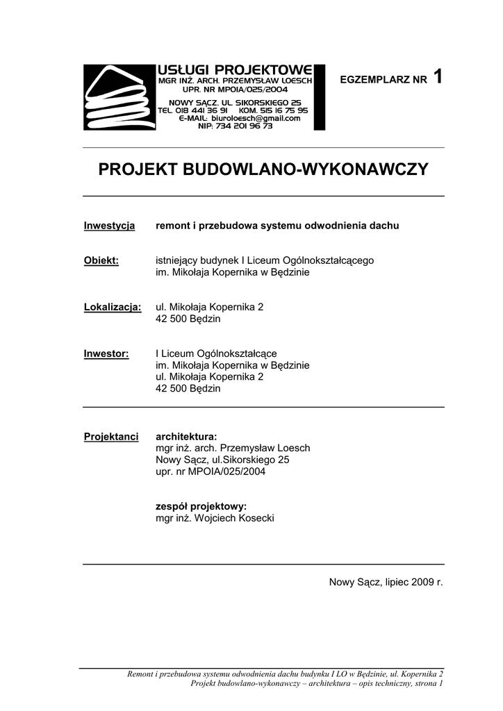 EGZEMPLARZ NR 1 PROJEKT BUDOWLANO-WYKONAWCZY Inwestycja remont i przebudowa systemu odwodnienia dachu Obiekt: istniejący budynek I Liceum Ogólnokształcącego im. Mikołaja Kopernika w Będzinie Lokalizacja: ul. Mikołaja Kopernika 2 42 500 Będzin Inwestor: I Liceum Ogólnokształcące im. Mikołaja Kopernika w Będzinie ul. Mikołaja Kopernika 2 42 500 Będzin Projektanci architektura: mgr inŜ. arch. Przemysław Loesch Nowy Sącz, ul.Sikorskiego 25 upr. nr MPOIA/025/2004 zespół projektowy: mgr inŜ. Wojciech Kosecki Nowy Sącz, lipiec 2009 r. Remont i przebudowa systemu odwodnienia dachu budynku I LO w Będzinie, ul. Kopernika 2 Projekt budowlano-wykonawczy – architektura – opis techniczny, strona 1 ZAWARTOŚĆ OPRACOWANIA: Część opisowa: 1. 1.1. 1.2. 1.3. 1.4. 1.5. Opis techniczny ..................................................................................... 3 Zakres opracowania .............................................................................. 3 Lokalizacja ............................................................................................. 3 Istniejące zagospodarowanie działki...................................................... 3 Stan istniejący budynku ......................................................................... 3 Projektowane rozwiązania konstrukcyjno-materiałowe.......................... 5 2. Załączniki: 1. Informacja dotycząca bezpieczeństwa i ochrony zdrowia...................... 8 2. Oświadczenie projektanta o zgodności projektu z obowiązującymi przepisami, normami oraz zasadami wiedzy technicznej. ................... 11 3. Uprawnienia projektanta do projektowania w specjalności architektonicznej, oraz zaświadczenie o przynaleŜności projektanta do Małopolskiej Okręgowej Izby Architektów....................................... 12 Część rysunkowa: A. Sytuacja 1. Plan sytuacyjny 1:500 B. Inwentaryzacja 2. Rzut dachu 3. Elewacja zachodnia 4. Elewacja wschodnia 5. Elewacja północna 6. Elewacja południowa 1:100 1:100 1:100 1:100 1:100 C. Projekt remontu i przebudowy 7. Rzut dachu 8. Elewacja zachodnia 9. Elewacja wschodnia 10. Elewacja północna 11. Elewacja południowa 12. Detal obróbek ścian attykowych 13. Detale przeciwspadków z izoklinów 1:100 1:100 1:100 1:100 1:100 1:5 1:5 D. Dokumentacja fotograficzna stanu istniejącego Remont i przebudowa systemu odwodnienia dachu budynku I LO w Będzinie, ul. Kopernika 2 Projekt budowlano-wykonawczy – architektura – opis techniczny, strona 2 1. OPIS TECHNICZNY 1.1. Zakres opracowania Przedmiotem opracowania jest projekt remontu i przebudowy systemu odwodnienia dachu budynku I Liceum Ogólnokształcącego w Będzinie. Projekt ma na celu usprawnienie działania istniejącego orynnowania oraz wyeliminowanie jego elementów, które powodują zalewanie ścian budynku. W dokumentacji przeanalizowano stan istniejący pod względem sprawności i prawidłowości jego działania i zaprojektowano remont i przebudowę odwodnienia. W ramach inwestycji projektuje się zmianę lokalizacji lub sposobu połączenia części rynien i rur spustowych, uzupełnienie brakujących elementów odwodnienia, a takŜe wymianę części obróbek ścian attykowych dachu. 1.2. Lokalizacja Obiekt, którego dotyczy projekt, budynek I Liceum Ogólnokształcącego im. Mikołaja Kopernika, zlokalizowany jest w Będzinie, przy ul. Kopernika 2. Teren ten znajduje się w obszarze oznaczonym w miejscowym planie zagospodarowania przestrzennego symbolem „3 Upo”, z przeznaczeniem podstawowym dla usług oświaty. Zgodnie z zapisem planu dopuszcza się rozbudowę, przebudowę, podwyŜszanie standardu uŜytkowego oraz remonty istniejących obiektów szkolnych. Projektowana inwestycja spełnia pod względem zakresu i charakteru robót wymagania miejscowego planu zagospodarowania przestrzennego. Teren inwestycji znajduje się w górnej partii zbocza miejscowego wyniesienia, o nachyleniu w kierunku zachodnim, ze spadkiem rzędu 10%. 1.3. Istniejące zagospodarowanie działki Działka, na której zlokalizowany jest budynek I LO jest w przewaŜającej części zagospodarowania zielenią urządzoną. Wokół budynku znajdują się równieŜ nawierzchnie utwardzone w postaci chodników z kostki brukowej betonowej oraz podjazdów o nawierzchni betonowej i asfaltowej. W obrębie działki przebiegają istniejące sieci infrastruktury technicznej – zgodnie z załączonym planem sytuacyjnym. Projektowana inwestycja nie powoduje zmian w zagospodarowaniu działki. Nie projektuje się nowych obiektów budowlanych na działce, połoŜenie wszystkich istniejących obiektów, oraz ich odległości od granic działki nie ulegają zmianie. 1.4. Stan istniejący budynku Istniejący budynek jest obiektem wzniesionym na przełomie lat 20 i 30 XX wieku. Obiekt murowany, o dwóch i trzech kondygnacjach nadziemnych, częściowo podpiwniczony. Budynek I LO nie znajduje się w rejestrze zabytków, lecz podlega ochronie konserwatorskiej zgodnie z zapisami miejscowego planu zagospodarowania przestrzennego (Uchwała Nr XXVII/311/2004 Rady Miejskiej w Będzinie z dnia 27 września 2004 roku, §10.1. Wykaz obiektów zabytkowych zakwalifikowanych do ochrony). Plan dopuszcza podwyŜszenie standardu uŜytkowego oraz zmiany funkcji obiektów z zachowaniem cech stylowych, skali i wystroju Remont i przebudowa systemu odwodnienia dachu budynku I LO w Będzinie, ul. Kopernika 2 Projekt budowlano-wykonawczy – architektura – opis techniczny, strona 3 architektonicznego elewacji (§9.2.c). Projektowana inwestycja jest w całości zgodna z zapisem planu. Obiekt złoŜony jest z kilku prostopadłościennych brył o róŜnej wysokości, tworzących symetryczną rozczłonkowaną kompozycję. Dach na poszczególnych częściach budynku jest dwuspadowy lub pulpitowy, ze spadkiem od 1° do 17°. System odwodnienia dachu Połaci dachu ukształtowane są w ten sposób, Ŝe woda z dachów wyŜej połoŜonych odprowadzana jest na dachy znajd