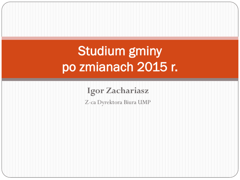 Studium gminy po zmianach 2015 r. Igor Zachariasz Z-ca Dyrektora Biura UMP Ekonomiczne skutki systemu planowania przestrzennego 2011 zasób terenów budowalnych w planach miejscowych - 77 mln. ludzi zasób terenów budowlanych w studiach gmin - 316 mln. ludzi spodziewany czas sprzedaży terenów pod zabudowę - 911 lat; 3278 lat; zobowiązania gmin w zw. z wykupem gruntów pod drogi - 130 mld. zł A. Olbrysz, J. Koziński, Raport o finansowych efektach polskiego systemu gospodarowania przestrzenią, Zespół Badawczy „Finanse w urbanizacji”, Warszawa 2011. 2015 Ustawa z dnia 9 października 2015 r. o rewitalizacji (Dz. U. z 2015 r. poz. 1777) - zmiany: art. 1 u.p.z.p. - ust. 3 i ust. 4 (ważenie interesów; sanacja terenów przed ekspansją) art. 10 u.p.z.p. - ust. 5-7 (bilans terenów budowlanych) Sanacja terenów przed ekspansją Art. 1 ust. 4 u.p.z.p. Sytuowanie nowej zabudowy – przez - dążenie do planowania i lokalizowania nowej zabudowy: w granicach jednostki osadniczej w rozumieniu art. 2 pkt 1 ustawy z dnia 29 sierpnia 2003 r. o urzędowych nazwach miejscowości i obiektów fizjograficznych (Dz. U. Nr 166, poz. 1612 oraz z 2005 r. Nr 17, poz. 141) na obszarach o w pełni wykształconej zwartej strukturze funkcjonalno—przestrzennej na terenach położonych na obszarach innych - wyłącznie w sytuacji braku dostatecznej ilości terenów przeznaczonych pod dany rodzaj zabudowy- przy czym w pierwszej kolejności na obszarach w najwyższym stopniu przygotowanych do zabudowy, przez co rozumie się obszary charakteryzujące się najlepszym dostępem do sieci komunikacyjnej oraz najlepszym stopniem wyposażenia w sieci wodociągowe, kanalizacyjne, elektroenergetyczne, gazowe, ciepłownicze oraz sieci i urządzenia telekomunikacyjne, adekwatnych dla nowej, planowanej zabudowy Sanacja terenów przed ekspansją Art. 1 ust. 4 u.p.z.p. Znaczenie art. 4 ust. 4 u.p.z.p. – wyznaczenie jednostek osadniczych (miejscowości zamieszkanych) i miejscowości niezamieszkanych Decyzje o warunkach zabudowy i zagospodarowania terenu – przesłanki odmowy udzielania decyzji o warunkach zabudowy Studium gminy i plany miejscowe: organy gminy – są zobowiązane używać nazw urzędowych ustalonych zgodnie z niniejszą ustawą przy wykonywaniu zadań publicznych, w tym przy sporządzaniu studium (art. 6 ust. 2 u.n.m.) urzędowa nazwa jest ustalana, zmieniana lub znoszona na wniosek rady gminy (art. 8 ust. 1 u.n.m.) Sanacja terenów przed ekspansją Art. 10 ust. 5-7 u.p.z.p. Krok 1 zapotrzebowanie na nową zabudowę, wyrażone w ilości powierzchni użytkowej zabudowy, w podziale na funkcje zabudowy (na podstawie analiz, prognoz demograficznych i możliwości finansowych gminy) szacunek chłonności obszarów o w pełni wykształconej zwartej strukturze funkcjonalno- przestrzennej w granicach jednostki osadniczej = możliwość lokalizowania na tych obszarach nowej zabudowy, wyrażoną w powierzchni użytkowej zabudowy, w podziale na funkcje zabudowy szacunek chłonności obszarów przeznaczonych w planach miejscowych pod zabudowę, innych niż wymienione wyżej porównanie w.w. szacunków terenowych i konsekwencje (art. 10 ust. 5 pkt 4 lit a-b u.p.z.p.) Sanacja terenów przed ekspansją Art. 10 ust. 5-7 u.p.z.p. Krok 2 określenie możliwości finansowania przez gminę wykonania sieci komunikacyjnych i infrastruktury technicznej oraz społecznej, służących realizacji zadań własnych gminy określenie potrzeb inwestycyjnych gminy wynikających z konieczności realizacji zadań własnych, związanych z lokalizacją nowej zabudowy potrzeby inwestycyjne versus możliwości finansowe – konsekwencje (art. 10 ust. 5 pkt 5 u.p.z.p.) Krok 3 redukcja lub utrzymanie wyznaczonych obszarów (art. 10 ust. 5 pkt 6 u.p.z.p.) Perspektywa max lat 30 versus perspektywa WPF = perspektywa studium Sanacja terenów przed ekspansją Art. 28 ust. 1 u.p.z.p. Istotne naruszenie zasad sporządzania studium lub planu miejscowego, istotne naruszenie trybu ich sporządzania, a także naruszenie właściwości organów w tym zakresie, powodują nieważność uchwały rady gminy w całości lub części. Art. 12 ust. 1 u.p.z.p. Studium uchwala rada gminy, rozstrzygając jednocześnie o sposobie rozpatrzenia uwag, o których mowa w art. 11 pkt 12. Tekst i rysunek studium oraz rozstrzygnięcie o sposobie rozpatrzenia uwag stanowią załączniki do uchwały o uchwaleniu studium. Art. 1 ust. 3 u.p.z.p. Ustalając przeznaczenie terenu lub określając potencjalny sposób zagospodarowania i korzystania z terenu, organ waży interes publiczny i interesy prywatne, w tym zgłaszane w postaci wniosków i uwag, zmierzające do ochrony istniejącego stanu zagospodarowania terenu, jak i zmian w zakresie jego zagospodarowania, a także analizy ekonomiczne, środowiskowe i społeczne. Dziękuję za uwagę