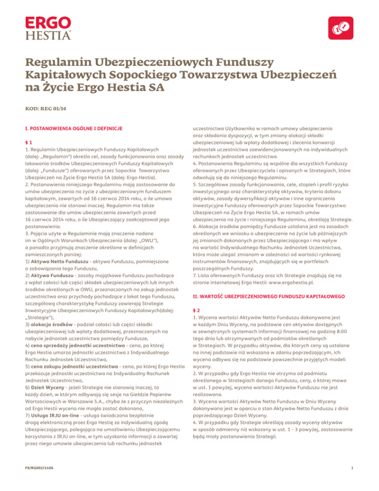 Regulamin Ubezpieczeniowych Funduszy Kapitałowych Sopockiego Towarzystwa Ubezpieczeń na Życie Ergo Hestia SA KOD: REG 01/14 I. POSTANOWIENIA OGÓLNE I DEFINICJE §1 1. Regulamin Ubezpieczeniowych Funduszy Kapitałowych (dalej: „Regulamin”) określa cel, zasady funkcjonowania oraz zasady lokowania środków Ubezpieczeniowych Funduszy Kapitałowych (dalej: „Fundusze”) oferowanych przez Sopockie Towarzystwo Ubezpieczeń na Życie Ergo Hestia SA (dalej: Ergo Hestia). 2. Postanowienia niniejszego Regulaminu mają zastosowanie do umów ubezpieczenia na życie z ubezpieczeniowym funduszem kapitałowym, zawartych od 16 czerwca 2014 roku, o ile umowa ubezpieczenia nie stanowi inaczej. Regulamin ma także zastosowanie dla umów ubezpieczenia zawartych przed 16 czerwca 2014 roku, o ile Ubezpieczający zaakceptował jego postanowienia. 3. Pojęcia użyte w Regulaminie mają znaczenie nadane im w Ogólnych Warunkach Ubezpieczenia (dalej: „OWU”), a ponadto przyjmują znaczenie określone w definicjach zamieszczonych poniżej: 1) Aktywa Netto Funduszu - aktywa Funduszu, pomniejszone o zobowiązania tego Funduszu, 2) Aktywa Funduszu - zasoby majątkowe Funduszu pochodzące z wpłat całości lub części składek ubezpieczeniowych lub innych środków określonych w OWU, przeznaczonych na zakup jednostek uczestnictwa oraz przychody pochodzące z lokat tego Funduszu, szczegółową charakterystykę Funduszy zawierają Strategie Inwestycyjne Ubezpieczeniowych Funduszy Kapitałowych(dalej: „Strategie”), 3) alokacja środków - podział całości lub części składki ubezpieczeniowej lub wpłaty dodatkowej, przeznaczanych na nabycie jednostek uczestnictwa pomiędzy Fundusze, 4) cena sprzedaży jednostki uczestnictwa - cena, po której Ergo Hestia umarza jednostki uczestnictwa z Indywidualnego Rachunku Jednostek Uczestnictwa, 5) cena zakupu jednostki uczestnictwa - cena, po której Ergo Hestia przekazuje jednostki uczestnictwa na Indywidualny Rachunek Jednostek Uczestnictwa, 6) Dzień Wyceny - jeżeli Strategie nie stanowią inaczej, to każdy dzień, w którym odbywają się sesje na Giełdzie Papierów Wartościowych w Warszawie S.A., chyba że z przyczyn niezależnych od Ergo Hestii wycena nie mogła zostać dokonana, 7) Usługa IRJU on-line - usługa świadczona bezpłatnie drogą elektroniczną przez Ergo Hestię za indywidualną zgodą Ubezpieczającego, polegająca na umożliwieniu Ubezpieczającemu korzystania z IRJU on-line, w tym uzyskania informacji o zawartej przez niego umowie ubezpieczenia lub rachunku jednostek FK/RG002/1406 uczestnictwa Użytkownika w ramach umowy ubezpieczenia oraz składania dyspozycji, w tym zmiany alokacji składki ubezpieczeniowej lub wpłaty dodatkowej i zlecenia konwersji jednostek uczestnictwa zaewidencjonowanych na indywidualnych rachunkach jednostek uczestnictwa. 4. Postanowienia Regulaminu są wspólne dla wszystkich Funduszy oferowanych przez Ubezpieczyciela i opisanych w Strategiach, które odwołują się do niniejszego Regulaminu. 5. Szczegółowe zasady funkcjonowania, cele, stopień i profil ryzyka inwestycyjnego oraz charakterystykę aktywów, kryteria doboru aktywów, zasady dywersyfikacji aktywów i inne ograniczenia inwestycyjne Funduszy oferowanych przez Sopockie Towarzystwo Ubezpieczeń na Życie Ergo Hestia SA, w ramach umów ubezpieczenia na życie i niniejszego Regulaminu, określają Strategie. 6. Alokacja środków pomiędzy Fundusze ustalana jest na zasadach określonych we wniosku o ubezpieczenie na życie lub późniejszych jej zmianach dokonanych przez Ubezpieczającego i ma wpływ na wartość Indywidualnego Rachunku Jednostek Uczestnictwa, która może ulegać zmianom w zależności od wartości rynkowej instrumentów finansowych, znajdujących się w portfelach poszczególnych Funduszy. 7. Lista oferowanych Funduszy oraz ich Strategie znajdują się na stronie internetowej Ergo Hestii: www.ergohestia.pl. II. WARTOŚĆ UBEZPIECZENIOWEGO FUNDUSZU KAPITAŁOWEGO §2 1. Wycena wartości Aktywów Netto Funduszu dokonywana jest w każdym Dniu Wyceny, na podstawie cen aktywów dostępnych w zewnętrznych systemach informacji finansowej na godzinę 8:00 tego dnia lub otrzymywanych od podmiotów określonych w Strategiach. W przypadku aktywów, dla których ceny są ustalane na innej podstawie niż wskazana w zdaniu poprzedzającym, ich wycena odbywa się na podstawie powszechnie przyjętych modeli wyceny. 2. W przypadku gdy Ergo Hestia nie otrzyma od podmiotu określonego w Strategiach danego Funduszu, ceny, o której mowa w ust. 1 powyżej, wycena wartości Aktywów Funduszu nie jest realizowana. 3. Wycena wartości Aktywów Netto Funduszu w Dniu Wyceny dokonywana jest w oparciu o stan Aktywów Netto Funduszu z dnia poprzedzającego Dzień Wyceny. 4. W przypadku gdy Strategie określają zasady wyceny aktywów w sposób odmienny niż wskazany w ust. 1 - 3 powyżej, zastosowanie będą miały postanowienia Strategii. 1 III. JEDNOSTKI UCZESTNICTWA §3 1. Fundusz podzielony jest na jednostki uczestnictwa, o jednakowej wartości. 2. Jeżeli Strategie nie stanowią inaczej, wartość jednostki uczestnictwa w Dniu Wyceny wynika z podzielenia wartości Aktywów Netto Funduszu z Dnia Wyceny przez liczbę wszystkich wyemitowanych jednostek uczestnictwa Funduszu, zaewidencjonowanych na Indywidualnych Rachunkach Jednostek Uczestnictwa, na dzień poprzedzający Dzień Wyceny. 3. Jeżeli Strategie nie stanowią inaczej, to wartość jednostki uczestnictwa ustalona w Dniu Wyceny, obowiązuje następnego dnia, a jeżeli ten dzień nie jest Dniem Wyceny, wartość jednostki uczestnictwa obowiązuje do najbliższego Dnia Wyceny włącznie. 4. Wartość jednostki uczestnictwa ustalona w sposób określony w ust. 2 i 3 powyżej jest równa cenie sprzedaży jednostki uczestnictwa, z zastrzeżeniem § 5 ust. 2. 5. Liczba jednostek uczestnictwa znajdujących się na Indywidualnym Rachunku Jednostek Uczestnictwa określana jest z dokładnością do 6 m