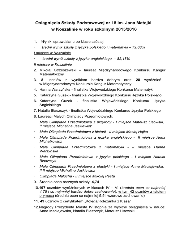 Osiągnięcia Szkoły Podstawowej nr 18 im. Jana Matejki w Koszalinie w roku szkolnym 2015/2016 1. Wyniki sprawdzianu po klasie szóstej: · średni wynik szkoły z języka polskiego i matematyki – 72,68% I miejsce w Koszalinie · średni wynik szkoły z języka angielskiego – 82,18% II miejsce w Koszalinie 2. Mikołaj Strzeszewski – laureat Międzynarodowego Konkursu Kangur Matematyczny 3. 8 uczniów z wynikiem bardzo dobrym oraz w Międzynarodowym Konkursie Kangur Matematyczny 28 wyróżnień 4. Hanna Warzyńska - finalistka Wojewódzkiego Konkursu Matematyki 5. Katarzyna Guzek - finalistka Wojewódzkiego Konkursu Języka Polskiego 6. Katarzyna Guzek Angielskiego - finalistka Wojewódzkiego Konkursu Języka 7. Natalia Błaszczyk - finalistka Wojewódzkiego Konkursu Języka Polskiego 8. Laureaci Małych Olimpiady Przedmiotowych: · Mała Olimpiada Przedmiotowa z przyrody - I miejsce Mateusz Lisowski, II miejsce Michalina Jaśkiewicz · Mała Olimpiada Przedmiotowa z historii - II miejsce Maciej Hajko · Mała Olimpiada Przedmiotowa z języka angielskiego - II miejsce Anna Michałkowicz · Mała Olimpiada Przedmiotowa z matematyki - II miejsce Hanna Warzyńska · Mała Olimpiada Przedmiotowa z języka polskiego - I miejsce Natalia Błaszczyk · Mała Olimpiada Przedmiotowa z plastyki - I miejsce Anna Maciejewska, II II miejsce Michalina Jaśkiewicz · Olimpiada Malucha - II miejsce Mikołaj Pesta 9. Średnia ocen rocznych szkoły: 4,74 10.197 uczniów wyróżnionych w klasach IV – VI (średnia ocen co najmniej 4,75 i co najmniej bardzo dobre zachowanie), w tym 43 uczniów z tytułem prymusa (średnia ocen co najmniej 5,5 i wzorowe zachowanie) 11. 49 uczniów z certyfikatem „Kolega/Koleżanka z Klasą” 12.Nagrody Prezydenta Miasta IV stopnia za wybitne osiągnięcia w nauce: Anna Maciejewska, Natalia Błaszczyk, Mateusz Lisowski 13.Realizacja Ogólnopolskiej Kampanii Społecznej „Cała Polska czyta dzieciom” 14.Udział w europejskim programie edukacyjnym e-Twinning 15.Realizacja 26 programów innowacyjnych oraz własnych nauczycieli 16.Udział w Ogólnopolskim Programie MEN „Książki naszych marzeń” 17.Udział w ogólnopolskiej akcji masowego czytania „Jak nie czytam, jak czytam” 17.Udział w ogólnopolskich akcjach charytatywnych: · „Góra Grosza” – zebranie 160 kg monet (2.185 zł) · Wielka Orkiestra Świątecznej Pomocy 18.Organizacja konkursów międzyszkolnych: · Międzyszkolny Konkurs na Grę o Koszalinie z okazji 750 – lecia miasta · Międzyszkolny Konkurs Matematyczno – Logiczny „Łamigłówkowy zawrót głowy” · Międzyszkolny Konkurs Macmillan School Tournament · Międzyszkolny Konkurs Spelling Champion · Międzyszkolny Konkurs Poezji Angielskiej · Międzyszkolny Turniej Mikołajkowy dla klas III · II edycja Międzyszkolnego Konkursu na bajkę dla dzieci i rodziców pt. „Bajki na dobranoc. Poczytaj mi mamo...Poczytaj mi tato...” · Międzyszkolny Konkurs Plastyczny „W czym papież Franciszek naśladuje Jezusa?” · Międzyszkolny Konkurs o Przysłowiach i Powiedzeniach 22.Udział w ogólnopolskich akcjach i programach prozdrowotnych: · „Światowy Dzień Serca” · program „Zdrowe nie trudne” · „Światowy Dzień Konsumenta” · program „Pięć porcji warzyw, owoców lub soku” · miejski program „Zdrowo jesz – lepiej żyjesz” · program „Śniadanie daje moc” 23.Udział w programie „Wf z Klasą” 24.Udział w ogólnopolskich akcjach, programach i konkursach ekologicznych: · Sprzątanie Świata - Polska · 13. edycja Święta Drzewa · Światowy Dzień Wody i Morza Bałtyckiego · Światowy Dzień Dobroci dla Zwierząt · Listy dla Ziemi ph. „Niska emisja” · ogólnopolski konkurs ekologiczny „Natura potrzebuje superbohaterów” 25.Współorganizacja powiatowych eliminacji Turnieju Wiedzy o BRD 26.Organizacja uroczystości wręczenia nagród laureatom wojewódzkich konkursów przedmiotowych 27.Organizacja Mistrzostw Miasta w piłce ręcznej chłopców i w piłce siatkowej dziewcząt 28.Organizacja X Międzynarodowego Turnieju Piłki Ręcznej w Mielnie 29.Organizacja wspólnie z rodzicami festynu rodzinnego „Piknik trzech pokoleń”, jesiennego kiermaszu przetworów i wypieków 30.Zbiórka surowców wtórnych – 25.948 kg makulatury 15.313 sztuk puszek, 2.408 kg nakrętek, 1.737 szt. tonerów (8. miejsce w Polsce), 102 kg baterii Sukcesy w konkursach pozaszkolnych Ogólnopolski konkurs literacki „List do taty”, Zorganizowany przez Senatora RP - Piotra Zientarskiego Wyróżnienia: Alicja Jarczewska Oliwia Harasymowicz kl. V c X ogólnopolski konkurs literacko- plastyczny „My jesteśmy radością – podróż marzeń”, zorganizowany przez ZSZ nr 3 w Słupsku Wyróżnienia z konkursu literackiego: Jagoda Stopera kl. II e Konkurs Matematyczno- Informatyczny „Młodzi Twórczy”, zorganizowany przez Gimn. Nr 11 w Koszalinie III miejsce – Oskar Kapela kl. VI b III miejsce – Natan Wojnas kl. VI c III miejsce – Mateusz Lisowski kl. VI b III miejsce – Wojciech Słomowicz kl. VI b Programowanie – jak my to widzimy , zorganizowany przez Twój Robot SML Dorota Wilczyńska- Strucka Centrum Zdolnedzieciaki.pl I miejsce – Hanna Olszewska kl. IV b Ogólnopolski konkurs „List do Ziemi”, zorganizowany przez Fundację ARKA Laureatka: Michalina Jaśkiewicz kl. VI b Drużynowe i Indywidualne Mistrzostwa szkół koszalińskich w Szachy I miejsce – zespół SP 18 (Filip Łuczak kl. IV a, Agnieszka Polakowska kl. V a, Aleksandra Załóg III e XXXIX Ogólnopolskiego Turnieju Wiedzy o Bezpieczeństwie Ruchu Drogowego, zorganizowany przez SP 18 w Koszalinie I miejsce – zespół SP 18 (Tomasz Czerepkow kl. V c, Michał Sobkowiak kl. V c, Oliwia Gołaszewska kl. V d, Natalia Błaszczyk kl. V d) Konkurs plastyczny na plakat promujący Fundację Pomocy Dzieciom MAGIA, zorganizowany przez Fundację MAGIA I miejsce – Filip Skuza kl. VI c III miejsce – Michalina Jaśkiewicz kl. VI b Rejon