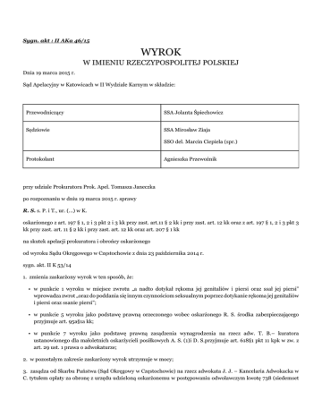 Sygn. akt : II AKa 46/15 WYROK W IMIENIU RZECZYPOSPOLITEJ POLSKIEJ Dnia 19 marca 2015 r. Sąd Apelacyjny w Katowicach w II Wydziale Karnym w składzie: Przewodniczący SSA Jolanta Śpiechowicz Sędziowie SSA Mirosław Ziaja SSO del. Marcin Ciepiela (spr.) Protokolant Agnieszka Przewoźnik przy udziale Prokuratora Prok. Apel. Tomasza Janeczka po rozpoznaniu w dniu 19 marca 2015 r. sprawy R. S. s. P. i T., ur. (...) w K. oskarżonego z art. 197 § 1, 2 i 3 pkt 2 i 3 kk przy zast. art.11 § 2 kk i przy zast. art. 12 kk oraz z art. 197 § 1, 2 i 3 pkt 3 kk przy zast. art. 11 § 2 kk i przy zast. art. 12 kk oraz art. 207 § 1 kk na skutek apelacji prokuratora i obrońcy oskarżonego od wyroku Sądu Okręgowego w Częstochowie z dnia 23 października 2014 r. sygn. akt. II K 53/14 1. zmienia zaskarżony wyrok w ten sposób, że: • w punkcie 1 wyroku w miejsce zwrotu „a nadto dotykał rękoma jej genitaliów i piersi oraz ssał jej piersi” wprowadza zwrot „oraz do poddania się innym czynnościom seksualnym poprzez dotykanie rękoma jej genitaliów i piersi oraz ssanie piersi”; • w punkcie 5 wyroku jako podstawę prawną orzeczonego wobec oskarżonego R. S. środka zabezpieczającego przyjmuje art. 95a§1a kk; • w punkcie 7 wyroku jako podstawę prawną zasądzenia wynagrodzenia na rzecz adw. T. B.– kuratora ustanowionego dla małoletnich oskarżycieli posiłkowych A. S. (1)i D. S.przyjmuje art. 618§1 pkt 11 kpk w zw. z art. 29 ust. 1 prawa o adwokaturze; 2. w pozostałym zakresie zaskarżony wyrok utrzymuje w mocy; 3. zasądza od Skarbu Państwa (Sąd Okręgowy w Częstochowie) na rzecz adwokata J. J. – Kancelaria Adwokacka w C. tytułem opłaty za obronę z urzędu udzieloną oskarżonemu w postępowaniu odwoławczym kwotę 738 (siedemset trzydzieści osiem) złotych, w tym 23% VAT, a nadto kwotę 117,01 (sto siedemnaście, jeden grosz) złotych tytułem wydatków; 4. zasądza od Skarbu Państwa (Sąd Okręgowy w Częstochowie) na rzecz adwokata T. B. – Kancelaria Adwokacka w C. kwotę 738 (siedemset trzydzieści osiem) złotych, w tym 23% VAT tytułem nieopłaconych kosztów pomocy prawnej z urzędu udzielonej oskarżycielowi posiłkowemu D. S. w postępowaniu odwoławczym; 5. zwalnia oskarżonego od ponoszenia kosztów sądowych za postępowanie odwoławcze, obciążając nimi Skarb Państwa. Sygn. akt: II AKa 46/15 UZASADNIENIE R. S. został oskarżony o to, że: I. w okresie od 1 kwietnia 2006 r. do 3 marca 2012 r. w miejscowości I., woj. (...), działając z góry powziętym zamiarem i w krótkich odstępach czasu, grożąc małoletniej córce A. S. (1)(poniżej lat 15) pozbawienia życia i zdrowia jej oraz jej matce A. S. (2)i bratu D. S., kilkadziesiąt razy doprowadził ją do obcowania płciowego poprzez wkładanie palców swoich rąk do jej pochwy i odbytu oraz do poddania się innej czynności seksualnej poprzez dotykanie rękoma jej krocza, piersi i poprzez całowanie i ssanie jej piersi, tj. o czyn z art. 197 § 1 i § 2 i § 3 pkt 2 i 3 k.k. przy zastosowaniu art. 11 § 2 k.k. i przy zastosowaniu art. 12 k.k., II. w okresie od 4 marca 2012 r. do 31 maja 2012 r. w miejscowości I., woj. (...), działając z góry powziętym zamiarem i w krótkich odstępach czasu, grożąc małoletniej córce A. S. (1)(lat 15) pozbawienia życia i zdrowia jej oraz jej matceA. S. (2)i bratu D. S., kilkukrotnie razy doprowadził ją do obcowania płciowego poprzez wkładanie palców swoich rąk do jej pochwy i odbytu oraz do poddania się innej czynności seksualnej poprzez dotykanie rękoma jej krocza, piersi i poprzez całowanie i ssanie jej piersi, tj. o czyn z art. 197 § 1 i § 2 i § 3 pkt 3 k.k. przy zastosowaniu art. 11 § 2 k.k. i przy zastosowaniu art. 12 k.k., III. w okresie od 1 stycznia 2006 r. do 1 sierpnia 2012 r. w miejscowości I., woj. (...), znęcał się psychicznie i fizycznie nad żoną A. S. (2)poprzez wszczynanie awantur domowych będąc pod wpływem alkoholu, wyzywanie słowami powszechnie uznanymi za obraźliwe, grożeniem pozbawienia życia i zdrowia oraz poprzez popychanie i szarpanie oraz w tym samym miejscu i czasie znęcał się psychicznie nad swoimi małoletnimi dziećmi A. S. (1)(lat 15) i D. S.(lat 13) poprzez wszczynanie awantur domowych, będąc pod wpływem alkoholu, wyzywanie słowami powszechnie uznanymi za obraźliwe, grożeniem pozbawienia życia i zdrowia, tj. o czyn z art. 207 § 1 k.k. Wyrokiem z dnia 6 listopada 2013 r. (sygn. akt II K 184/12) Sąd Okręgowy w Częstochowie: 1. w ramach zarzutów opisanych w punktach I i II aktu oskarżenia uznał oskarżonego R. S.za winnego tego, że w okresie od kwietnia 2006 r. do kwietnia 2012 r. w miejscowości I., woj. (...), działając z góry powziętym zamiarem i w krótkich odstępach czasu, przez nadużycie stosunku zależności, wielokrotnie doprowadził swoją małoletnią córkę A. S. (1), urodzoną w dniu (...), do obcowania płciowego poprzez wkładanie palców swoich rąk do jej pochwy i odbytu, a nadto dotykał rękoma jej genitaliów i piersi oraz ssał jej piersi, tj. za winnego przestępstwa z art. 199 § 2 k.k. w zw. z art. 200 § 1 k.k. i art. 201 k.k. przy zast. art. 11 § 2 k.k. i art. 12 k.k. i za to na mocy art. 200 § 1 k.k. skazał go na karę 3 lat i 6 miesięcy pozbawienia wolności; 2. na mocy art. 62 k.k. orzekł o wykonaniu wymierzonej oskarżonemu kary pozbawienia wolności w systemie terapeutycznym w oddziale o specjalizacji dla skazanych uzależnionych od alkoholu; 3. na mocy art. 41a § 2 k.k. w zw. z art. 43 § 1 k.k. orzekł w stosunku do oskarżonego R. S.środek karny w postaci nakazu opuszczenia lokalu zajmowanego wspólnie z pokrzywdzoną A. S. (1), położonego w I., ul. (...)– na okres lat 3; 4. na mocy art. 63 § 1 k.k. zaliczył oskarżonemu na poczet wymierzonej mu kary pozbawienia wolności okres rzeczywistego pozbawienia wolności w sprawie od dnia 13 sierpnia 2012 r. do dnia 6 listopada 2013 r.; 5. na mocy art. 29 ust. 1 Prawa o adwokaturze za