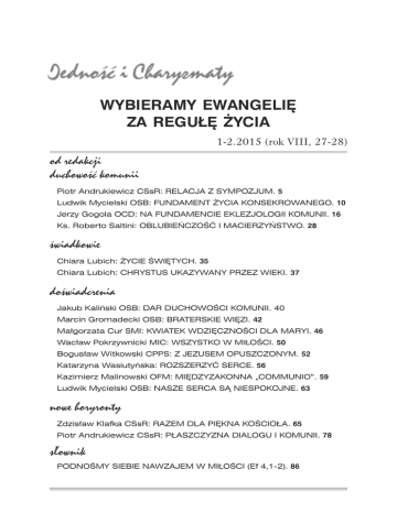 WYBIERAMY EWANGELIĘ ZA REGUŁĘ ŻYCIA 1-2.2015 (rok VIII, 27-28) od redakcji duchowość komunii Piotr Andrukiewicz CSsR: RELACJA Z SYMPOZJUM. 5 Ludwik Mycielski OSB: FUNDAMENT ŻYCIA KONSEKROWANEGO. 10 Jerzy Gogola OCD: NA FUNDAMENCIE EKLEZJOLOGII KOMUNII. 16 Ks. Roberto Saltini: OBLUBIEŃCZOŚĆ I MACIERZYŃSTWO. 28 świadkowie Chiara Lubich: ŻYCIE ŚWIĘTYCH. 35 Chiara Lubich: CHRYSTUS UKAZYWANY PRZEZ WIEKI. 37 doświadcrenia Jakub Kaliński OSB: DAR DUCHOWOŚCI KOMUNII. 40 Marcin Gromadecki OSB: BRATERSKIE WIĘZI. 42 Małgorzata Cur SMI: KWIATEK WDZIĘCZNOŚCI DLA MARYI. 46 Wacław Pokrzywnicki MIC: WSZYSTKO W MIŁOŚCI. 50 Bogusław Witkowski CPPS: Z JEZUSEM OPUSZCZONYM. 52 Katarzyna Wasiutyńska: ROZSZERZYĆ SERCE. 56 Kazimierz Malinowski OFM: MIĘDZYZAKONNA „COMMUNIO”. 59 Ludwik Mycielski OSB: NASZE SERCA SĄ NIESPOKOJNE. 63 nowe horyronty Zdzisław Klafka CSsR: RAZEM DLA PIĘKNA KOŚCIOŁA. 65 Piotr Andrukiewicz CSsR: PŁASZCZYZNA DIALOGU I KOMUNII. 78 słownik PODNOŚMY SIEBIE NAWZAJEM W MIŁOŚCI (Ef 4,1-2). 86 od redakcji „Dobro pragnie zawsze się udzielać. Wszelkie autentyczne doświadczenie prawdy i piękna dąży samo z siebie do swej ekspansji, a każda osoba, przeżywająca głębokie wyzwolenie, zyskuje większą wrażliwość wobec potrzeb innych ludzi. Dzielenie się dobrem sprawia, że ono się umacnia i rozwija” – pisał ojciec święty Franciszek w Adhortacji Apostolskiej Evangelii Gaudium. To właśnie głębokie przekonanie, że poznanego i otrzymanego bogactwa nie można zatrzymać tylko dla siebie, ale należy nim się podzielić, leżało u podstaw założenia kwartalnika Jedność i Charyzmaty. Jest on wyrazem życia komunią charyzmatów, których reprezentanci – pod wpływem nadprzyrodzonych inspiracji, płynących z duchowości przekazanej przez Chiarę Lubich i Ruch Focolari oraz poprzez wzajemną otwartość, wymianę darów i współpracę – doświadczyli owoców komunii, której aktualność przepowiada współczesne nauczanie Kościoła. Na obecny numer naszego kwartalnika składają się wypowiedzi uczestników Sympozjum naukowego pod hasłem Młodzi wybierają Ewangelię za regułę życia. Życie konsekrowane po Soborze Watykańskim II, które odbyło się 22 maja ubiegłego roku. Jego organizatorami byli zakonnicy Dzieła Maryi i profesorowie Katedry Duchowości Uniwersytetu Papieskiego Jana Pawła II. Ich zamiarem było podzielenie się z młodym pokoleniem osób konsekrowanych doświadczeniem życia duchowością komunii i jedności w sytuacji zbliżającej się pięćdziesiątej rocznicy ogłoszenia dokumentu II Soboru Watykańskiego Perfectae caritatis oraz zbliżającego się Roku Życia Konsekrowanego ‘2015. Rozpoczynamy od relacji z tego wydarzenia w opracowaniu o. Piotra Andrukiewicza CSsR. Pozwoli ona poznać kontekst tego spotkania. Następnie zamieszczamy referaty: „Perfectae caritatis”. Nowe przykazanie fundamentem życia konsekrowanego (o. Ludwik Mycielski OSB), Życie konsekrowane na fundamencie posoborowej eklezjologii komunii (o. Jerzy W. Gogola OCD) oraz Oblubieńczość i macierzyństwo, kluczem do wspólnoty konsekrowanych. Aspekt maryjny życia konsekrowanego (ks. Roberto Saltini, fokolarino). Podczas Sympozjum referaty te uzupełniały świadectwa, które przedstawimy nieco później, w dziale – właśnie – Świadectwa. W ramach stałej rubryki Świadkowie publikujemy dwa teksty Chiary Lubich, które wprawdzie nie były wygłoszone w czasie Sympozjum, ale stanowią inspirujące tło i ilustrację całego wydarzenia. W rubryce Nowe horyzonty zamieszczamy referaty o. Zdzisława Klafki CSsR – Konsekrowani razem dla pięknego oblicza Kościoła – oraz o. Piotra Andrukiewicza CSsR – „Jedność i charyzmaty”: płaszczyzna dialogu i komunii między charyzmatami. Na końcu, w Słowniku, Czytelnik znajdzie ten sam artykuł, co w numerze poprzednim: Podnośmy siebie nawzajem w miłości (Ef 4,1-2), gdyż wkradł się tam chochlik drukarski i zabrakło kilku ważnych zdań. 2 1-2.2015 (rok VIII, 27-28) – to nieustanne działanie Ducha Świętego, który w ciągu wieków pomnaża bogactwa płynące z praktyki rad ewangelicznych poprzez liczne charyzmaty. I w ten sposób sprawia, że – w Kościele i w świecie, w czasie i w przestrzeni – nieustannie jest obecne misterium Chrystusa VC 5. Ten łączony numer Jedności i Charyzmatów (1-2.2015) ukazuje się w pierwszych miesiącach Roku Życia Konsekrowanego. Jest owocem pracy kilkudziesięciu osób różnych stanów i przeróżnych zawodów. Połączyła ich miłość do Jezusa, który się objawia w fenomenie życia osób Bogu konsekrowanych zarówno w zakonach, jak i w innych wspólnotach apostolskich. Za tę ofiarną pracę wszystkim wyrażamy naszą wdzięczność. Redakcja duchowość komunii RELACJA Z KRAKOWSKIEGO SYMPOZJUM Tekst: Piotr Andrukiewicz CSsR W dniu 22 maja 2014 r., w gmachu Uniwersytetu Papieskiego Jana Pawła II w Krakowie, odbywało się Sympozjum zatytułowane „Młodzi wybierają Ewangelię za regułę życia”. Było ono poświęcone refleksji nad istotą odnowy życia konsekrowanego po Soborze Watykańskim II. Autor przedstawia tło, pierwotną ideę oraz specyfikę tej inicjatywy. Pomysł zorganizowania sympozjum przed nadchodzącym „Rokiem Życia Konsekrowanego”narodził się w kontekście międzynarodowych spotkań zakonników Ruchu Focolari, podczas których powstawała idea międzynarodowego kongresu młodych zakonników Dzieła Maryi, czyli kongresu „Gen-re” (Nowej Generacji Zakonników). W trakcie kształtowania się tego pomysłu, konsultowanego w gronie zakonników reprezentujących różne kraje i zgromadzenia, uznano za stosowne nie organizować jednego dużego spotkania w Castelgandolfo – jak przed kilku laty – ale wiele spotkań krajowych, różnego rodzaju, stosownie do lokalnych możliwości i potrzeb. Poszczególne zatem regiony i państwa zobowiązały się przygotować spotkania przeznaczone 