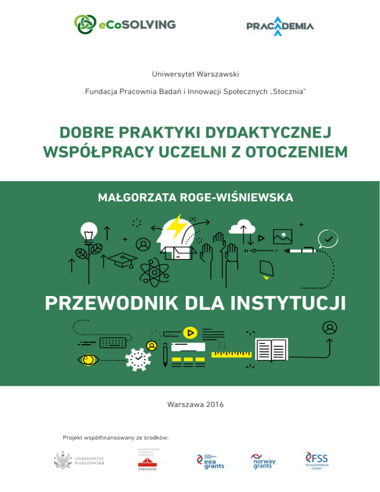 Uniwersytet Warszawski Fundacja Pracownia Badań i Innowacji Społecznych „Stocznia” DOBRE PRAKTYKI DYDAKTYCZNEJ WSPÓŁPRACY UCZELNI Z OTOCZENIEM tlo plakat_zie_01.pdf 1 2016-06-27 12:24:41 MAŁGORZATA ROGE-WIŚNIEWSKA PRZEWODNIK DLA INSTYTUCJI Warszawa 2016 Projekt współfinansowany ze środków: Uniwersytet Warszawski Fundacja Pracownia Badań i Innowacji Społecznych „Stocznia” DOBRE PRAKTYKI DYDAKTYCZNEJ WSPÓŁPRACY UCZELNI Z OTOCZENIEM 1 2016-06-13 13:04:05 MAŁGORZATA ROGE-WIŚNIEWSKA PRZEWODNIK DLA INSTYTUCJI Warszawa 2016 Projekt współfinansowany ze środków: Recenzenci: Jowita Bukowińska, Stowarzyszenie Professional Women’s Network, Warszawa Magdalena Czubaszek, PwC dr Grzegorz Krzyśko, Uniwersytet im. Adama Mickiewicza w Poznaniu, Wydział Chemii dr Ewa Kukuła, Uniwersytet Rzeszowski, Wydział Biologiczno-Rolniczy prof. dr hab. Elżbieta Lonc, Uniwersytet Wrocławski, Wydział Nauk Biologicznych Renata Łukaszewicz, koncern branży chemicznej Katarzyna Pąk, Ericsson Sp. z o.o. Aleksandra Politańska-Kunicka, adwokat (tylko załącznik 3.) Magdalena Rybak, nauczycielka prof. dr hab. Barbara Szulczewska, Szkoła Główna Gospodarstwa Wiejskiego w Warszawie, Wydział Ogrodnictwa, Biotechnologii i Architektury Krajobrazu Anna Urbanowicz, adwokat Wydawca: Wydział Geografii i Studiów Regionalnych UW ul. Krakowskie Przedmieście 30, 00-927 Warszawa © Copyright by: Wydział Geografii i Studiów Regionalnych UW Skład i druk: Empestudio www.empestudio.com ISBN 978-83-63245-34-4 Projekt eCo-Solving (numer umowy FSS/2014/HEI/W/0127/U/0037), obejmujący m.in. publikację i konferencję, współfinansowany ze środków funduszy norweskich i krajowych. Project eCo-Solving (FSS/2014/HEI/W/0127/U/0037) publication and conference supported by a grant from Norway through the Norway Grants and co-financed by the Polish funds. 3 Spis treści Słownik......................................................................................................................... 6 Skróty i akronimy........................................................................................................ 6 1.Wstęp..................................................................................................................... 7 2. Warianty współpracy dydaktycznej instytucji z uczelniami............................ 10 Łączenie wiedzy z praktyką w procesie dydaktycznym.....................................10 Poziomy i kierunki kształcenia............................................................................ 10 Prace zaliczeniowe ............................................................................................... 10 Prace dyplomowe................................................................................................... 10 Konwent lub rada interesariuszy........................................................................ 11 Wspólny program studiów.................................................................................... 12 Główni uczestnicy dydaktycznej współpracy instytucji z uczelniami...............12 Studenci i opiekun.................................................................................................. 12 Instytucje................................................................................................................. 13 Przedmiot pracy aplikacyjnej................................................................................13 Czynnik kluczowy: przydatność dla instytucji lub społeczeństwa............... 13 Element standardowych działań instytucji....................................................... 14 Problematyka ważna dla instytucji, ale niezbyt pilna..................................... 14 Formy współpracy..................................................................................................16 Otrzymanie gotowej pracy.................................................................................... 16 Współpraca luźna................................................................................................... 17 Ścisła współpraca.................................................................................................. 17 Praca zlecona.......................................................................................................... 18 Wspólny innowacyjny projekt.............................................................................. 19 Sposób sformalizowania współpracy z uczelnią................................................19 Modele przebiegu współpracy przy aplikacyjnej pracy dyplomowej...............20 Standardowy proces powstawania pracy dyplomowej ................................. 20 Scenariusz „Świat Niezależnych Geeków”........................................................ 20 Scenariusz „Świat Dużych Graczy Współpracujących z Uczelnią”............... 22 4 Scenariusz „Świat Małych i Średnich Graczy Współpracujących z Uczelnią”...23 Scenariusz „Świat Naukowych Brokerów”........................................................ 25 3. Korzyści ze współpracy badawczej z uczelnią................................................. 28 Korzyści dla instytucji............................................................................................28 Rozwój instytucji i podnoszenie kompetencji zawodowych jej kadry ......... 28 Przyciąganie zdolnych studentów...................................................................... 28 Wzmocnienie wizerunku....................................................................................... 28 Wsparcie finansowe............................................................................................... 29 Korzyści dla studentów.........................................................................................29 Korzyści dla uczelni i akademików......................................................................29 4. Wyzwania dla instytucji 