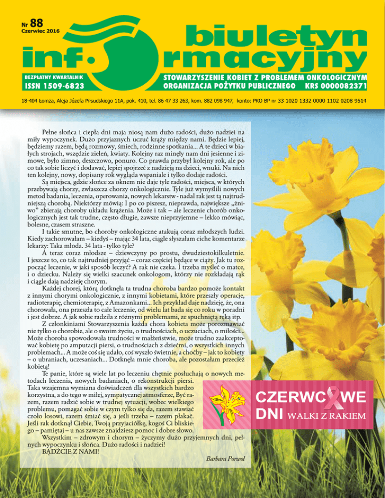 Nr 88 Czerwiec 2016 18-404 Łomża, Aleja Józefa Piłsudskiego 11A, pok. 410, tel. 86 47 33 263, kom. 882 098 947, konto: PKO BP nr 33 1020 1332 0000 1102 0208 9514 Pełne słońca i ciepła dni maja niosą nam dużo radości, dużo nadziei na miły wypoczynek. Dużo przyjaznych uczuć krąży między nami. Będzie lepiej, będziemy razem, będą rozmowy, śmiech, rodzinne spotkania... A te dzieci w białych strojach, wszędzie zieleń, kwiaty. Kolejny raz minęły nam dni jesienne i zimowe, było zimno, deszczowo, ponuro. Co prawda przybył kolejny rok, ale po co tak sobie liczyć i dodawać, lepiej spojrzeć z nadzieją na dzieci, wnuki. Na nich ten kolejny, nowy, dopisany rok wygląda wspaniale i tylko dodaje radości. Są miejsca, gdzie słońce za oknem nie daje tyle radości, miejsca, w których przebywają chorzy, zwłaszcza chorzy onkologicznie. Tyle już wymyślili nowych metod badania, leczenia, operowania, nowych lekarstw - nadal rak jest tą najtrudniejszą chorobą. Niektórzy mówią: I po co piszesz, nieprawda, największe „żniwo” zbierają choroby układu krążenia. Może i tak – ale leczenie chorób onkologicznych jest tak trudne, często długie, zawsze nieprzyjemne – lekko mówiąc, bolesne, czasem straszne. I takie smutne, bo choroby onkologiczne atakują coraz młodszych ludzi. Kiedy zachorowałam – kiedyś – mając 34 lata, ciągle słyszałam ciche komentarze lekarzy: Taka młoda. 34 lata - tylko tyle? A teraz coraz młodsze – dziewczyny po prostu, dwudziestokilkuletnie. I jeszcze to, co tak najtrudniej przyjąć – coraz częściej będące w ciąży. Jak tu rozpocząć leczenie, w jaki sposób leczyć? A rak nie czeka. I trzeba myśleć o matce, i o dziecku. Należy się wielki szacunek onkologom, którzy nie rozkładają rąk i ciągle dają nadzieję chorym. Każdej chorej, którą dotknęła ta trudna choroba bardzo pomoże kontakt z innymi chorymi onkologicznie, z innymi kobietami, które przeszły operacje, radioterapię, chemioterapię, z Amazonkami... Ich przykład daje nadzieję, że, ona chorowała, ona przeszła to całe leczenie, od wielu lat bada się co roku w poradni i jest dobrze. A jak sobie radziła z różnymi problemami, ze spuchniętą ręką itp. Z członkiniami Stowarzyszenia każda chora kobieta może porozmawiać nie tylko o chorobie, ale o swoim życiu, o trudnościach, o uczuciach, o miłości... Może choroba spowodowała trudności w małżeństwie, może trudno zaakceptować kobietę po amputacji piersi, o trudnościach z dziećmi, o wszystkich innych problemach... A może coś się udało, coś wyszło świetnie, a choćby – jak to kobiety – o ubraniach, uczesaniach... Dotknęła mnie choroba, ale pozostałam przecież kobietą! Te panie, które są wiele lat po leczeniu chętnie posłuchają o nowych metodach leczenia, nowych badaniach, o rekonstrukcji piersi. Taka wzajemna wymiana doświadczeń dla wszystkich bardzo korzystna, a do tego w miłej, sympatycznej atmosferze, Być razem, razem radzić sobie w trudnej sytuacji, wobec wielkiego problemu, pomagać sobie w czym tylko się da, razem stawiać czoło losowi, razem śmiać się, a jeśli trzeba – razem płakać. Jeśli rak dotknął Ciebie, Twoją przyjaciółkę, kogoś Ci bliskiego – pamiętaj – u nas zawsze znajdziesz pomoc i dobre słowo. Wszystkim – zdrowym i chorym – życzymy dużo przyjemnych dni, pełnych wypoczynku i słońca. Dużo radości i nadziei! BĄDŹCIE Z NAMI! Barbara Porwoł | ludzie sĄ z nami | Nowości w chirurgii rekonstrukcyjnej u pacjentek leczonych z powodu raka piersi Dr n. med. Sławomir Mazur z Kliniki Nowotworów Piersi i Chirurgii Rekonstrukcyjnej Centrum Onkologii Instytutu im. Marii Skłodowskiej-Curie w Warszawie, jako pierwszy wprowadził do tej placówki w celach terapeutycznych autologiczne tłuszczowe komórki macierzyste w celu regeneracji tkanek i rekonstrukcji piersi. Od 25 lat współpracuje z Amazonkami. Bezpośrednio związany jest ze Stowarzyszeniem “Amazonki” Warszawa-Centrum. Jak podkreśla dr Mazur rola chirurgii rekonstrukcyjnej i plastycznej w leczeniu chirurgicznym raka piersi wzrasta. Z jednej strony wynika to z rozwoju technik odtwórczych, co pozwala na osiąganie zdecydowanie lepszych rezultatów niż przed laty. Z drugiej strony wiąże się z rosnącymi oczekiwaniami pacjentek co do ostatecznego wyniku estetycznego, a co za tym idzie podniesienia jakości życia. Rekonstrukcja natychmiastowa, rekonstrukcja odroczona Operacje rekonstrukcyjne można wykonywać w trybie natychmiastowym lub w trybie odroczonym. Rekonstrukcja natychmiastowa jest możliwa u chorych na raka piersi, jeżeli są spełnione następujące warunki: • pacjentka wykazuje silną motywację do rekonstrukcji piersi, • wyjściowy stopień zaawansowania raka piersi to T1-2N0M0, kiedy chora z różnych względów nie może być operowana oszczędzająco i jest poddawana amputacji piersi, • u pacjentki nie przewiduje się zastosowania radioterapii pooperacyjnej. Rekonstrukcję odroczoną powinno się wykonywać po 6 miesiącach od zakończenia leczenia uzupełniającego tj. chemioterapii i nie wcześniej niż rok od zakończonej radioterapii. 2 Rekonstrukcja z wykorzystaniem implantów Zasadniczo operacje rekonstrukcyjne piersi możemy podzielić na dwie grupy. W pierwszej, w celu rekonstrukcji wykorzystujemy implanty, a w drugiej – tkanki własne. Rekonstrukcja z użyciem wszczepów polega na wstępnym rozprężeniu tkanek poprzez wszczepienie ekspandera wypełnianego stopniowo solą fizjologiczną. Po uzyskaniu odpowiedniego rozciągnięcia tkanek ekspander jest usuwany, a w jego miejsce jest wszczepiana właściwa proteza wypełniona żelem silikonowym. Nową jakością pozwalającą na skrócenie rekonstrukcji piersi do jednego etapu jest zastosowanie tzw. ekspanderoprotezy. Łączy ona w sobie właściwości zarówno ekspandera, jak i ostatecznej protezy. Po zakończeniu rozprężania taki wszczep pozostaje na