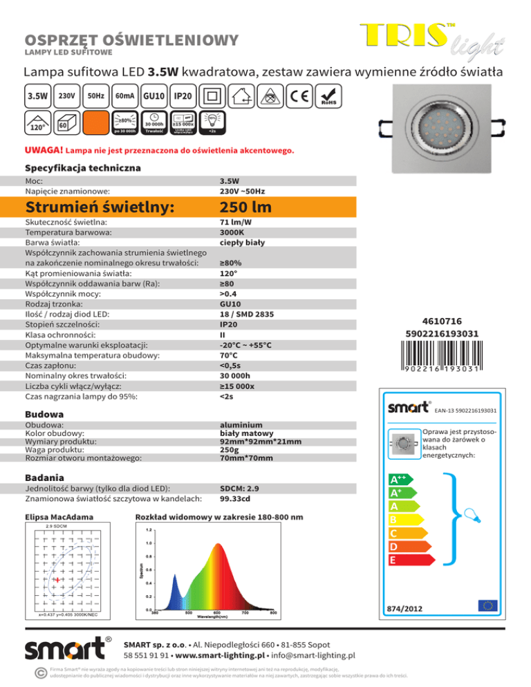 OSPRZĘT OŚWIETLENIOWY LAMPY LED SUFITOWE ™ TRIS light Lampa sufitowa LED 3.5W kwadratowa, zestaw zawiera wymienne źródło światła 3.5W 120° 230V 50Hz GU10 IP20 60mA 95% ≥80% 60 po 30 000h 30 000h ≥15 000x Trwałość Liczba cykli włącz/wyłącz <2s UWAGA! Lampa nie jest przeznaczona do oświetlenia akcentowego. Specyfikacja techniczna Moc: Napięcie znamionowe: 3.5W 230V ~50Hz Strumień świetlny: 250 lm Skuteczność świetlna: Temperatura barwowa: Barwa światła: Współczynnik zachowania strumienia świetlnego na zakończenie nominalnego okresu trwałości: Kąt promieniowania światła: Współczynnik oddawania barw (Ra): Współczynnik mocy: Rodzaj trzonka: Ilość / rodzaj diod LED: Stopień szczelności: Klasa ochronności: Optymalne warunki eksploatacji: Maksymalna temperatura obudowy: Czas zapłonu: Nominalny okres trwałości: Liczba cykli włącz/wyłącz: Czas nagrzania lampy do 95%: 71 lm/W 3000K ciepły biały ≥80% 120° ≥80 >0.4 GU10 18 / SMD 2835 IP20 II -20°C ~ +55°C 70°C <0,5s 30 000h ≥15 000x <2s 4610716 5902216193031 902216 193031 ® EAN-13 5902216193031 Budowa Obudowa: Kolor obudowy: Wymiary produktu: Waga produktu: Rozmiar otworu montażowego: aluminium biały matowy 92mm*92mm*21mm 250g 70mm*70mm Badania Jednolitość barwy (tylko dla diod LED): Znamionowa światłość szczytowa w kandelach: Elipsa MacAdama SDCM: 2.9 99.33cd Rozkład widomowy w zakresie 180-800 nm Oprawa jest przystosowana do żarówek o klasach energetycznych: A⁺⁺ A⁺ A B C D E 874/2012 ® SMART sp. z o.o. • Al. Niepodległości 660 • 81-855 Sopot 58 551 91 91 • www.smart-lighting.pl • [email protected] Firma Smart® nie wyraża zgody na kopiowanie treści lub stron niniejszej witryny internetowej ani też na reprodukcję, modyfikację, udostępnianie do publicznej wiadomości i dystrybucji oraz inne wykorzystywanie materiałów na niej zawartych, zastrzegając sobie wszystkie prawa do ich treści.